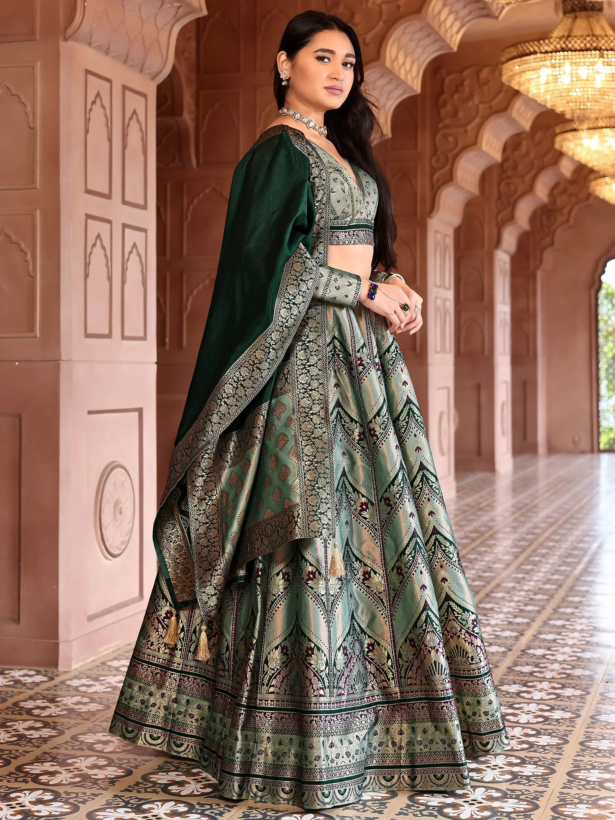 Make a bold and graceful statement in the Aayat Olive Green Banarasi Silk Lehenga Set. Crafted with intricate zari motifs in maroon and gold, this lehenga radiates traditional opulence. The full-flare skirt and deep V-neck blouse exude regal flair, while the dark green brocade dupatta with woven detailing enhances the elegance. A perfect pick for weddings, receptions, and festive soirées.