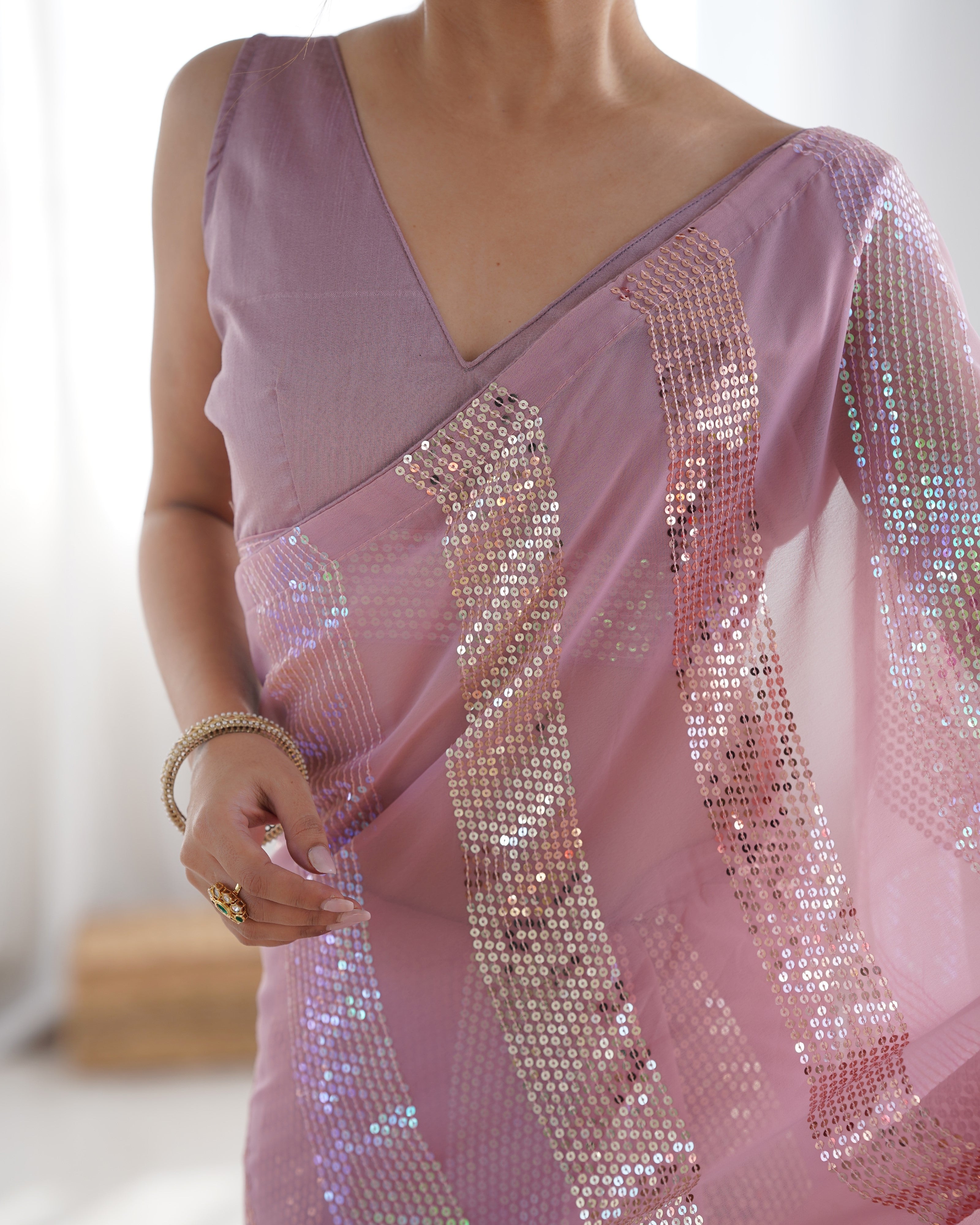 Step into elegance with our onion pink sequin saree, crafted for the woman who loves pastels with a touch of glam. Designed with delicate shimmer work on a soft net base, this saree is perfect for daytime festivities and evening receptions alike.