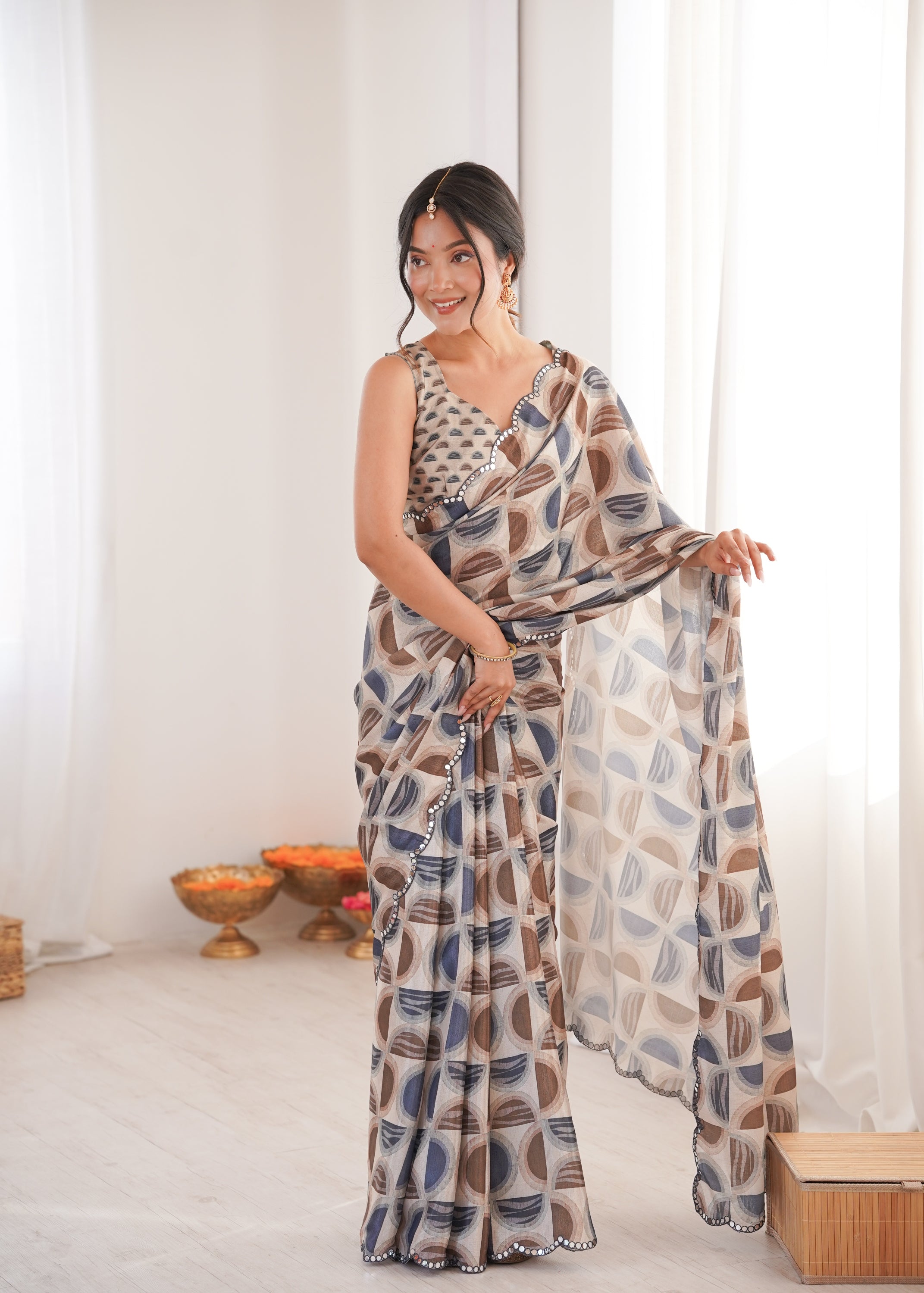 Elevate your ethnic wardrobe with this elegant Beige printed saree, designed to blend tradition with effortless grace. Crafted from a lightweight, flowy fabric, this saree features an all-over pattern in warm hues, beautifully complemented by a subtle sequin-embellished border. Perfect for festive occasions, daytime celebrations, weddings, or intimate gatherings, it drapes gracefully and offers all-day comfort with timeless appeal. Style it with statement earrings and a matching blouse to complete the look.