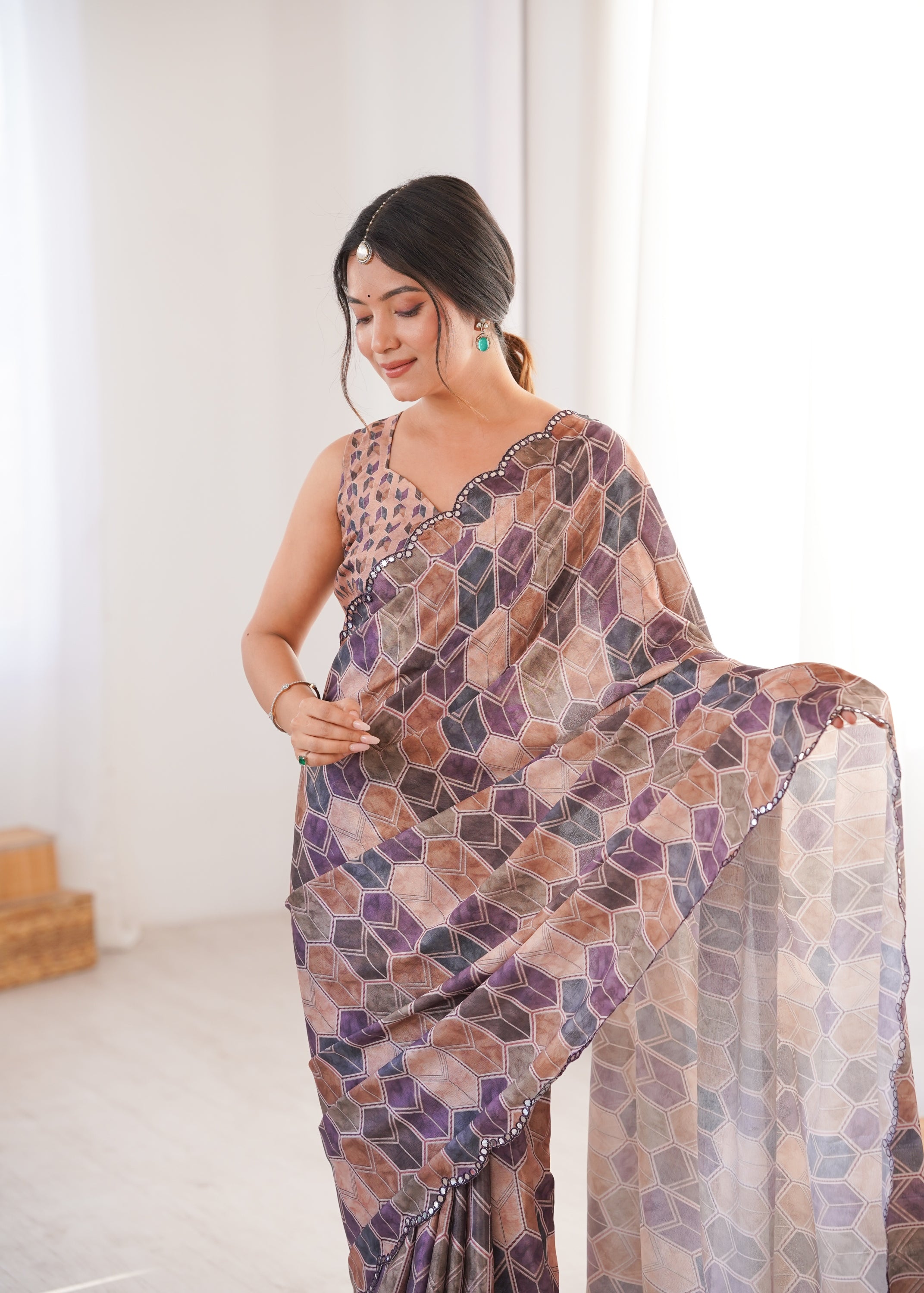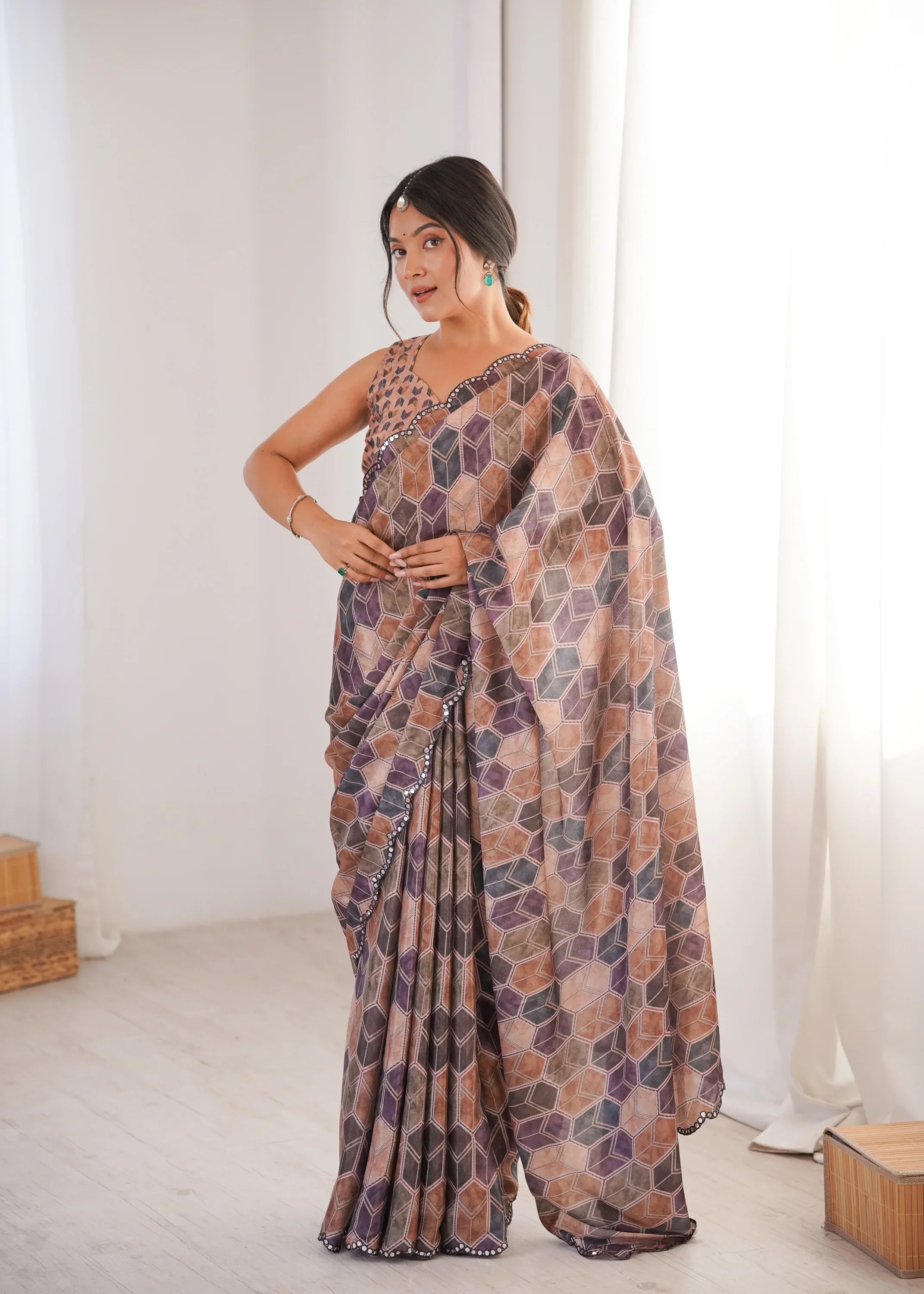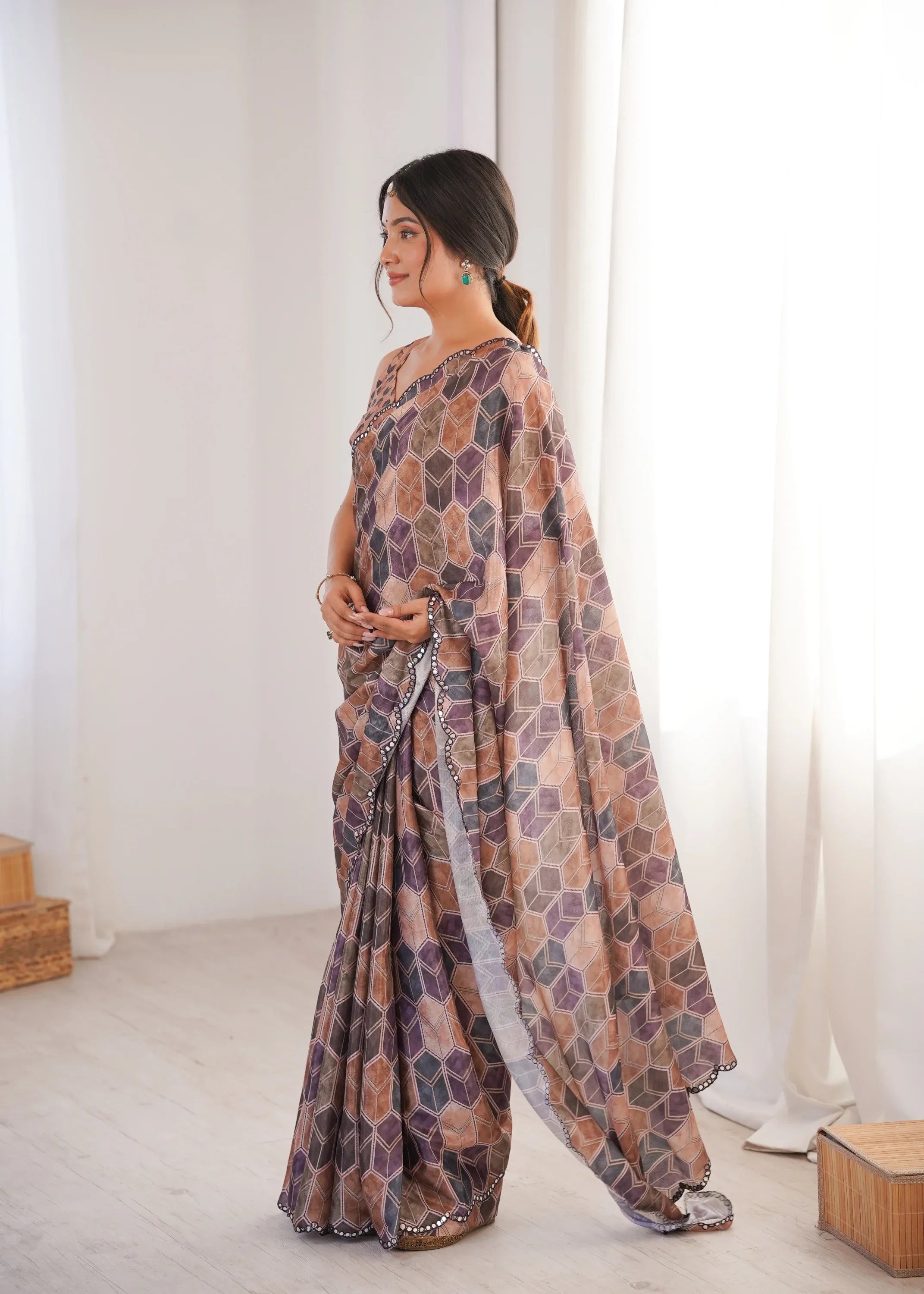 Elevate your ethnic wardrobe with this elegant Beige printed saree, designed to blend tradition with effortless grace. Crafted from a lightweight, flowy fabric, this saree features an all-over pattern in warm hues, beautifully complemented by a subtle sequin-embellished border. Perfect for festive occasions, daytime celebrations, weddings, or intimate gatherings, it drapes gracefully and offers all-day comfort with timeless appeal. Style it with statement earrings and a matching blouse to complete the look.