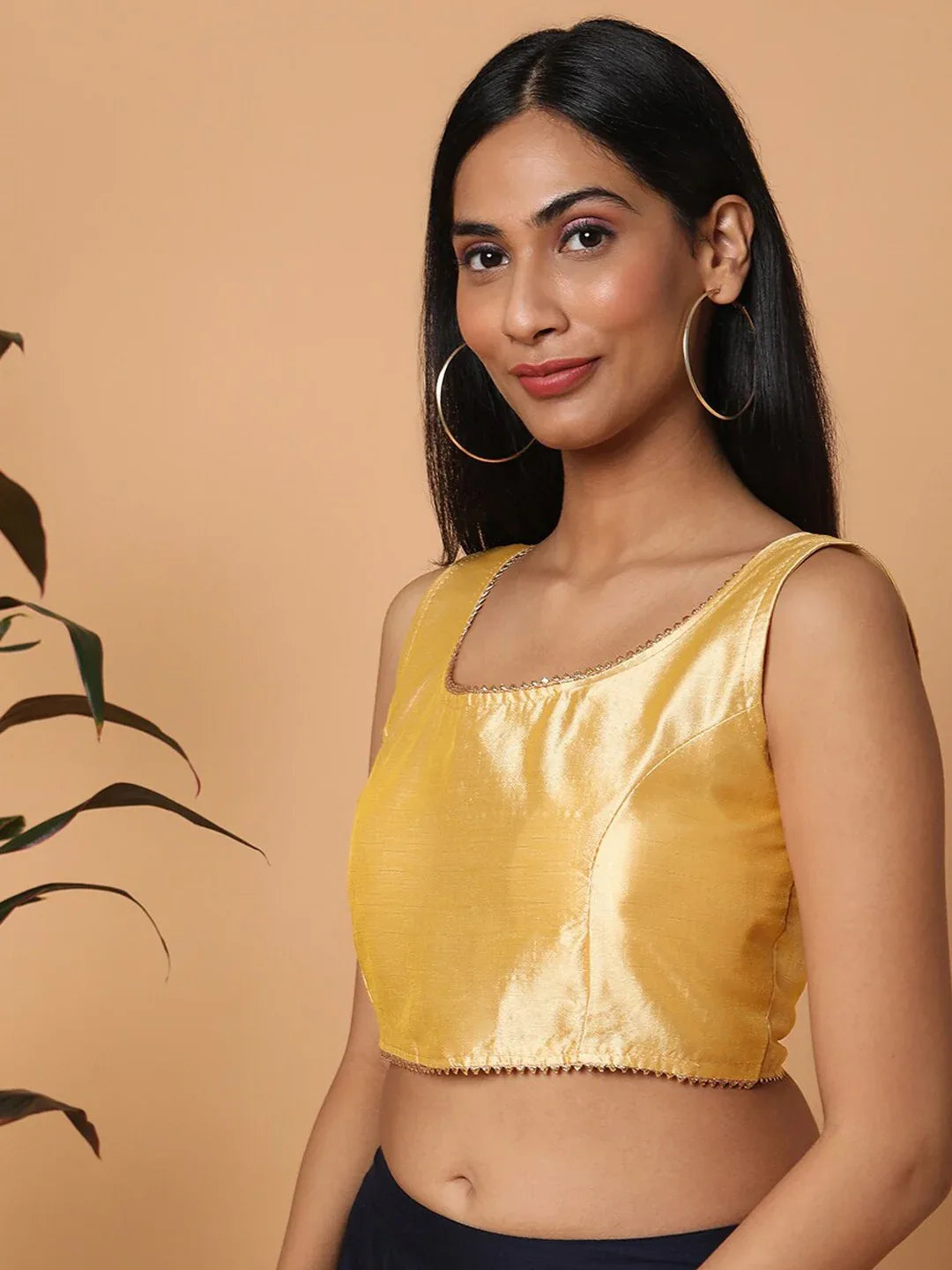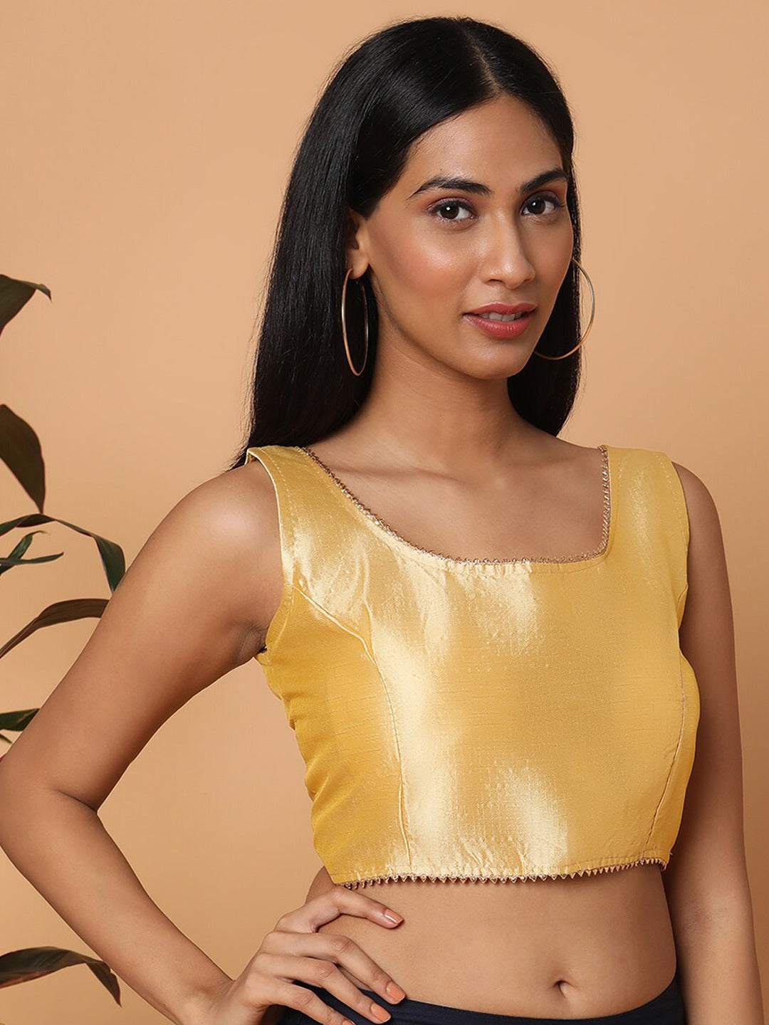 Make a bold style statement with this elegant Beige readymade blouse. Featuring a flattering square neckline and delicate silver lace trim, this sleeveless blouse is the perfect choice to pair with sarees or lehengas for weddings, festive occasions, and special gatherings.