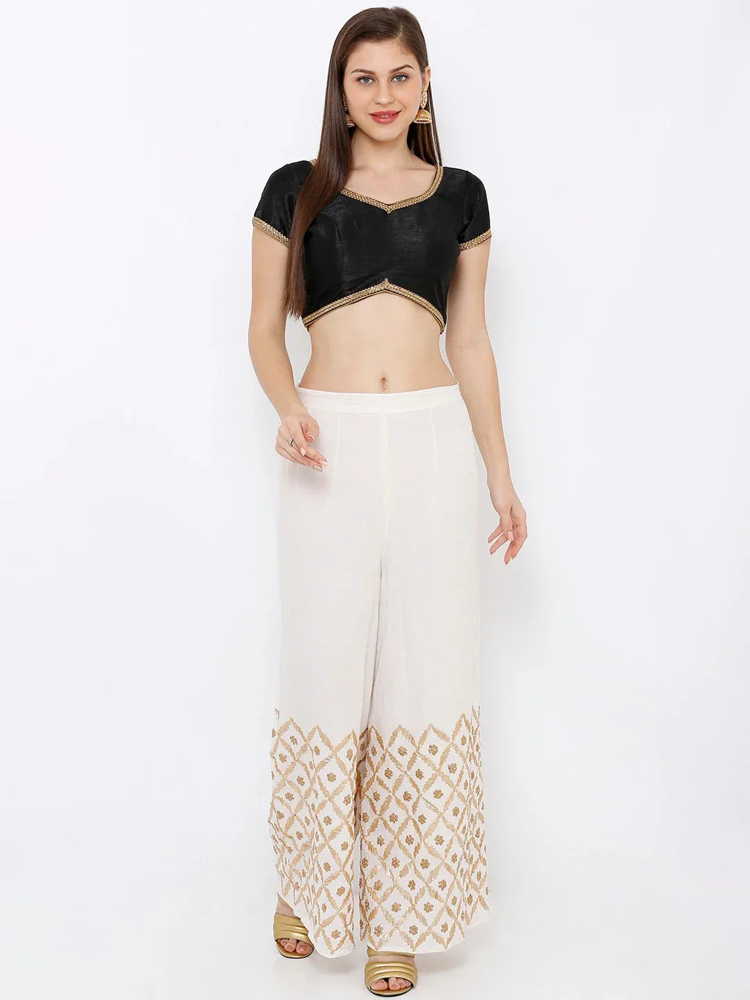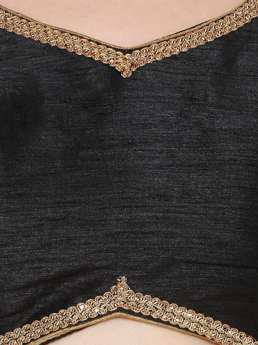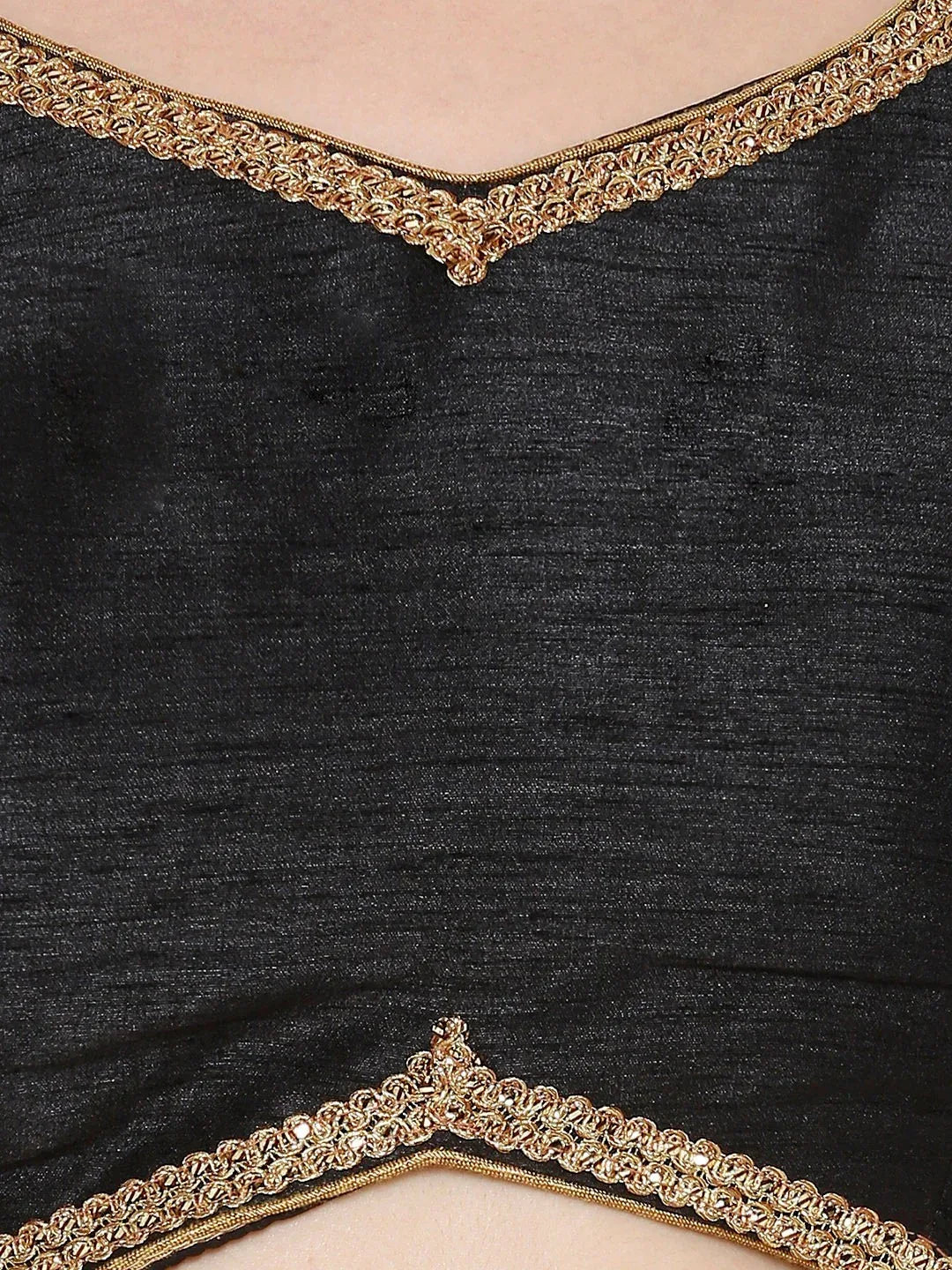 Elevate your ethnic look with this elegant black blouse finished with delicate gold edging. The soft, lightly lustrous fabric and flattering V-neckline pair beautifully with sarees and lehengas for weddings, receptions, and festive occasions.