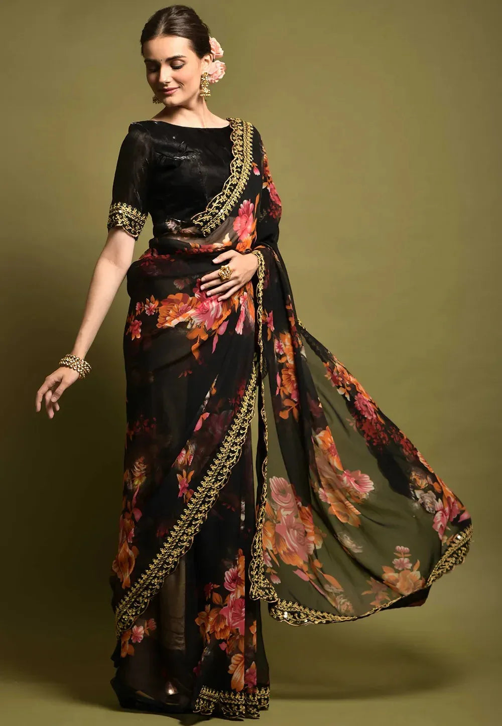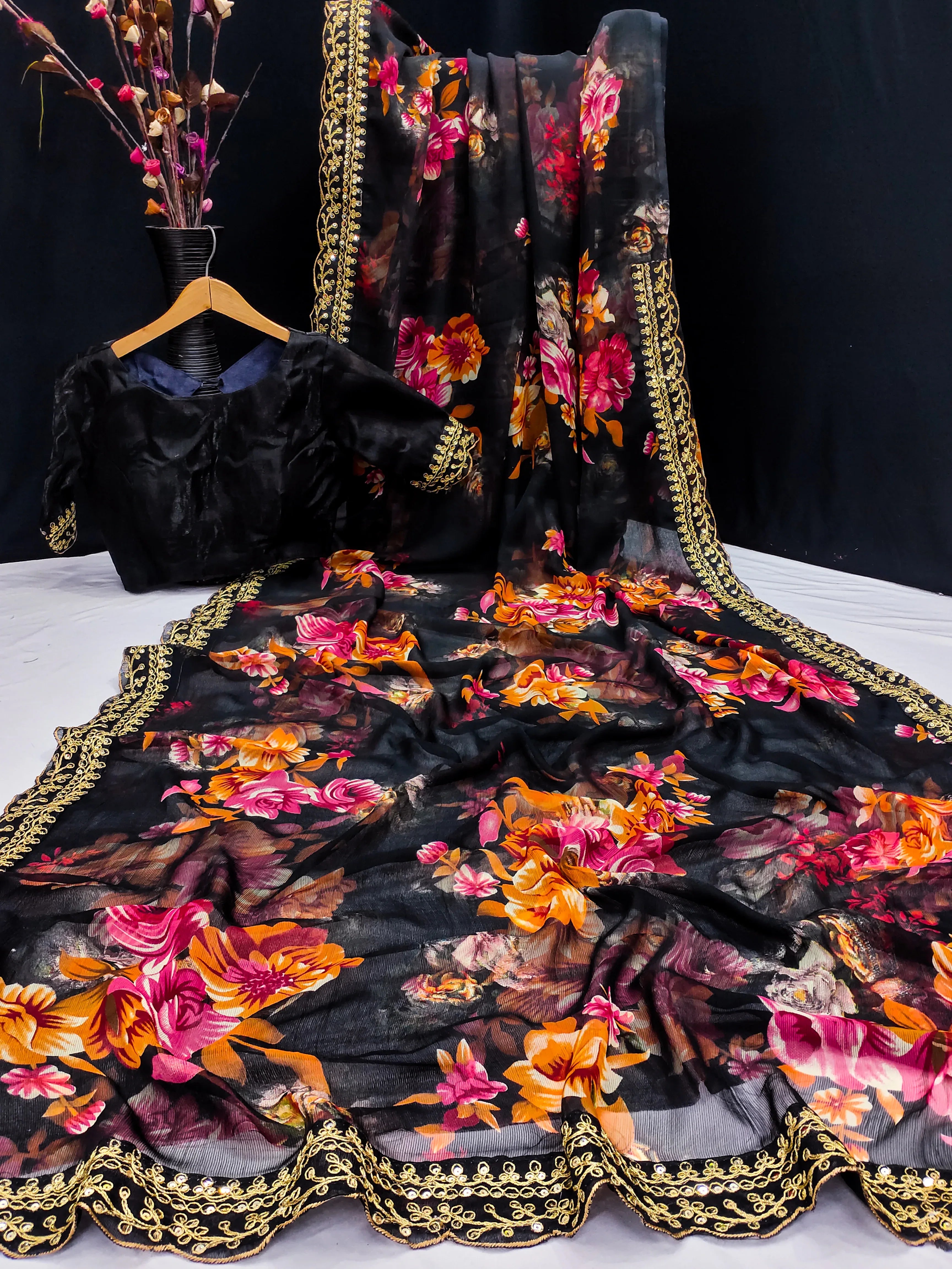 Step into timeless elegance with this black floral georgette saree, featuring a stunning array of vibrant blossoms and a richly embroidered golden border. This saree offers the perfect blend of tradition and modern finesse for any festive or formal occasion.