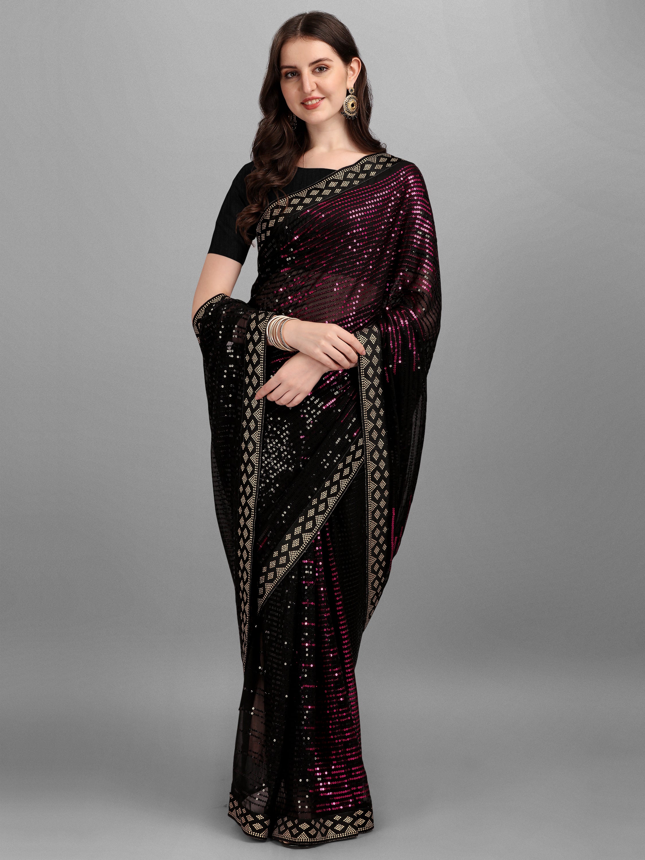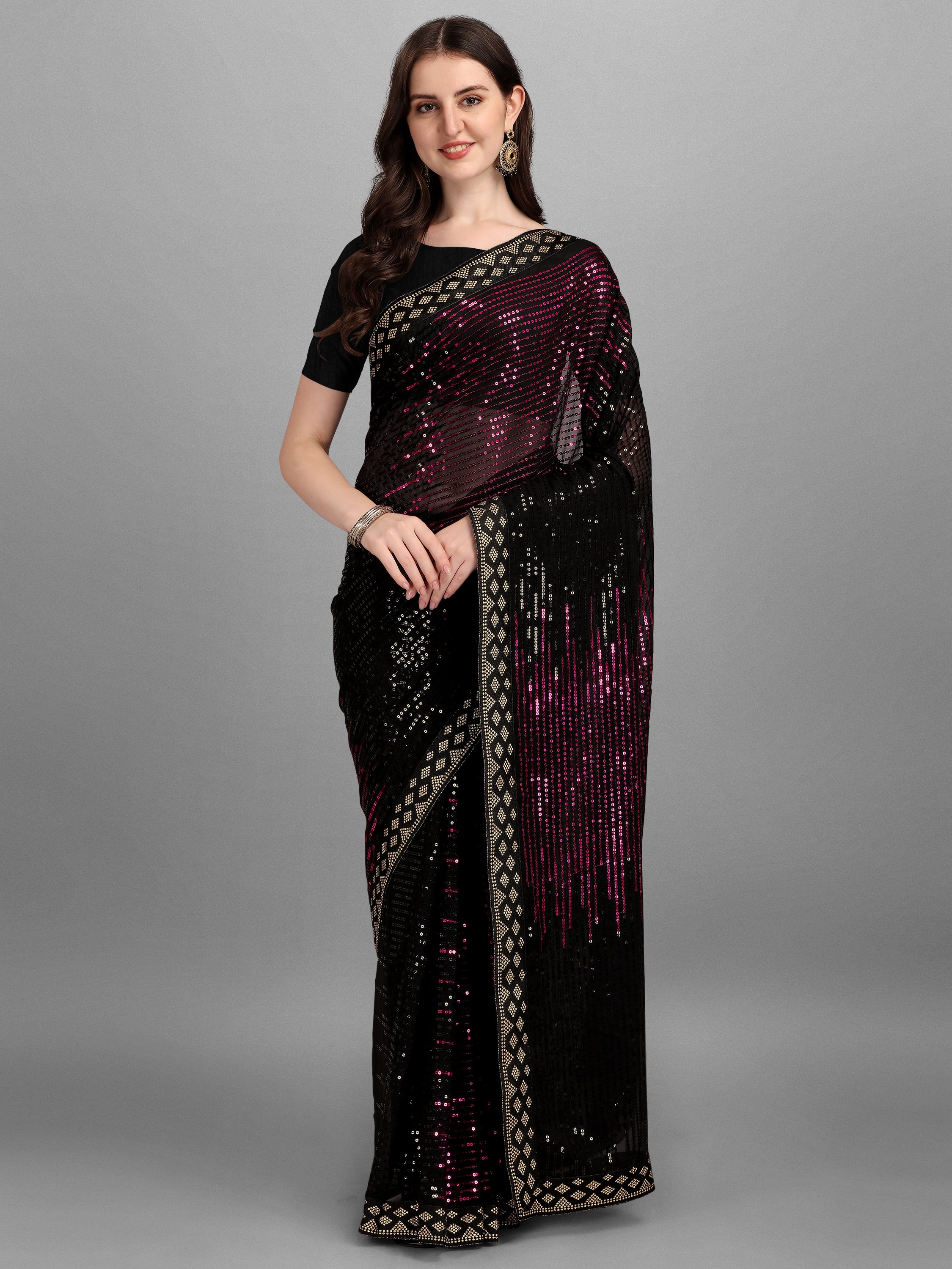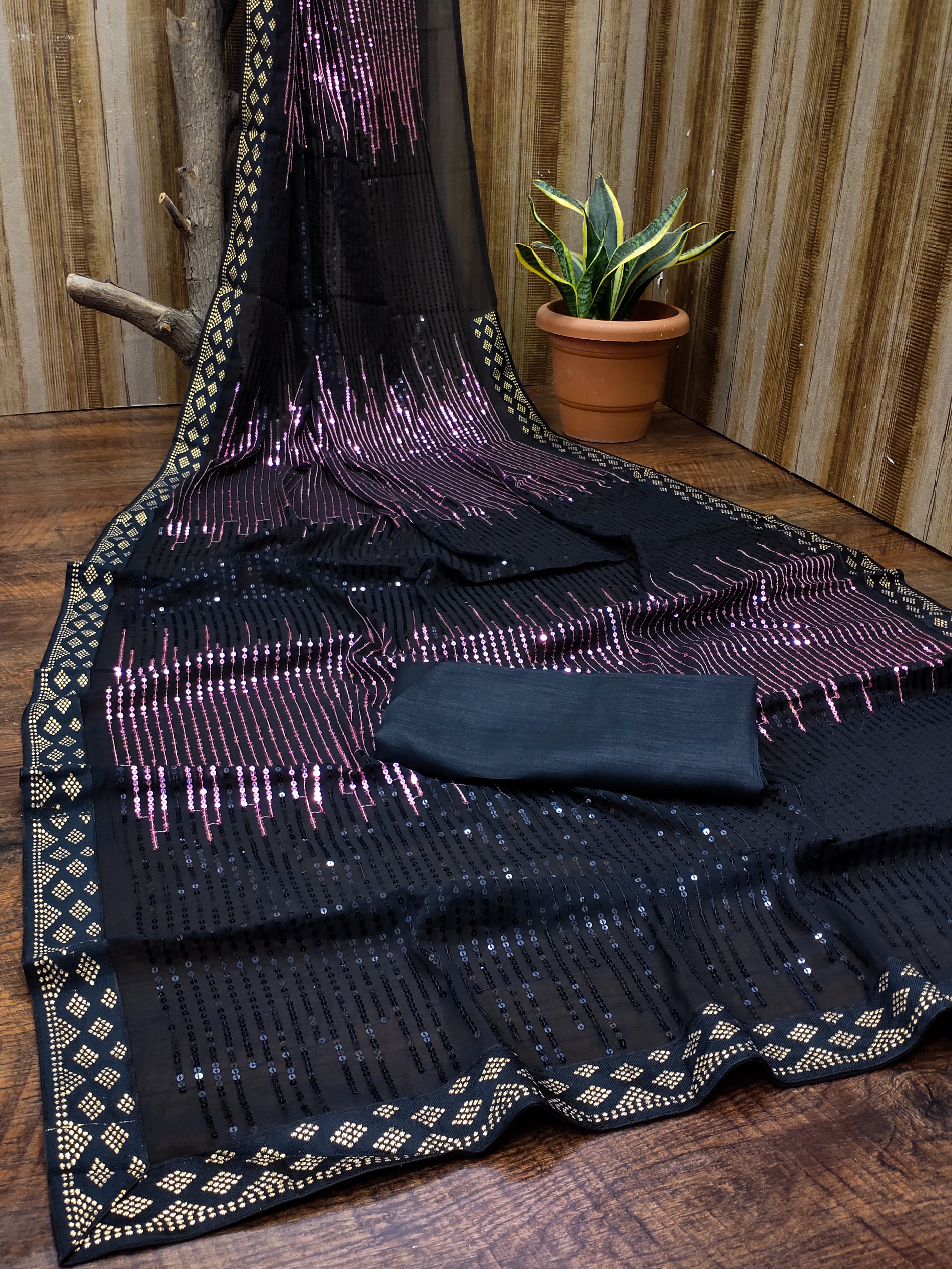 Channel timeless elegance with this striking Black & Pink Designer Saree, featuring an intricate pattern of pyramid-style Pink sequin lines cascading across luxurious Georgette fabric. The glittering design is complemented by a richly embroidered border and a matching blouse piece.
