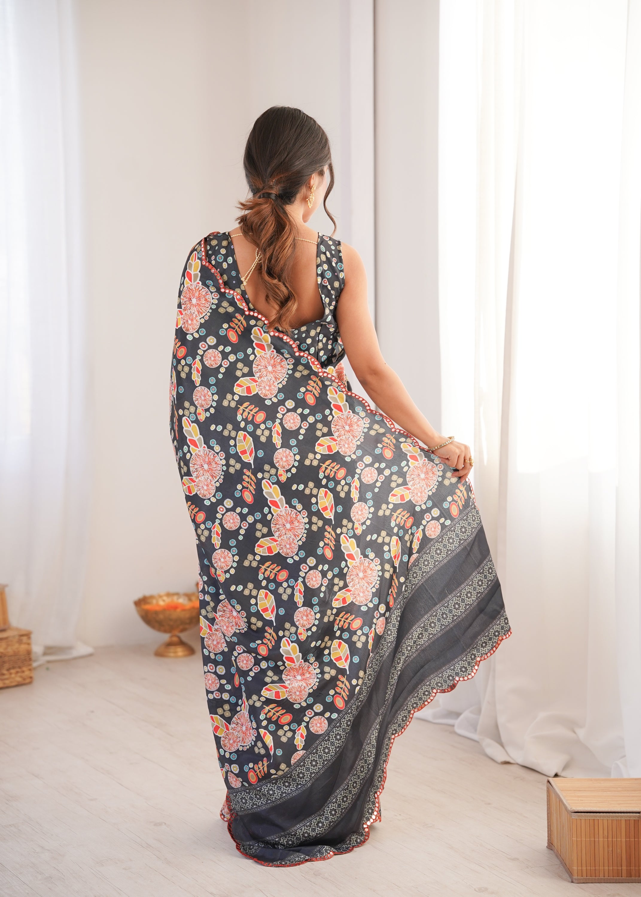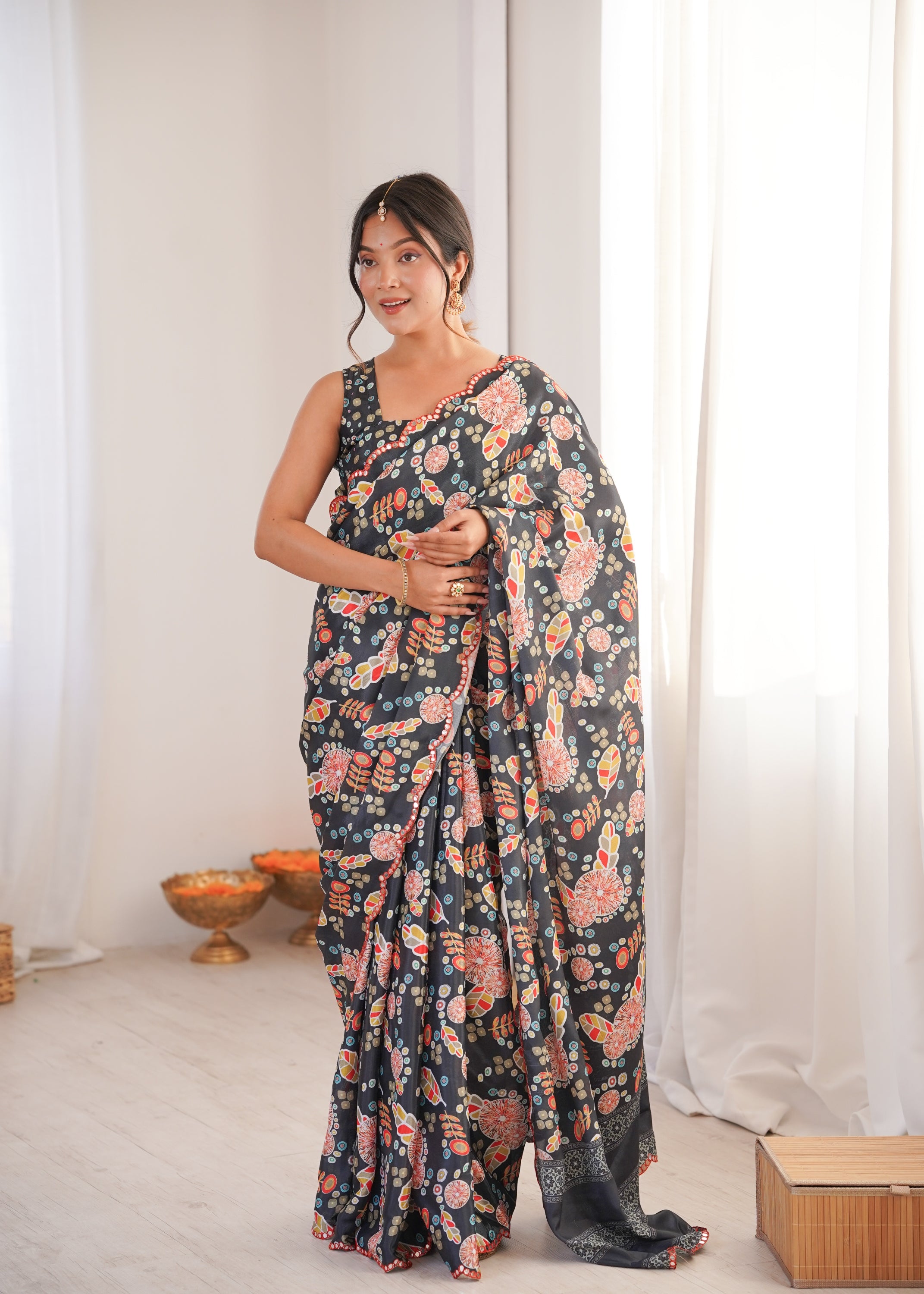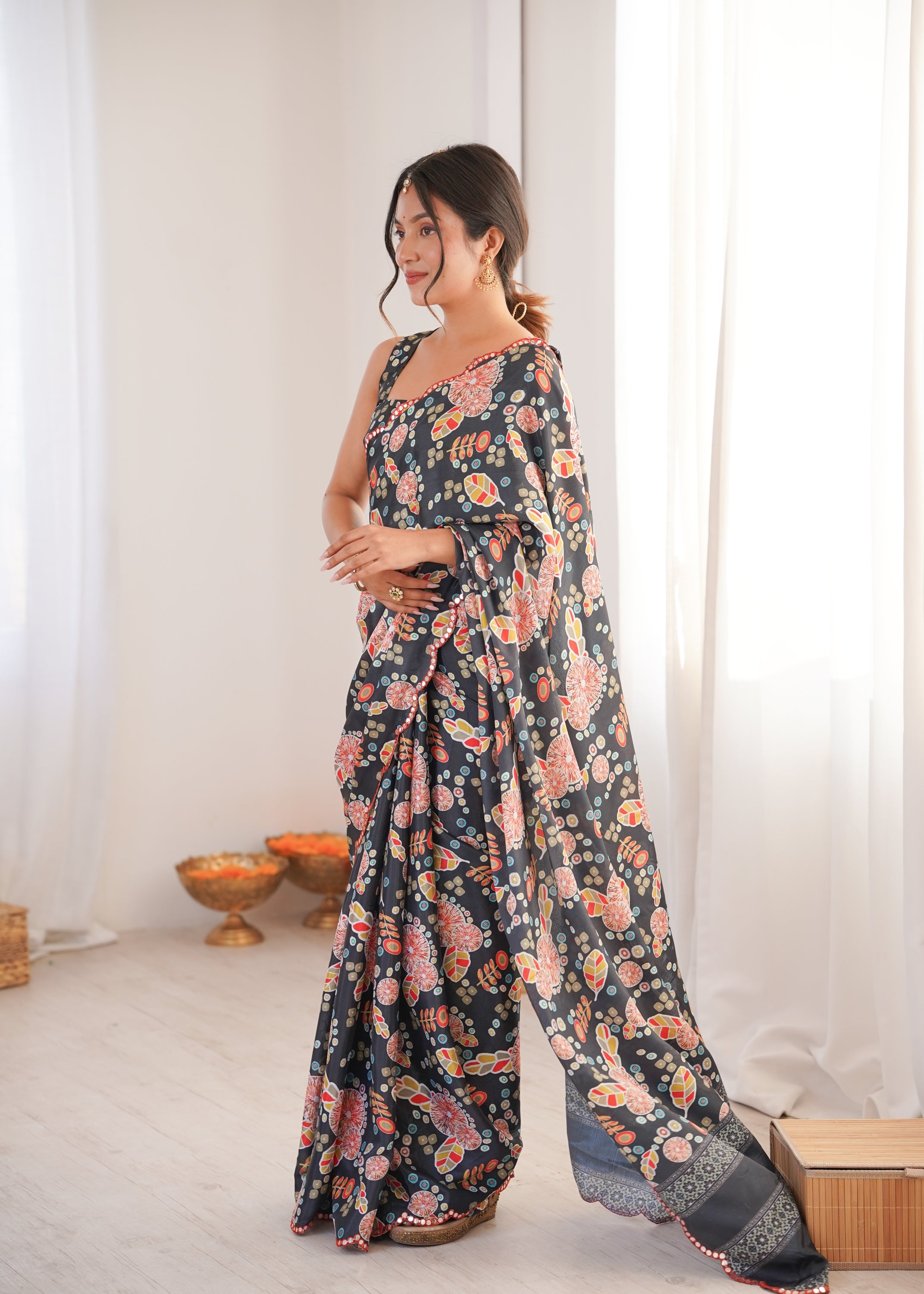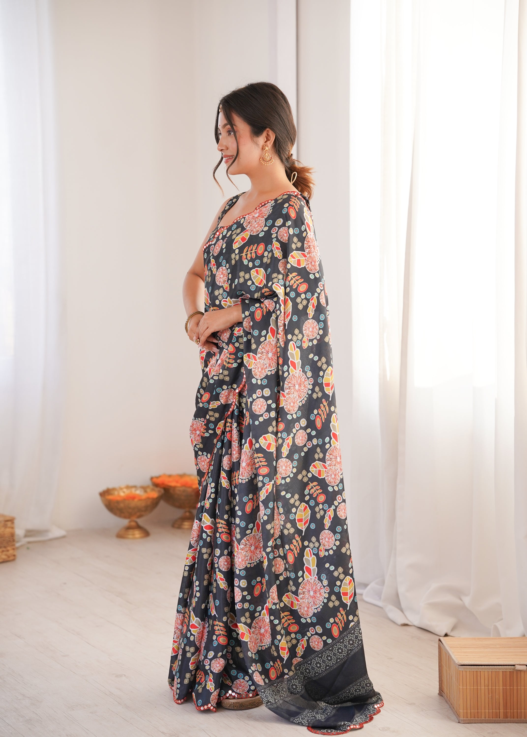 Elevate your ethnic wardrobe with this elegant Black printed saree, designed to blend tradition with effortless grace. Crafted from a lightweight, flowy fabric, this saree features an all-over pattern in warm hues, beautifully complemented by a subtle sequin-embellished border. Perfect for festive occasions, daytime celebrations, weddings, or intimate gatherings, it drapes gracefully and offers all-day comfort with timeless appeal. Style it with statement earrings and a matching blouse to complete the look.