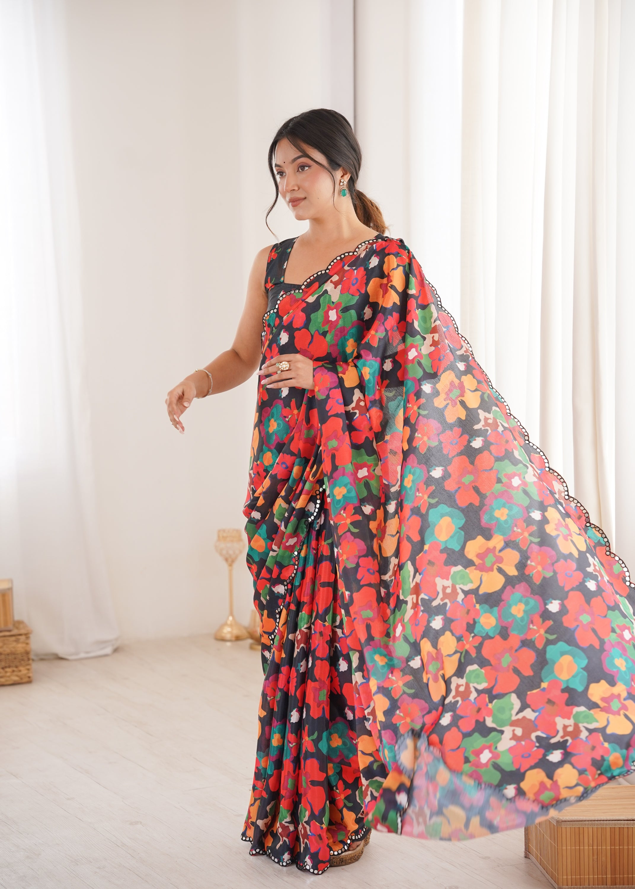 Elevate your ethnic wardrobe with this elegant Black printed saree, designed to blend tradition with effortless grace. Crafted from a lightweight, flowy fabric, this saree features an all-over pattern in warm hues, beautifully complemented by a subtle sequin-embellished border. Perfect for festive occasions, daytime celebrations, weddings, or intimate gatherings, it drapes gracefully and offers all-day comfort with timeless appeal. Style it with statement earrings and a matching blouse to complete the look.