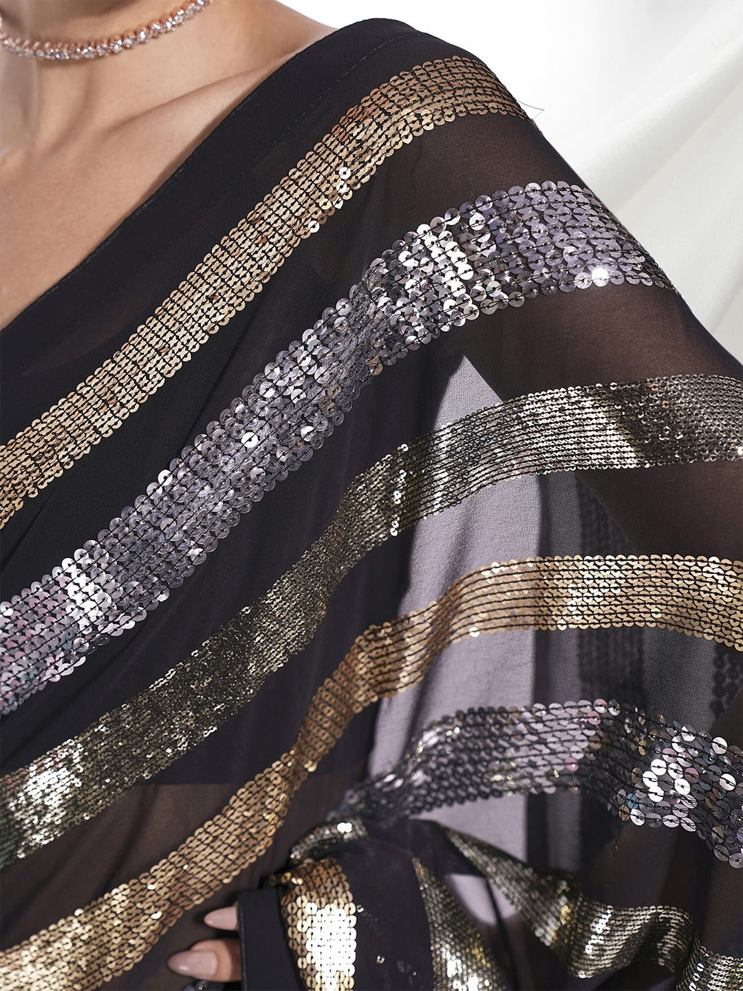 Black Sequin Striped Georgette Saree Glamorous Party & Evening Wear Saree