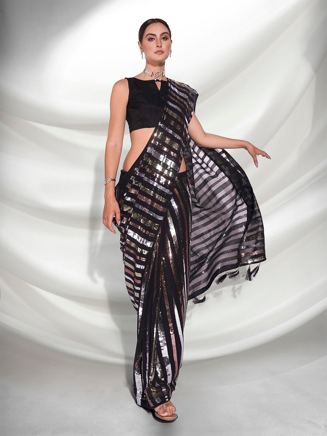 Step into the spotlight with this Black Sequin Striped Saree – the ultimate fusion of glam and elegance. Crafted to dazzle, this saree features high-shine sequins in horizontal and vertical striped patterns that create a bold silhouette ideal for evening and festive occasions.