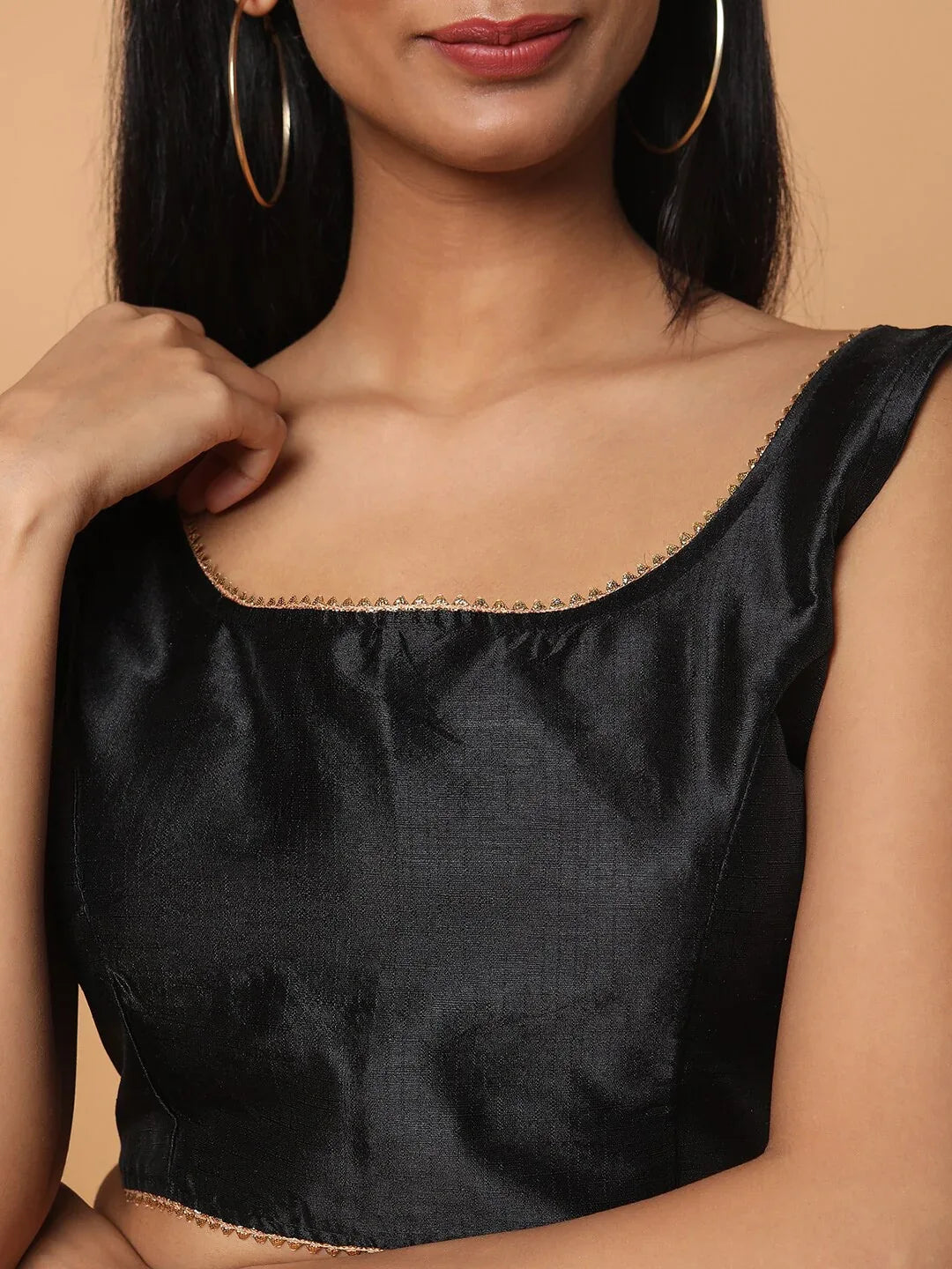Make a bold style statement with this elegant Black readymade blouse. Featuring a flattering square neckline and delicate silver lace trim, this sleeveless blouse is the perfect choice to pair with sarees or lehengas for weddings, festive occasions, and special gatherings.