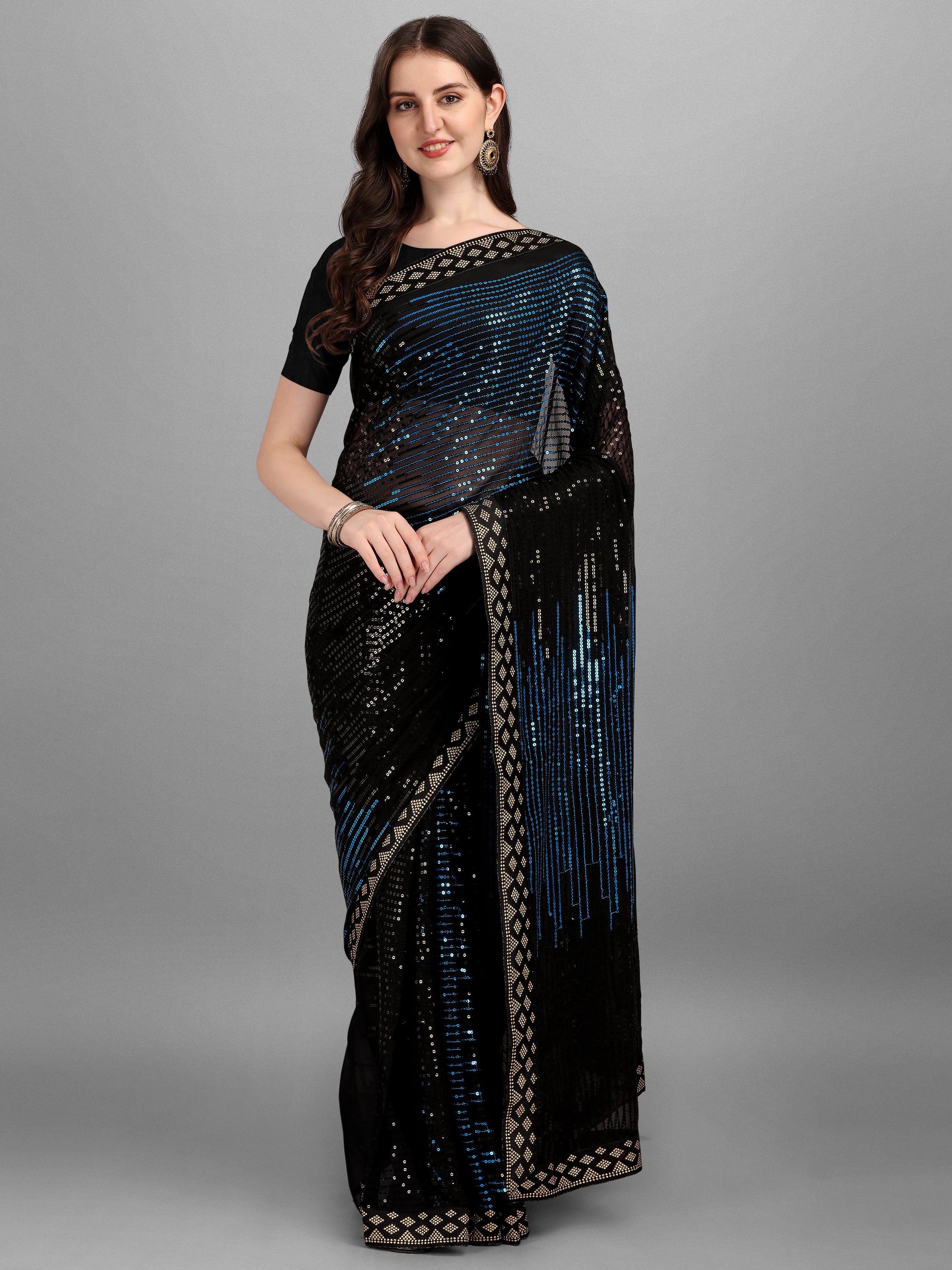 Channel timeless elegance with this striking Black & Teal Blue Designer Saree, featuring an intricate pattern of pyramid-style Teal Blue sequin lines cascading across luxurious Georgette fabric. The glittering design is complemented by a richly embroidered border and a matching blouse piece.