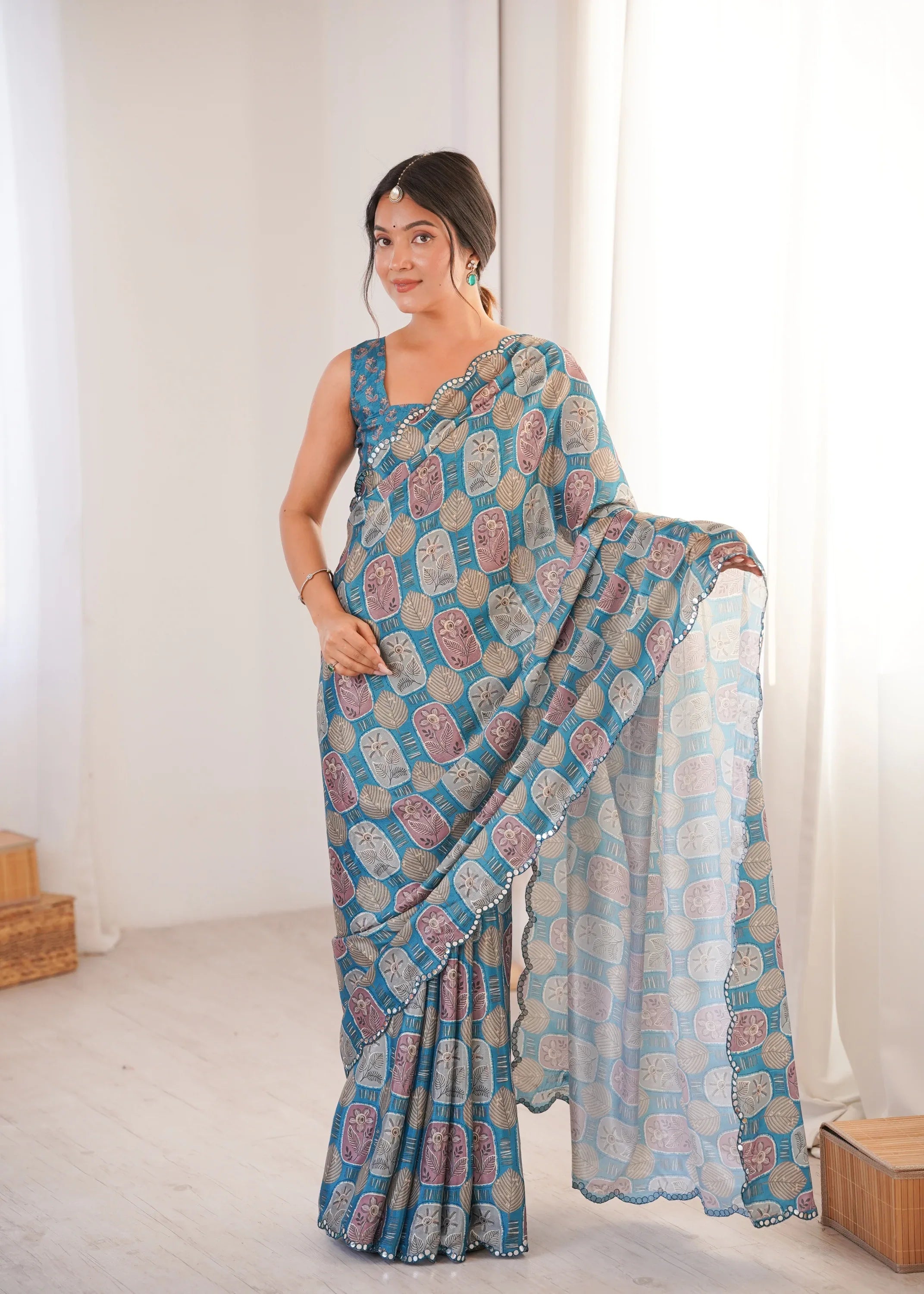 Elevate your ethnic wardrobe with this elegant Blue printed saree, designed to blend tradition with effortless grace. Crafted from a lightweight, flowy fabric, this saree features an all-over pattern in warm hues, beautifully complemented by a subtle sequin-embellished border. Perfect for festive occasions, daytime celebrations, weddings, or intimate gatherings, it drapes gracefully and offers all-day comfort with timeless appeal. Style it with statement earrings and a matching blouse to complete the look.