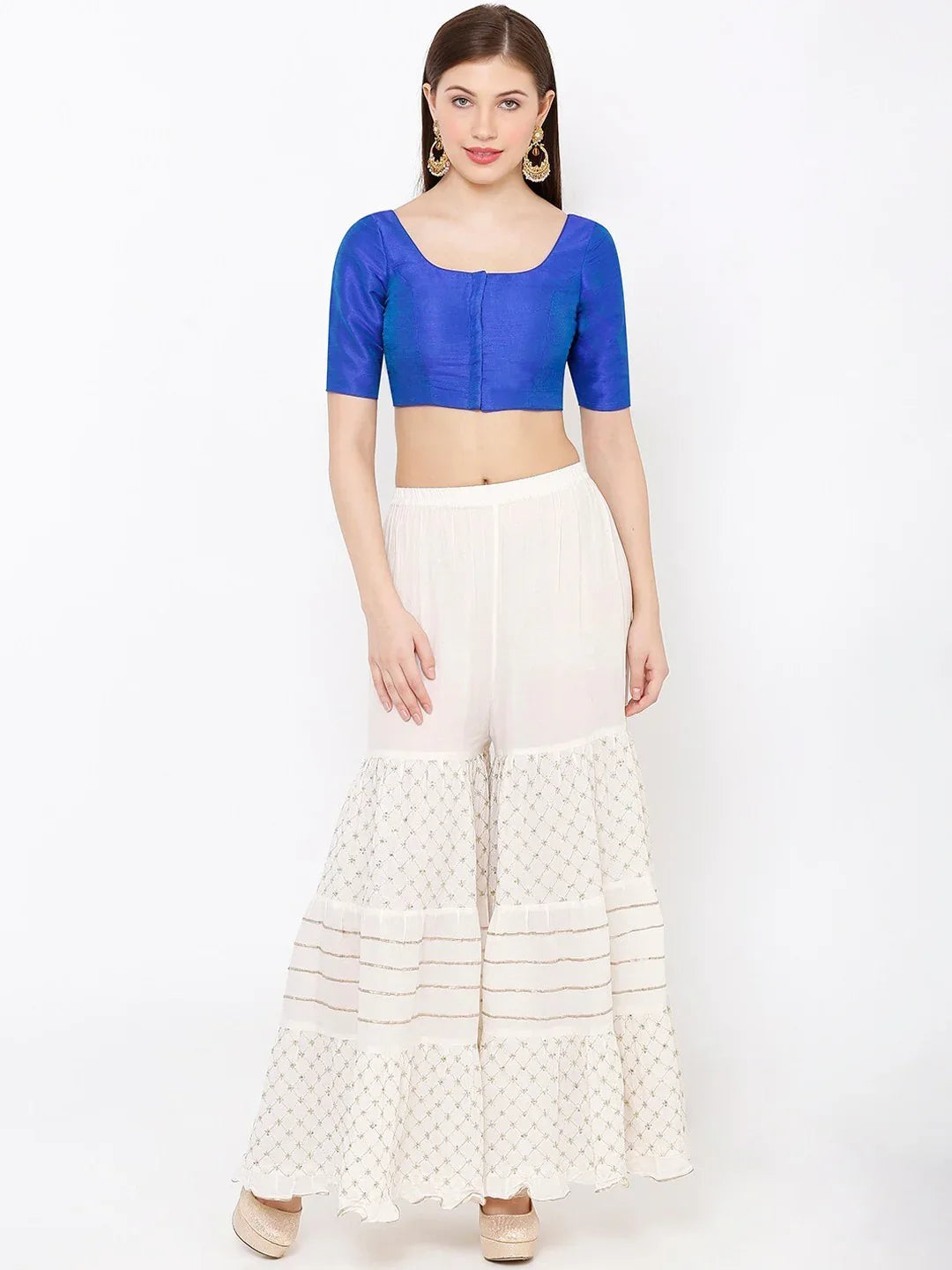 Turn heads with this stunning Blue readymade blouse featuring a deep scoop neckline and elegant elbow-length sleeves. Designed with a sleek front hook closure and tailored fit, it’s the perfect match for festive sarees and lehengas.