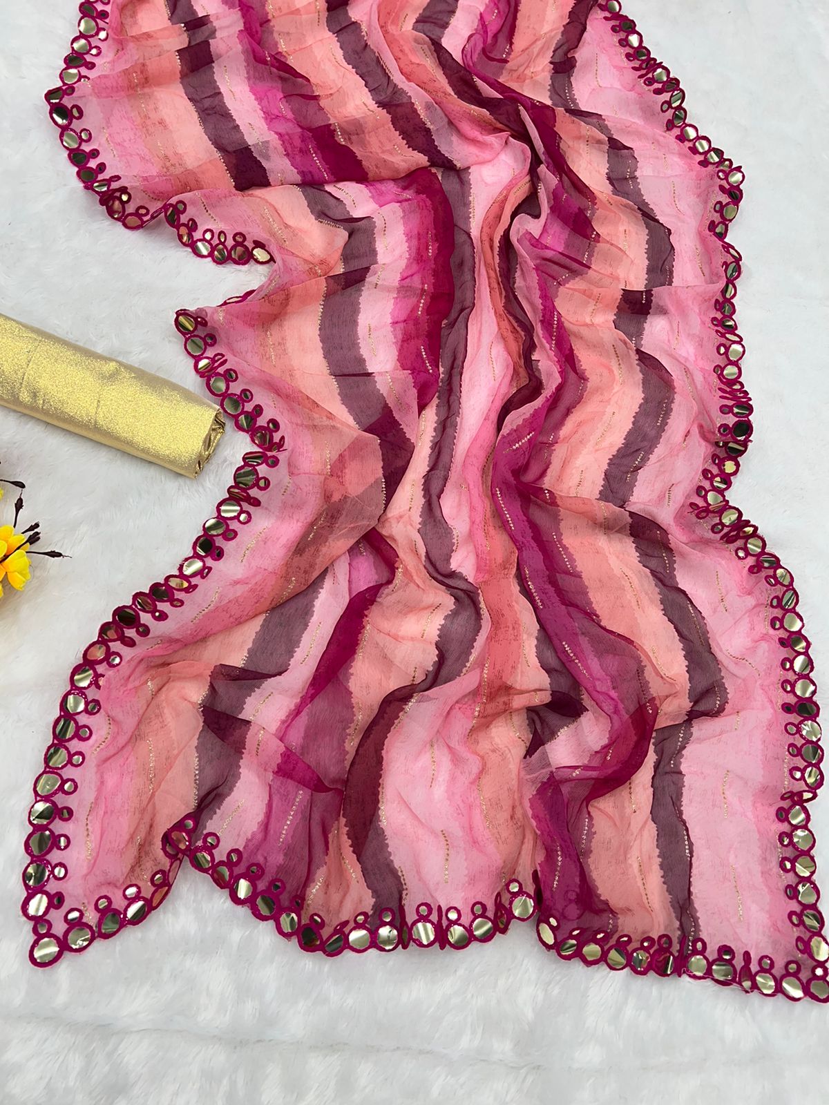 Make a bold yet elegant statement in our Blush Bloom saree, adorned in vibrant pink and magenta stripes with golden thread hints. This refreshing and youthful drape is framed by a stunning circular mirror work border that adds sparkle and fun to your festive style.