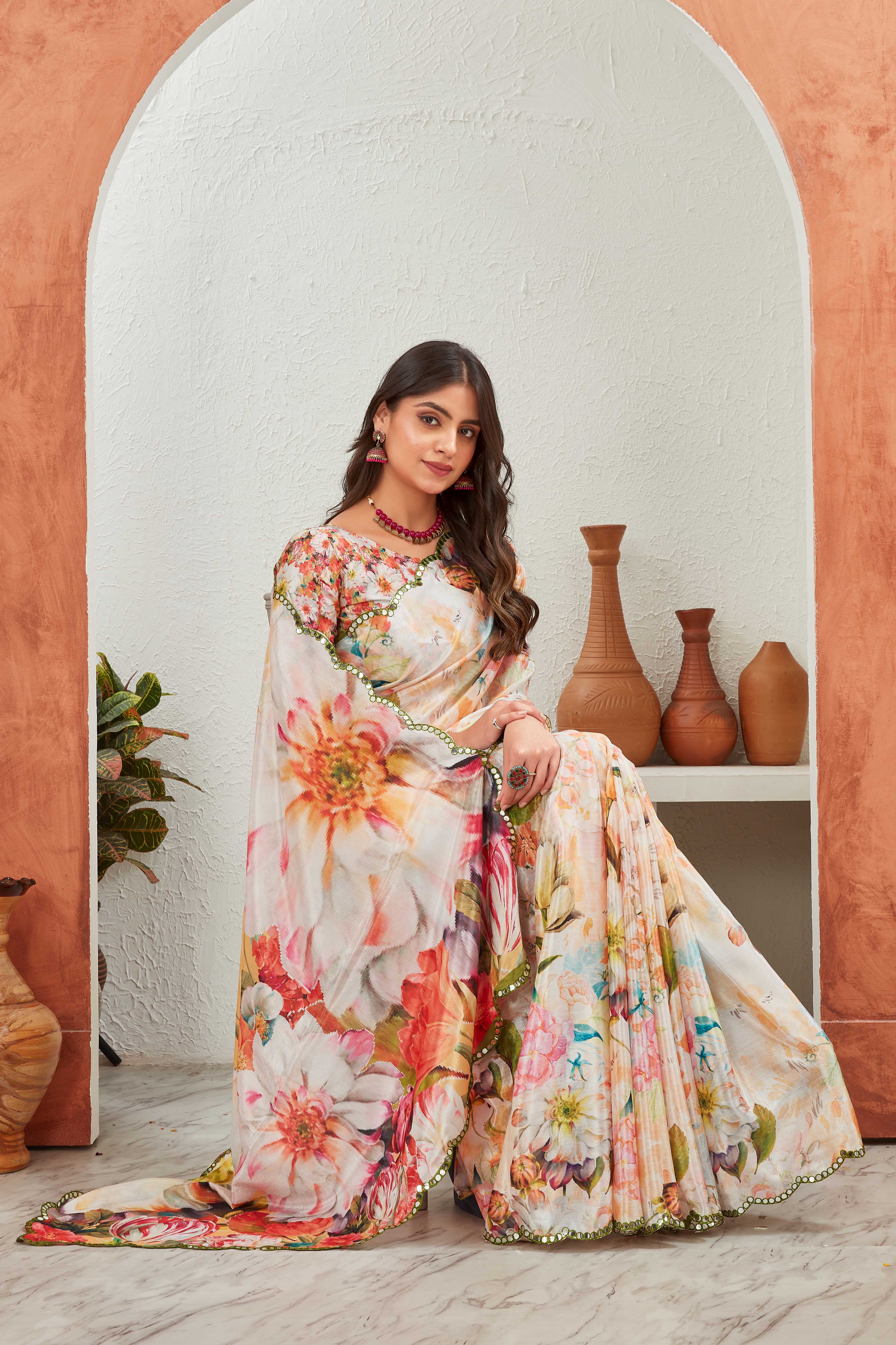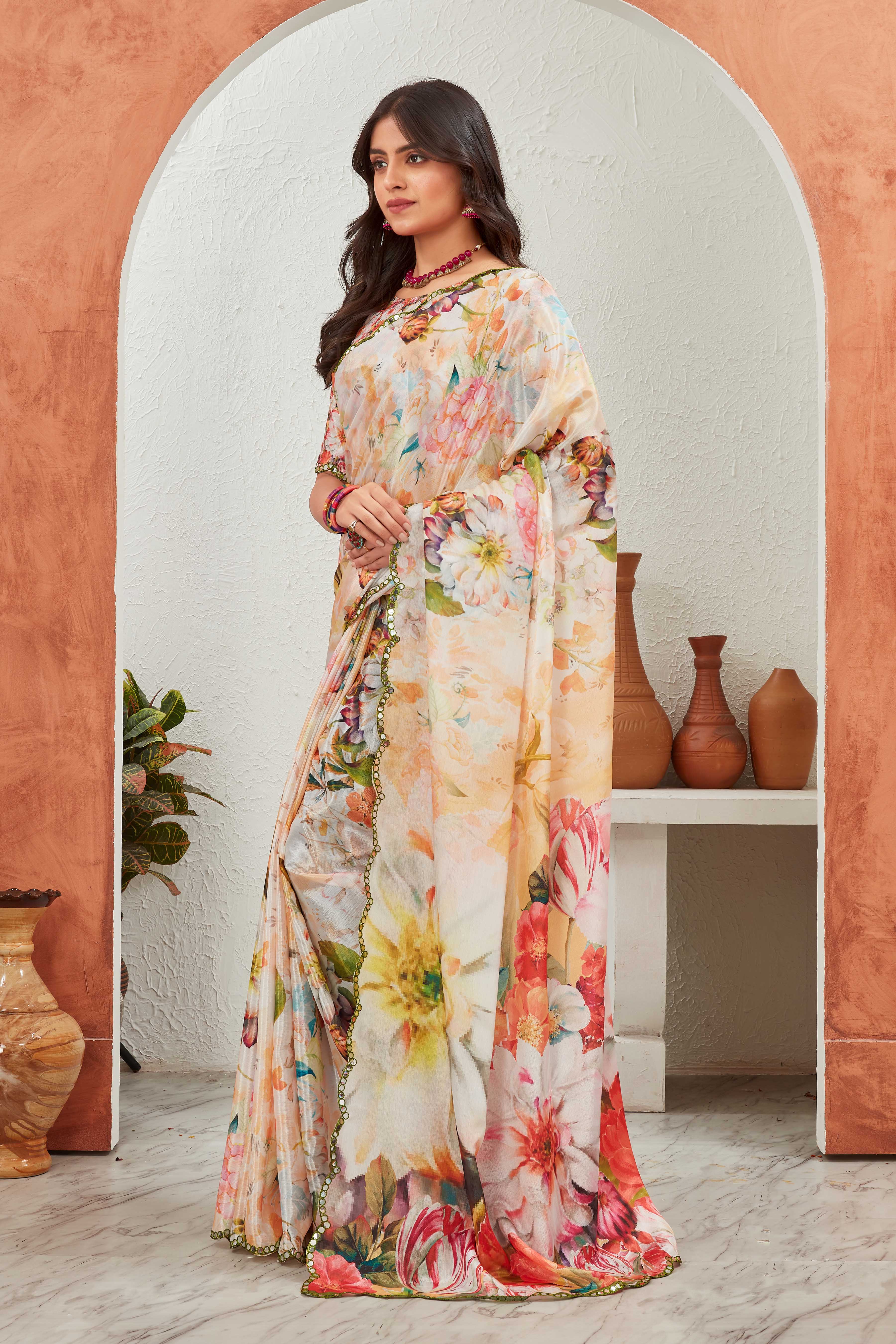 Bring the garden to your wardrobe with this Bold Bloom Floral Print Saree, designed for the modern woman who loves classic elegance with a dramatic twist. Featuring oversized floral motifs in rich shades of orange, cream, yellow, and pink, this saree is a true show-stopper.