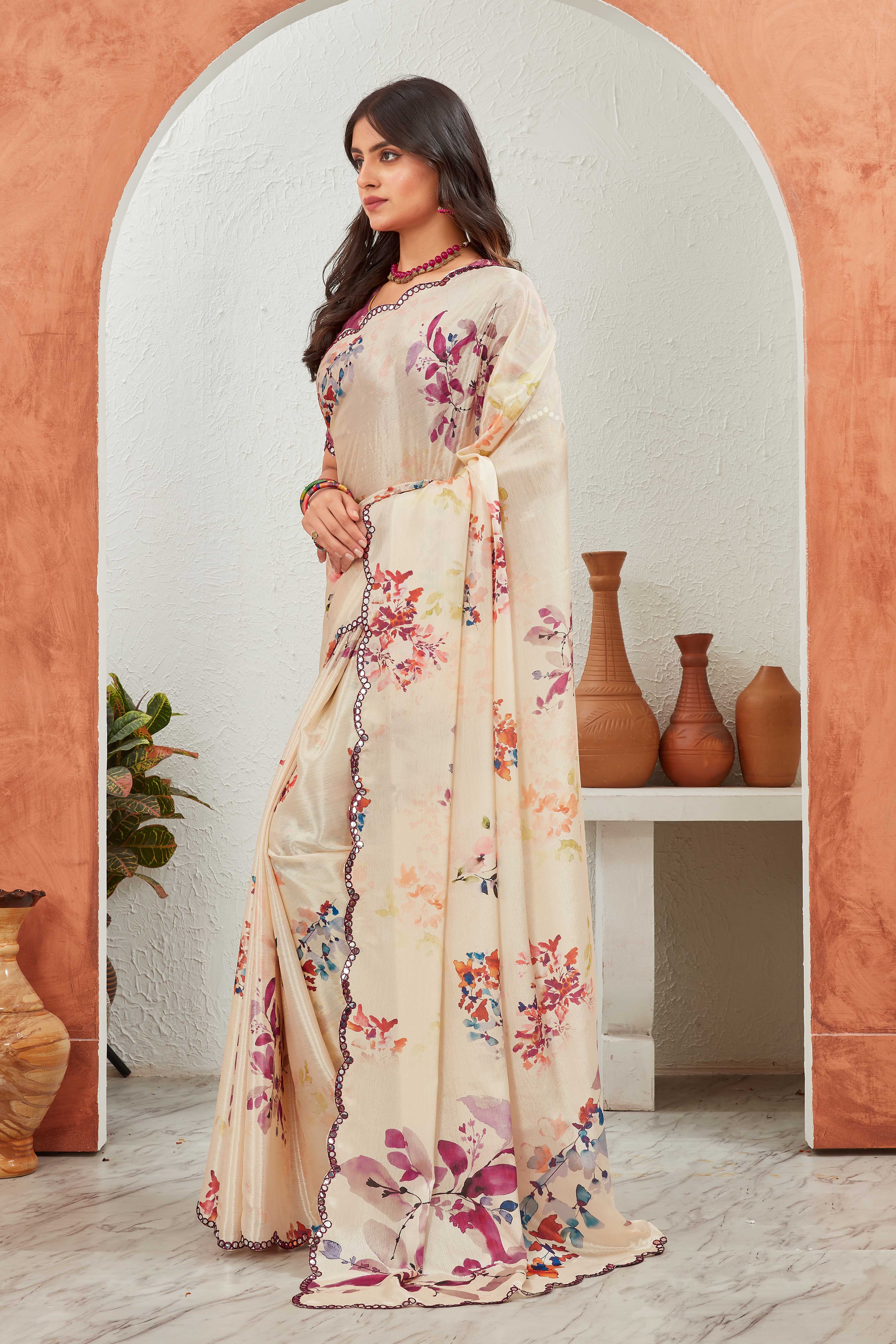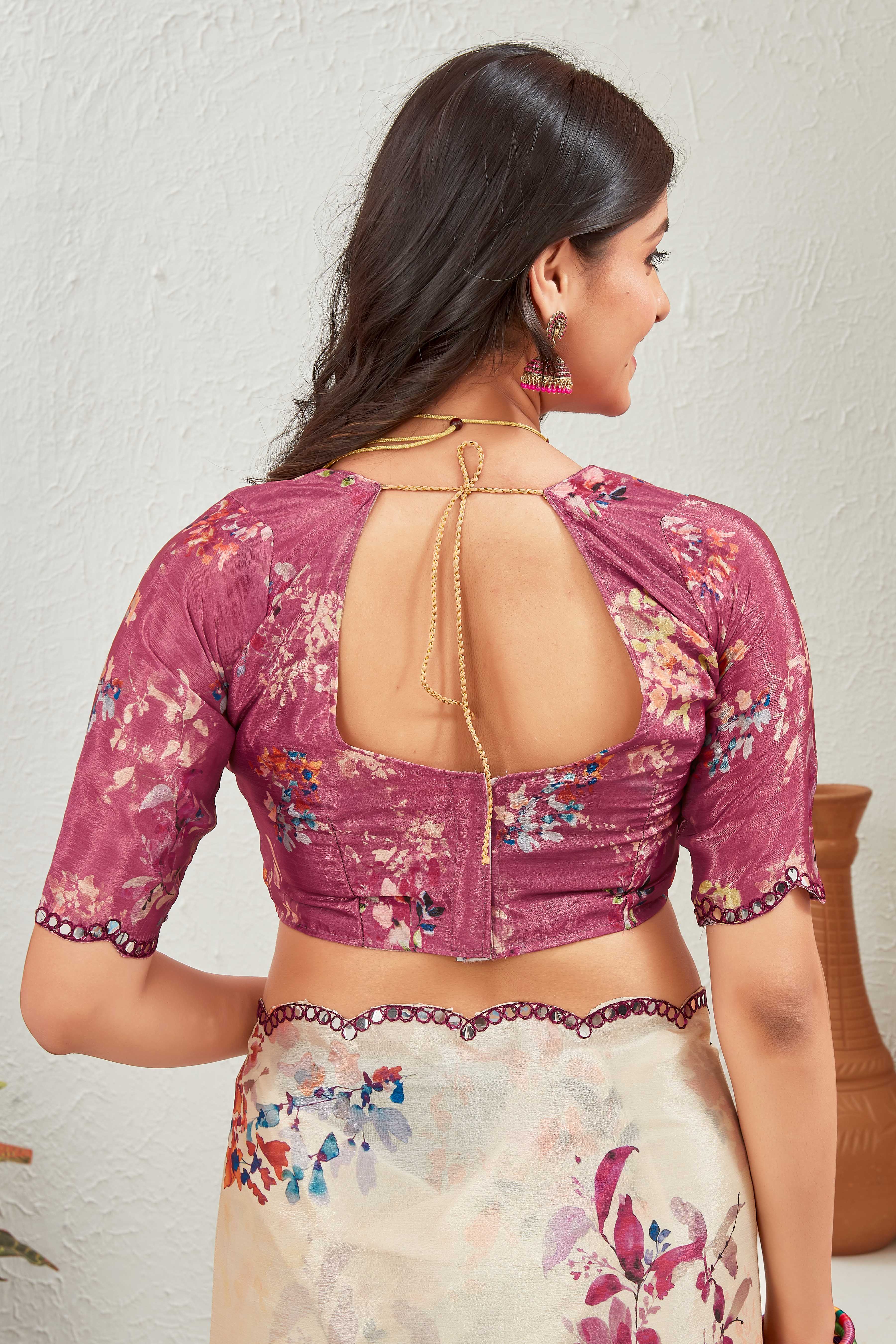 Grace your wardrobe with this effortlessly chic beige saree featuring a soft floral print and contrast plum blouse. This saree blends subtle elegance with a modern twist, perfect for daytime occasions or festive gatherings.