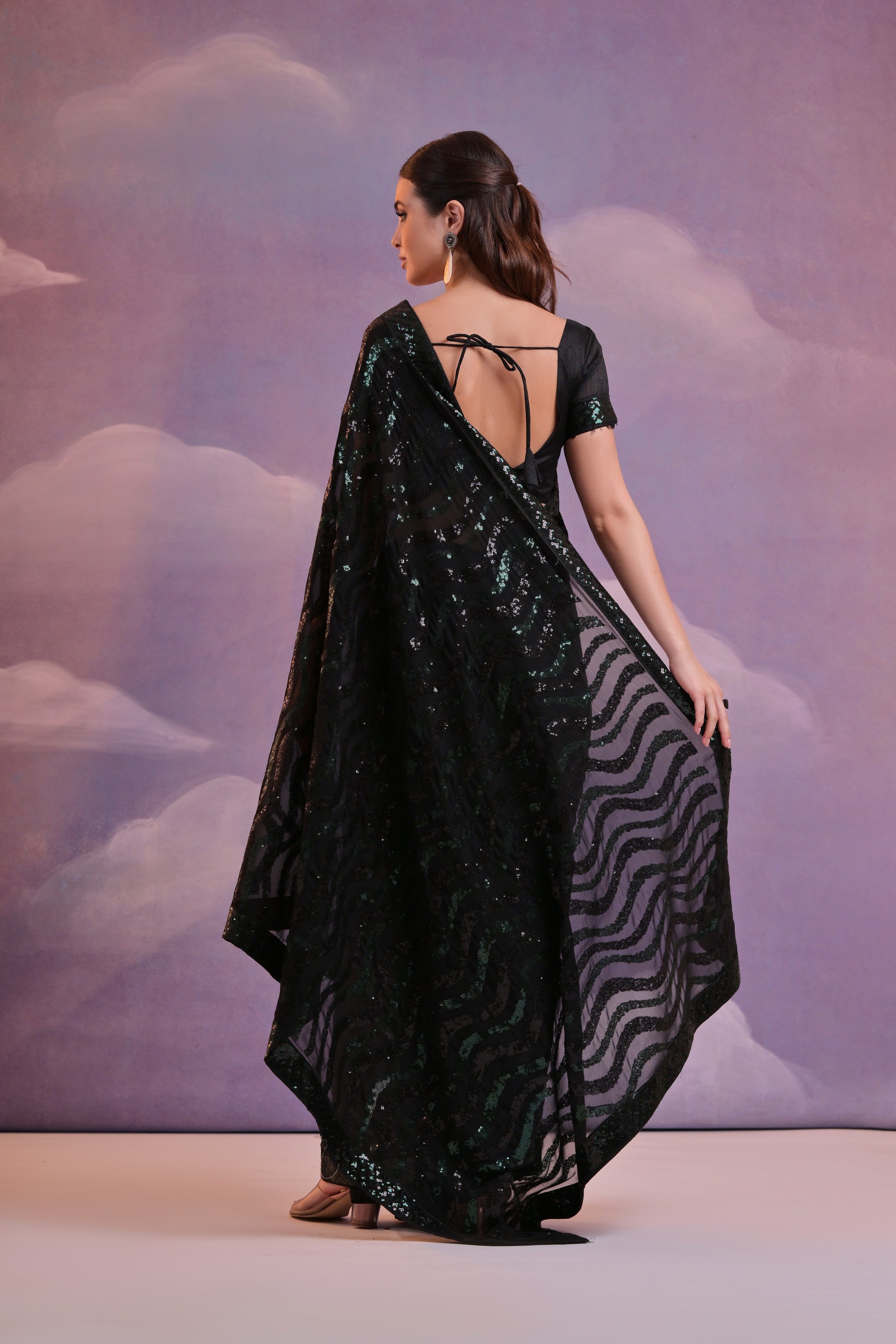 Shimmer and shine in timeless elegance with our Black And Green Sequin Georgette Saree. This exquisite piece features all-over sequin embellishments on soft georgette fabric, creating a perfect blend of glamour and grace. Whether you're attending a cocktail party, festive celebration, or evening gala, this saree ensures you make a stunning impression.