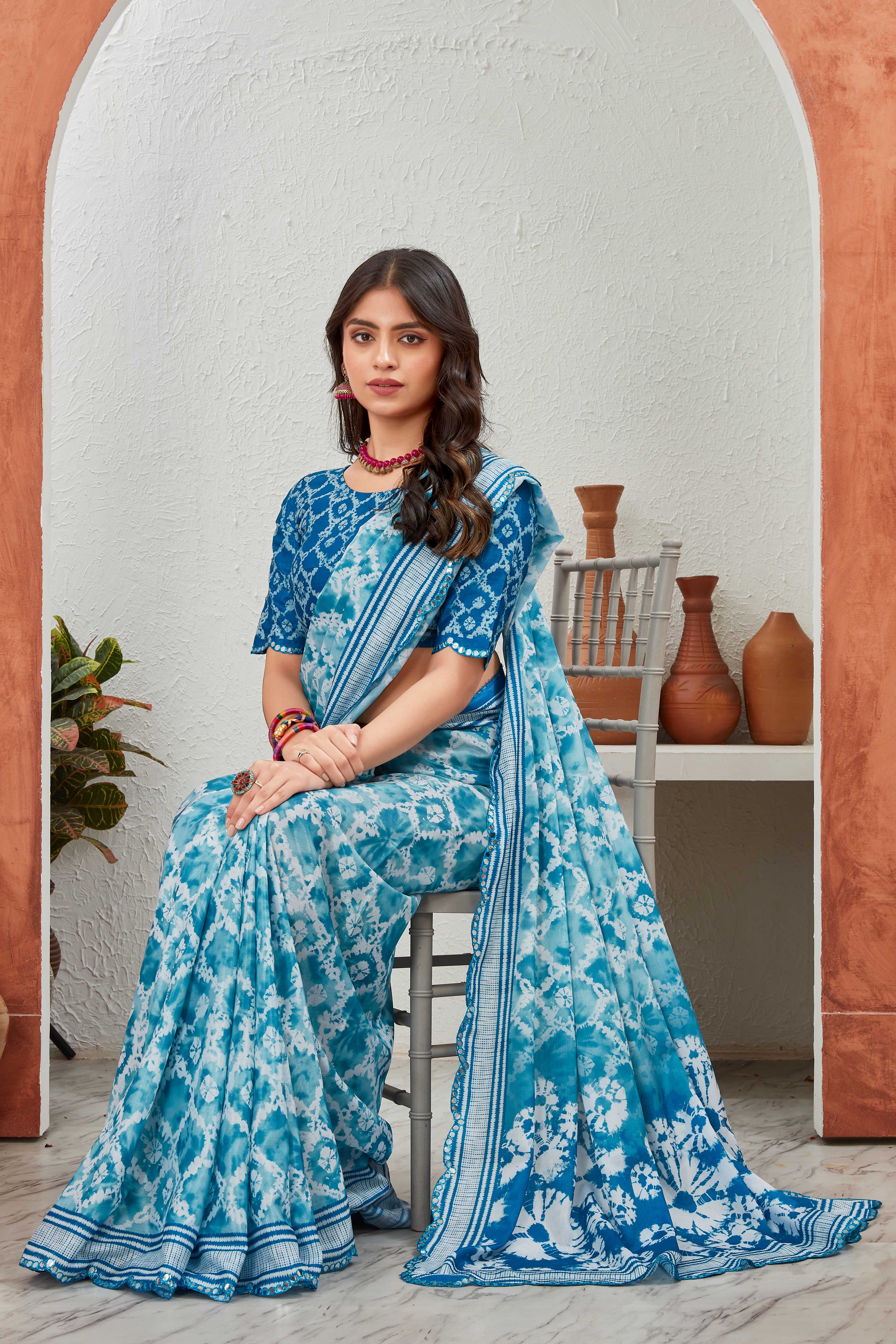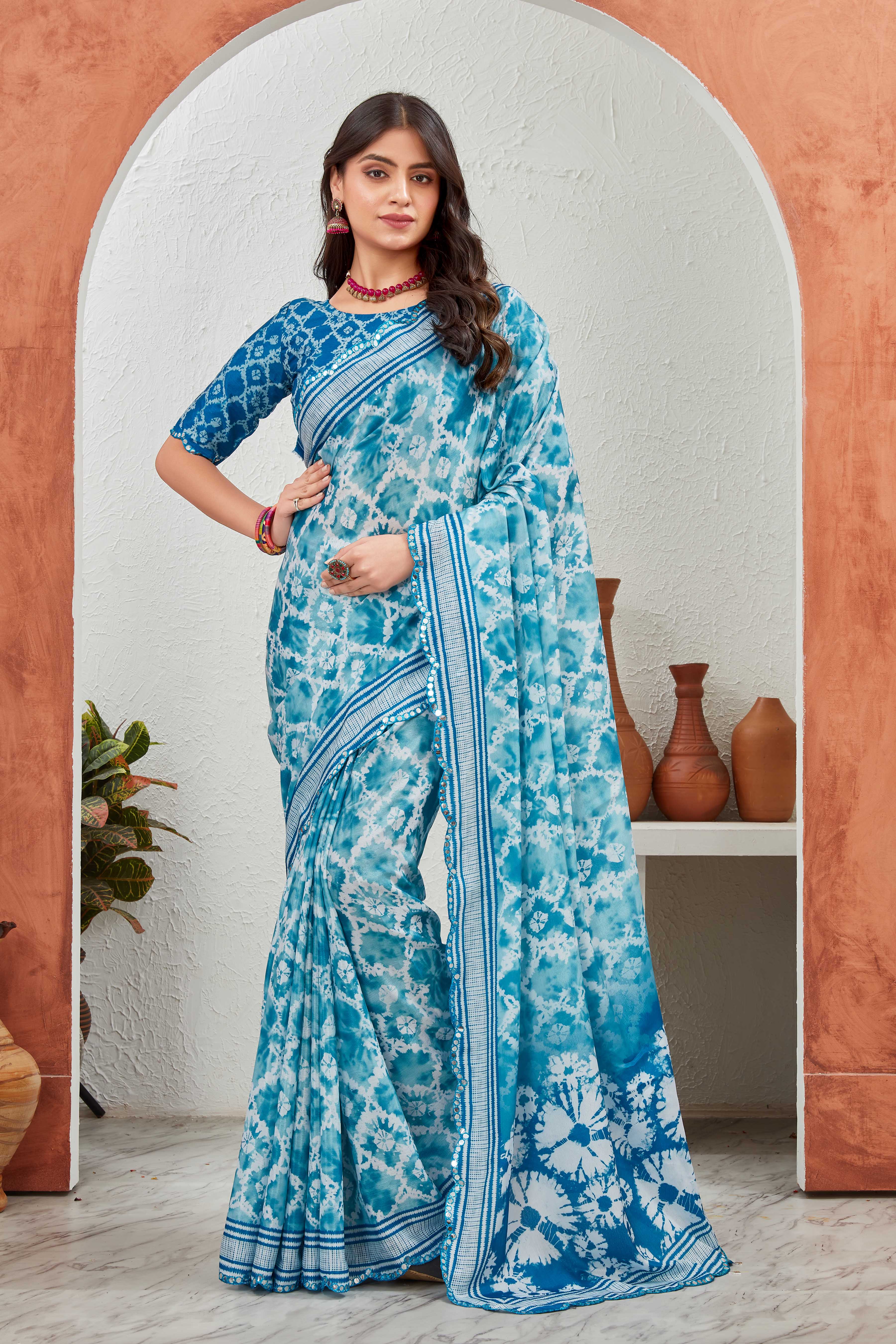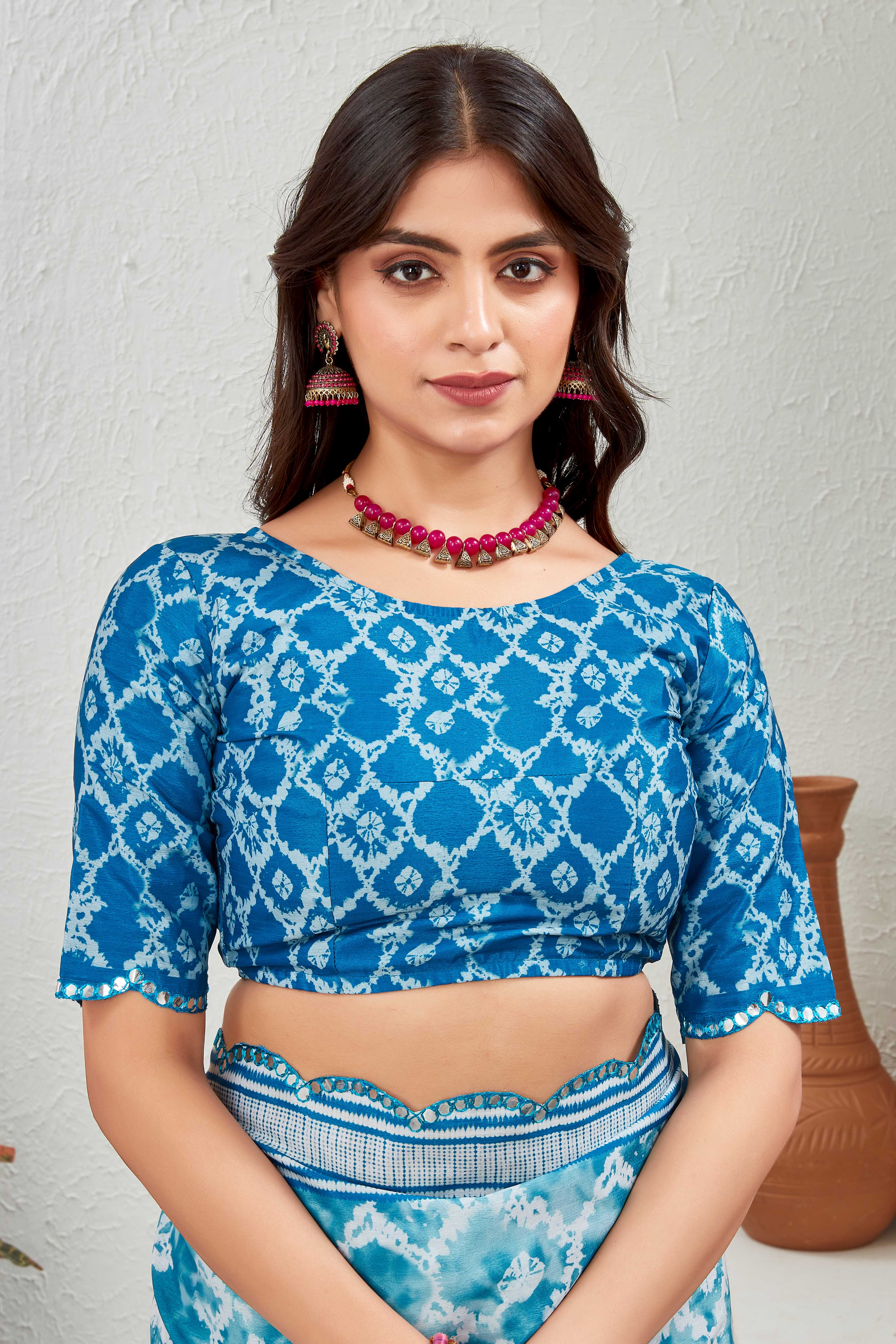 Step into timeless elegance with this blue tie-dye printed saree that perfectly blends traditional design with modern charm. Crafted in a lightweight synthetic blend, this saree features an eye-catching tie-dye pattern in shades of blue and white. The border is accented with fine striped detailing, and the matching blouse adds a stunning contrast with its bold motifs.