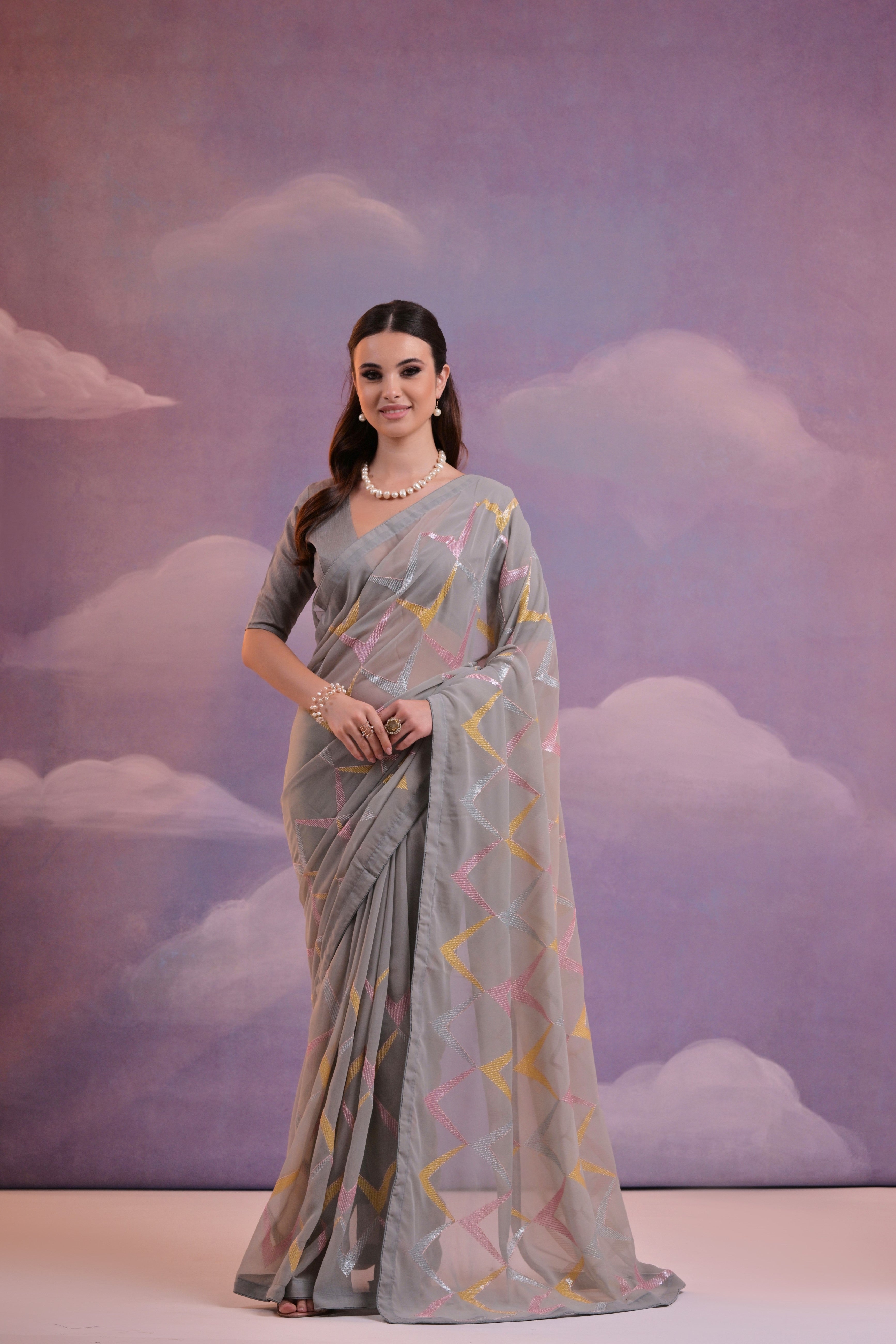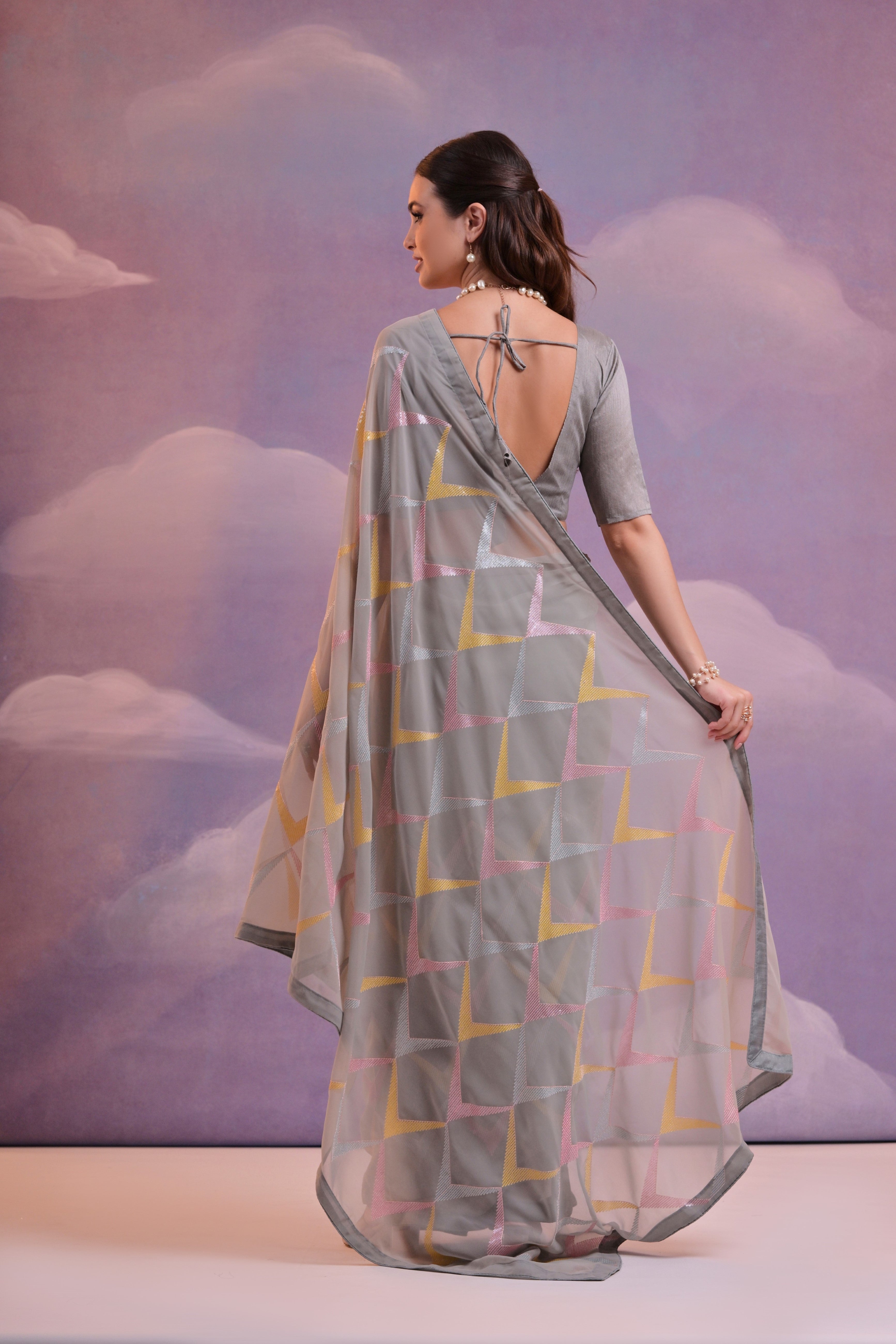 Refined, graceful, and contemporary โ this grey georgette saree features striking multicolor geometric embroidery in pastel shades of pink, yellow, and silver. Designed for the modern woman with a love for minimalistic elegance, this saree speaks volumes through subtle sophistication.