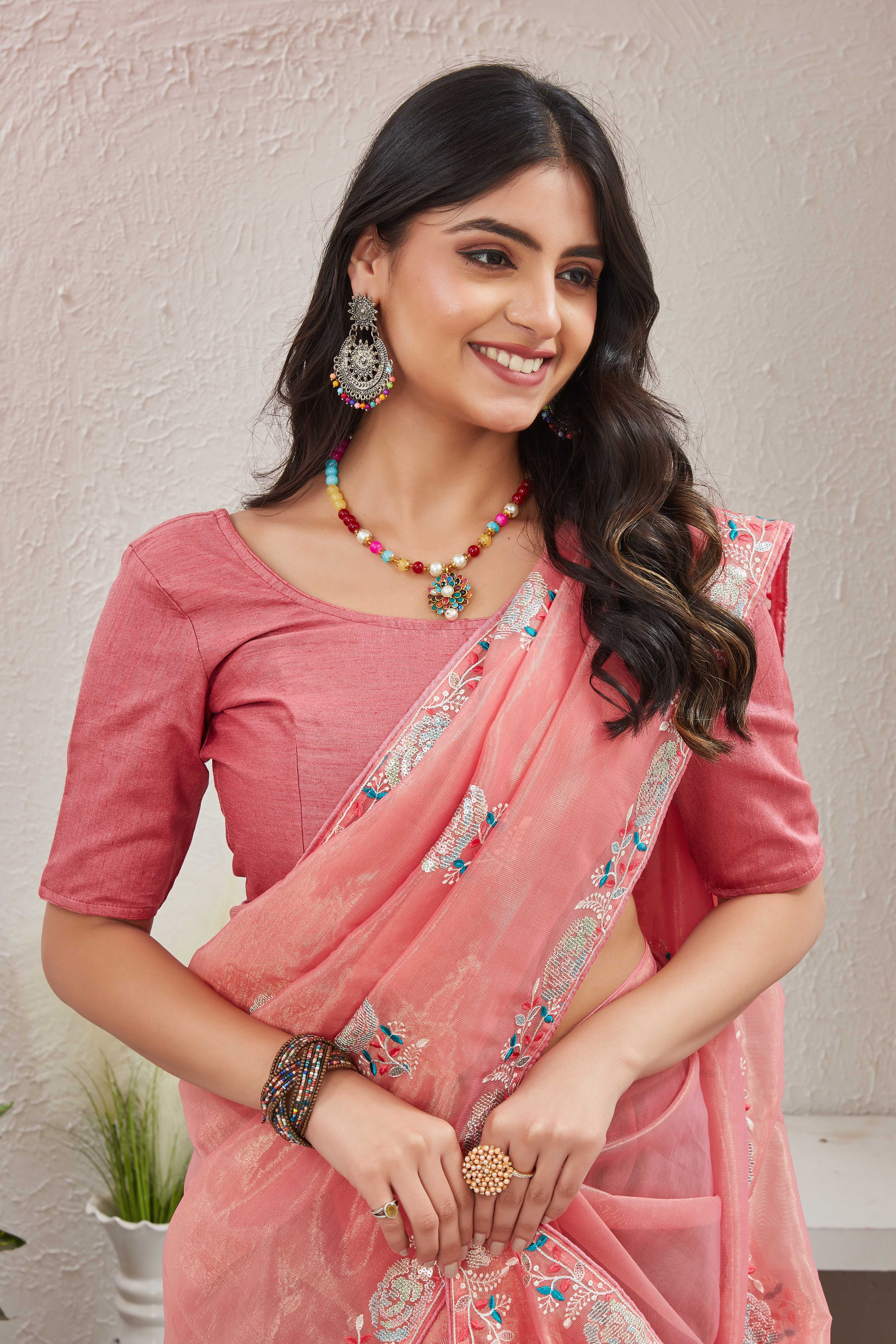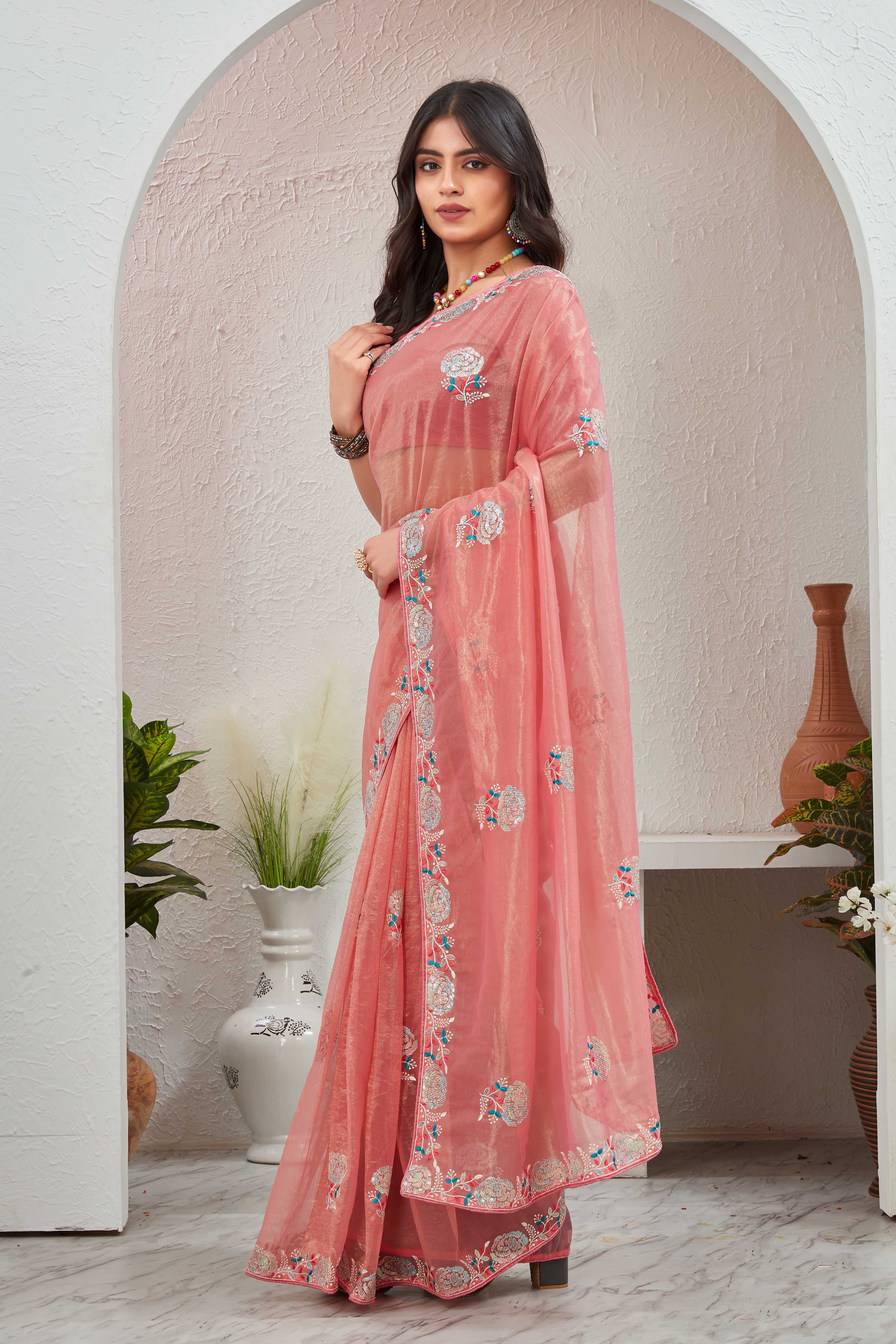 Turn heads with this enchanting Peach Organza Saree, a timeless piece exuding sheer elegance and subtle glam. Crafted from airy organza fabric, the saree gracefully flows with every step, creating a soft and radiant silhouette.