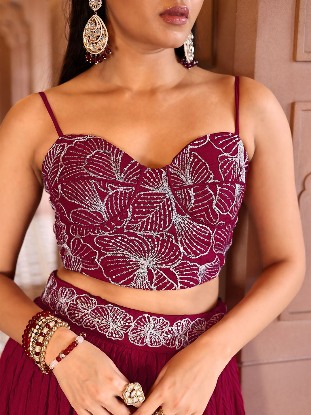 Turn heads with this elegant red georgette lehenga set, designed for the modern woman who cherishes tradition with a contemporary flair. The intricately embroidered bustier-style blouse with delicate leaf patterns adds a touch of sophistication and charm. The lehenga skirt flows beautifully with soft pleats, creating a graceful silhouette. This ensemble is paired with a matching red dupatta, finished with subtle sequin borders, making it perfect for weddings, festive occasions, and cocktail events.