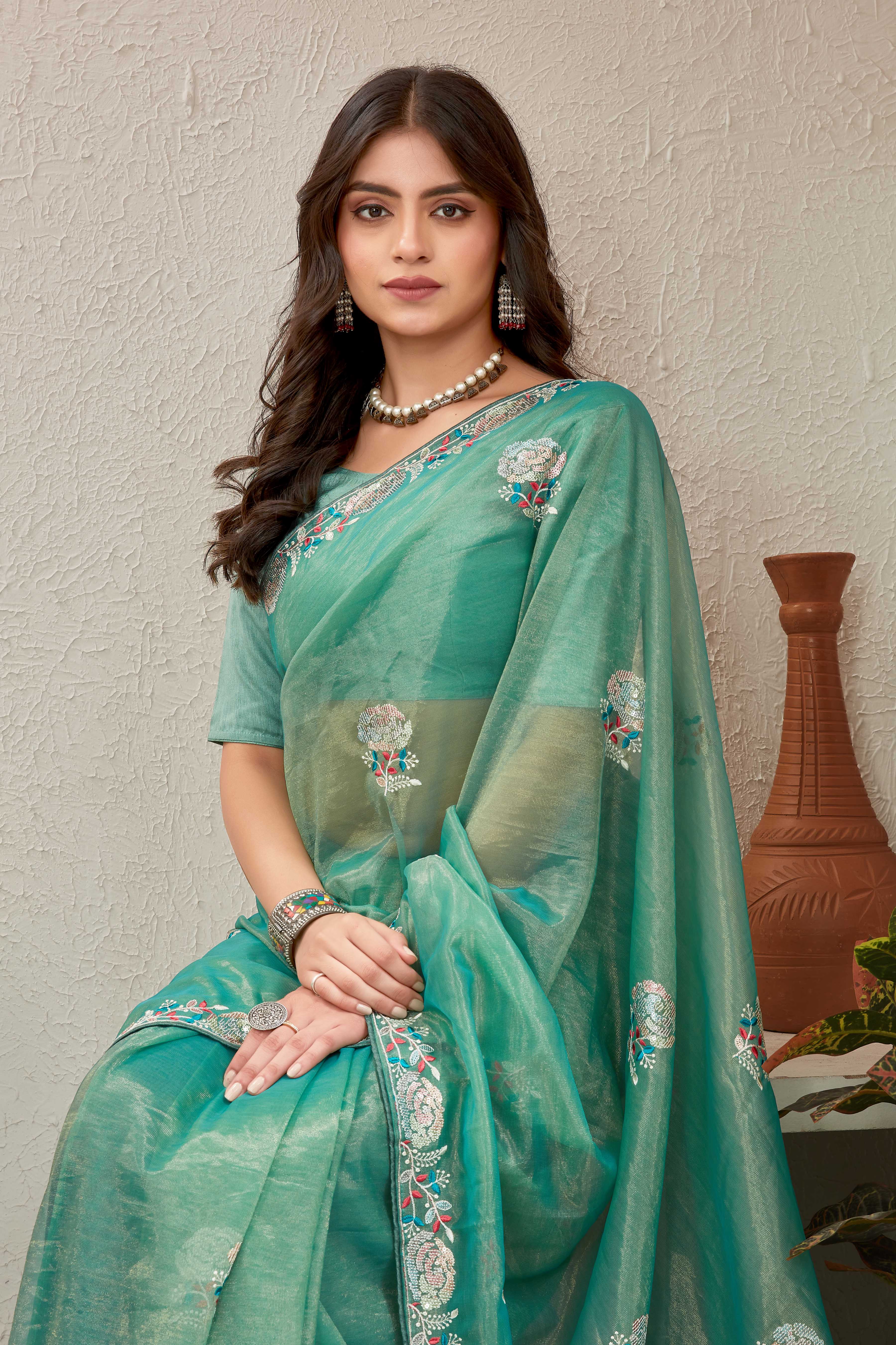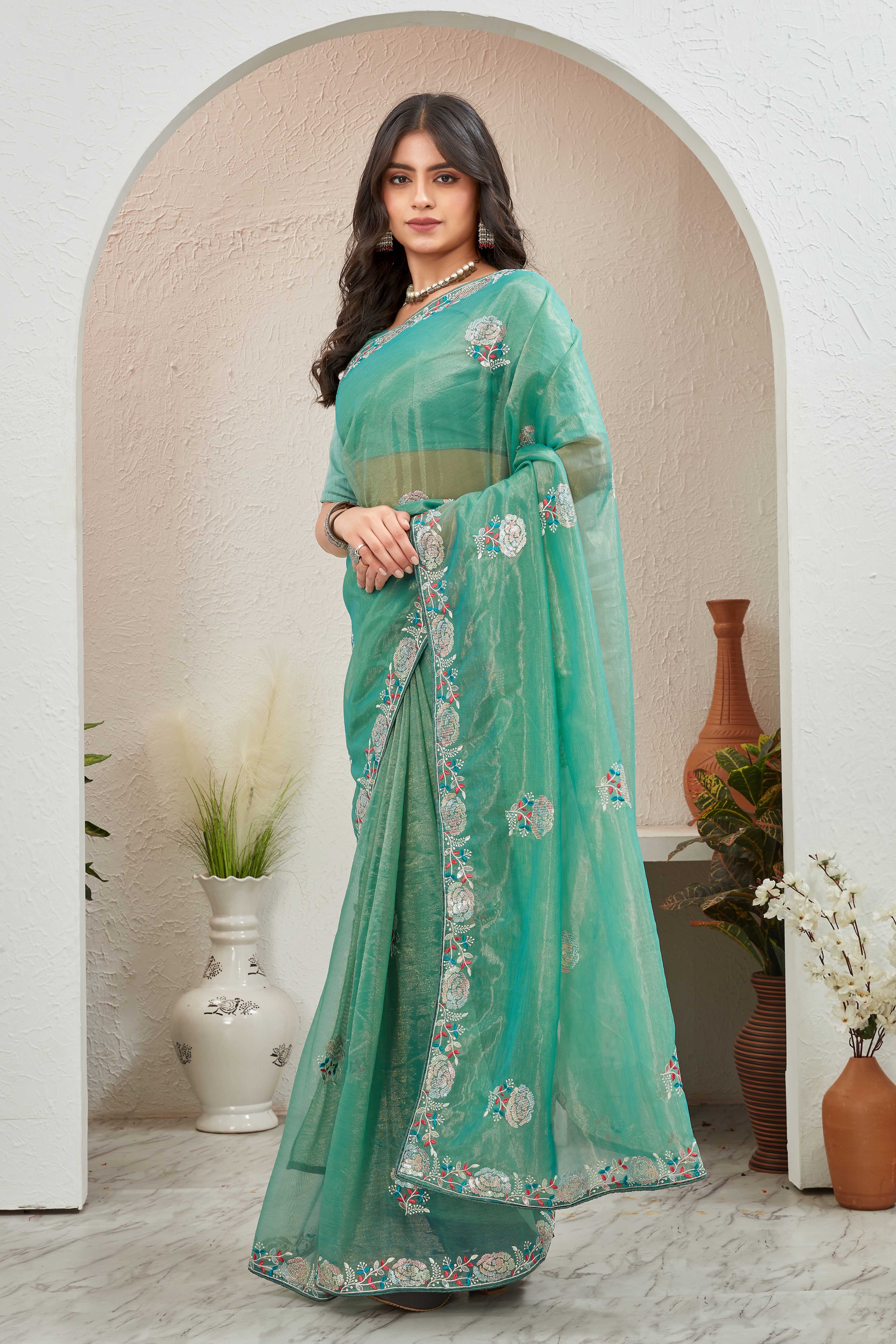This stunning sky blue organza saree brings a perfect blend of freshness and tradition. Featuring floral embroidery intricately detailed along the border and dainty motifs throughout, it adds a soft, graceful charm to your ethnic wardrobe.