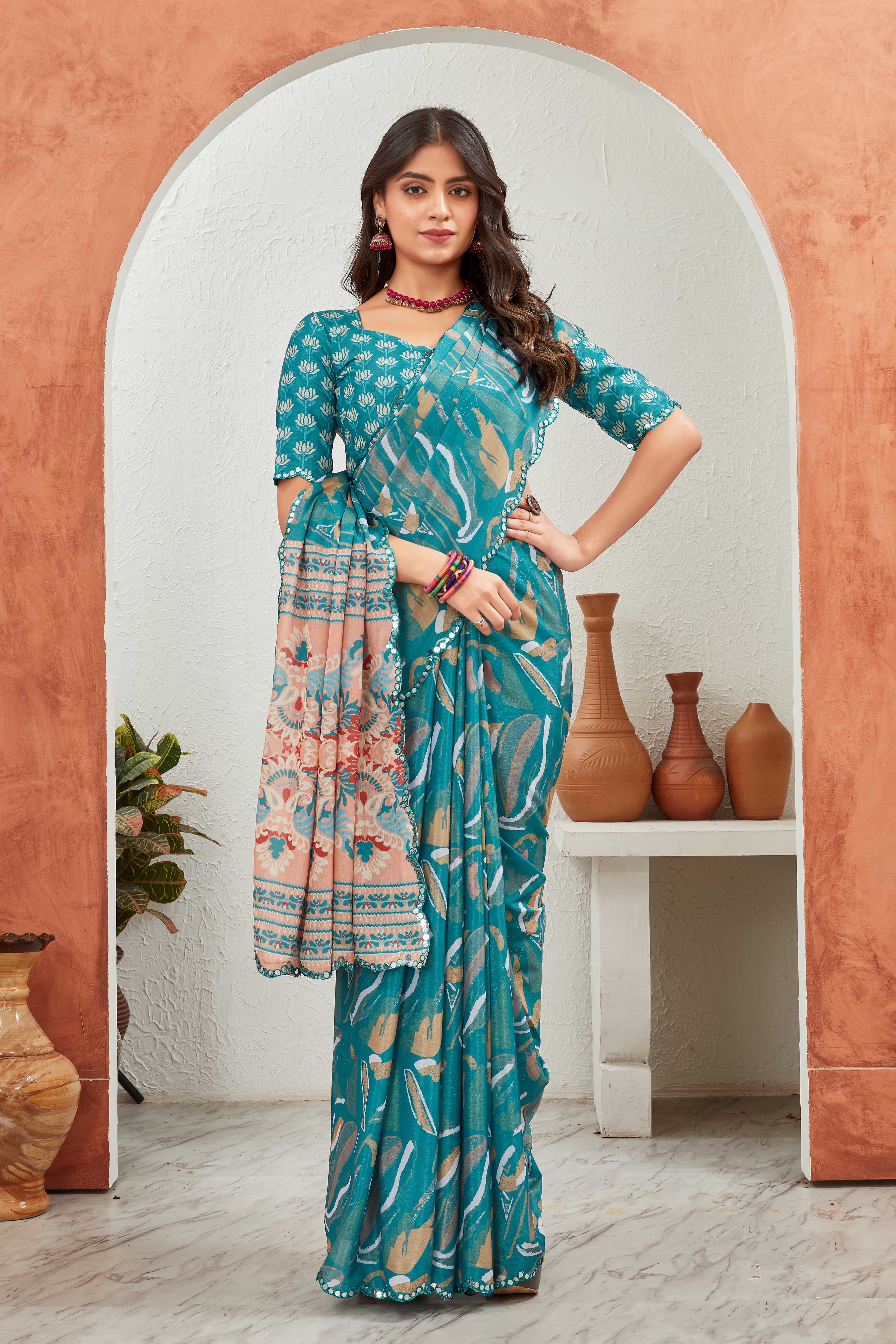Elevate your ethnic wardrobe with this stunning teal printed saree crafted from soft, breathable fabric that drapes beautifully. The saree features an abstract contemporary pattern in soothing shades of teal, beige, and white, highlighted with a delicately designed contrasting pallu in peach and traditional motifs.