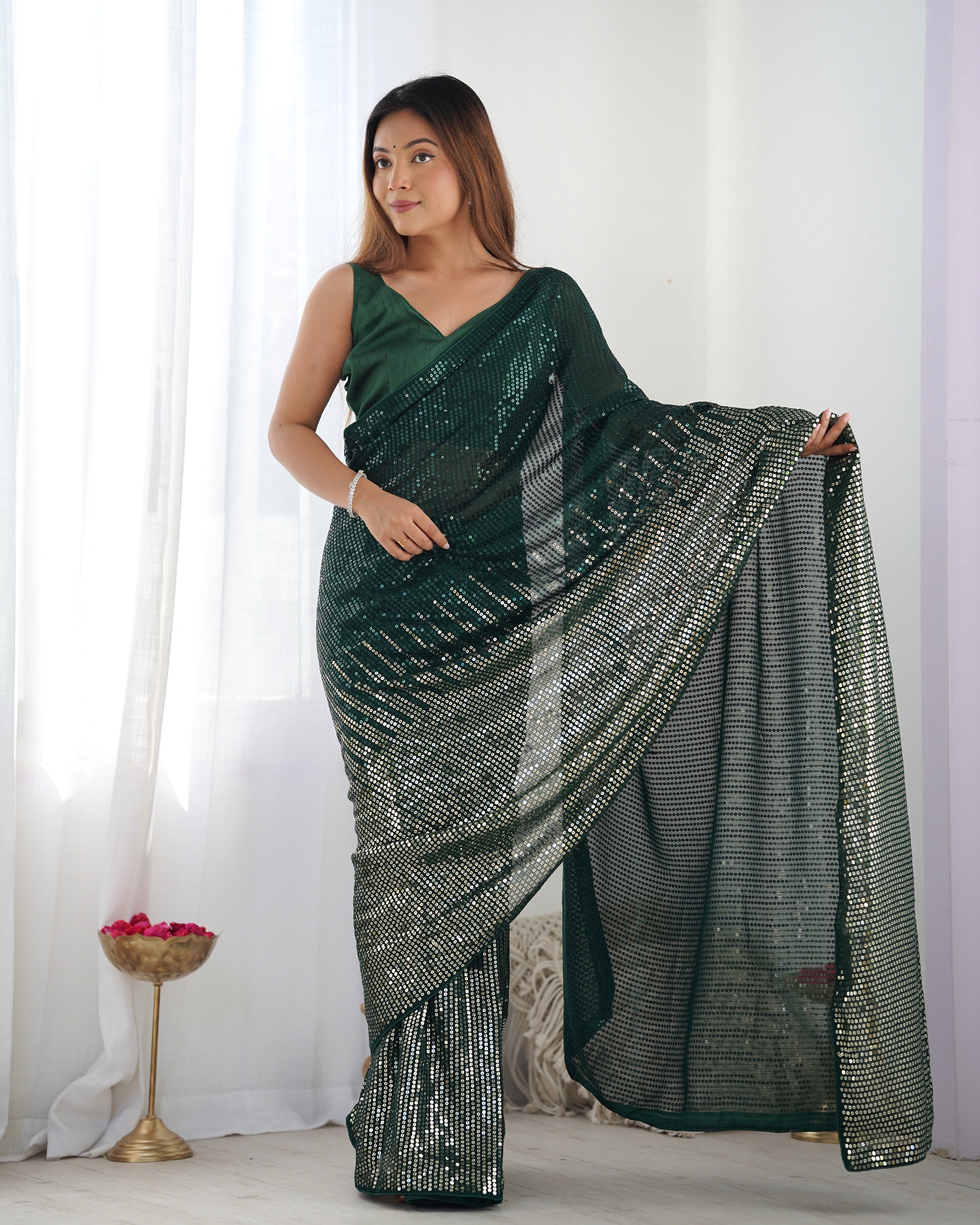 Turn heads in our emerald green sequin saree – a perfect blend of elegance and dazzle. Crafted with precision, this saree features an all-over sequin design that reflects light beautifully, giving you a luxurious glow at every celebration.