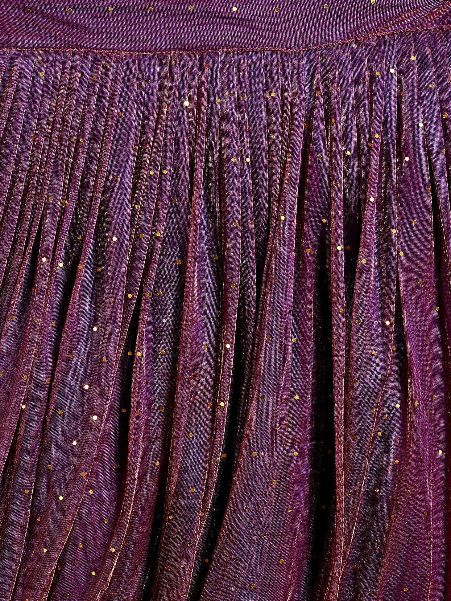 Step into the spotlight with our dazzling wine-colored Emmy lehenga set, designed for the contemporary woman who loves tradition with a twist. This glamorous ensemble includes a structured bustier blouse embellished with golden sequins, a voluminous shimmer lehenga skirt, and a graceful sheer organza dupatta with a soft metallic sheen.