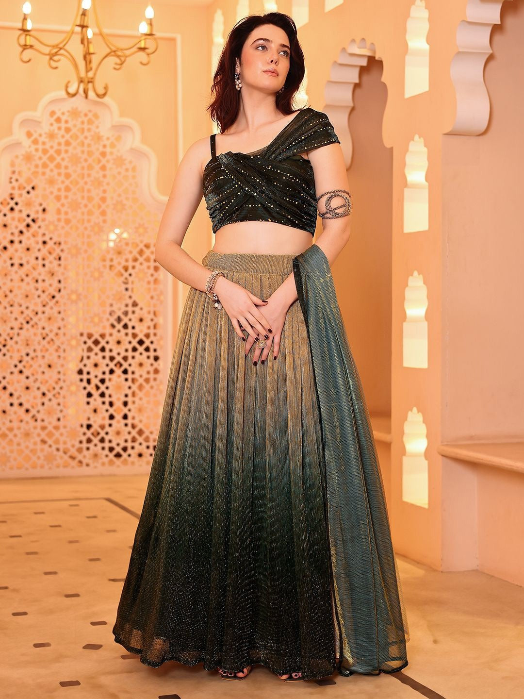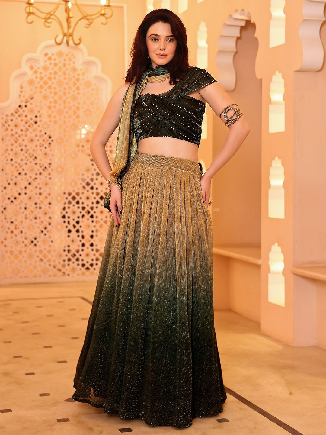 Step into timeless allure with the Enchanted Emerald Ombre Lehenga Set, a luxurious ensemble crafted for evening elegance. The deep forest green gradually blends into golden hues, creating a magical ombre effect. A crisscross asymmetrical blouse with glistening embellishments pairs flawlessly with the pleated shimmer lehenga and matching dupatta.