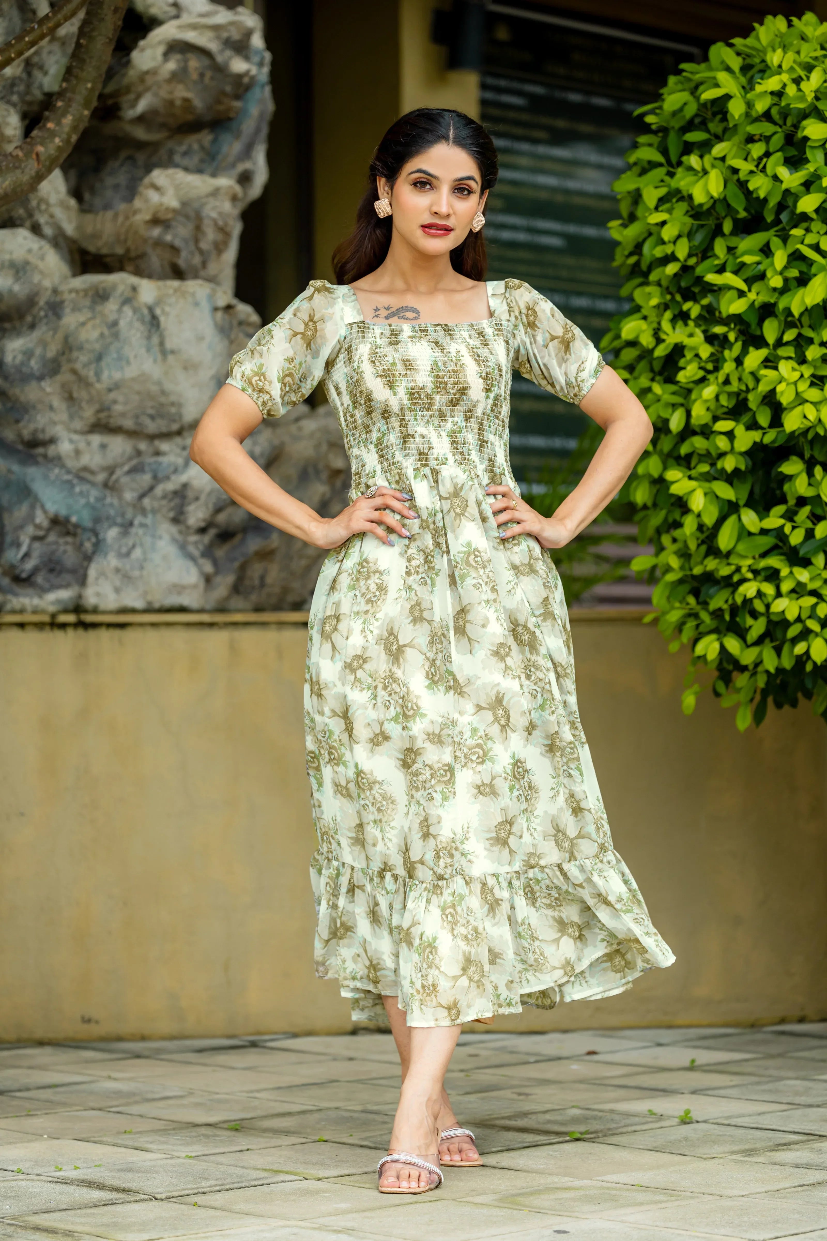 Step into effortless elegance with our Vintage Floral Smocked Maxi Dress. Crafted with soft fabric and adorned with a dreamy sage-green floral print, this dress features a smocked bodice, puff sleeves, and a charming ruffle hem that sways with every step.