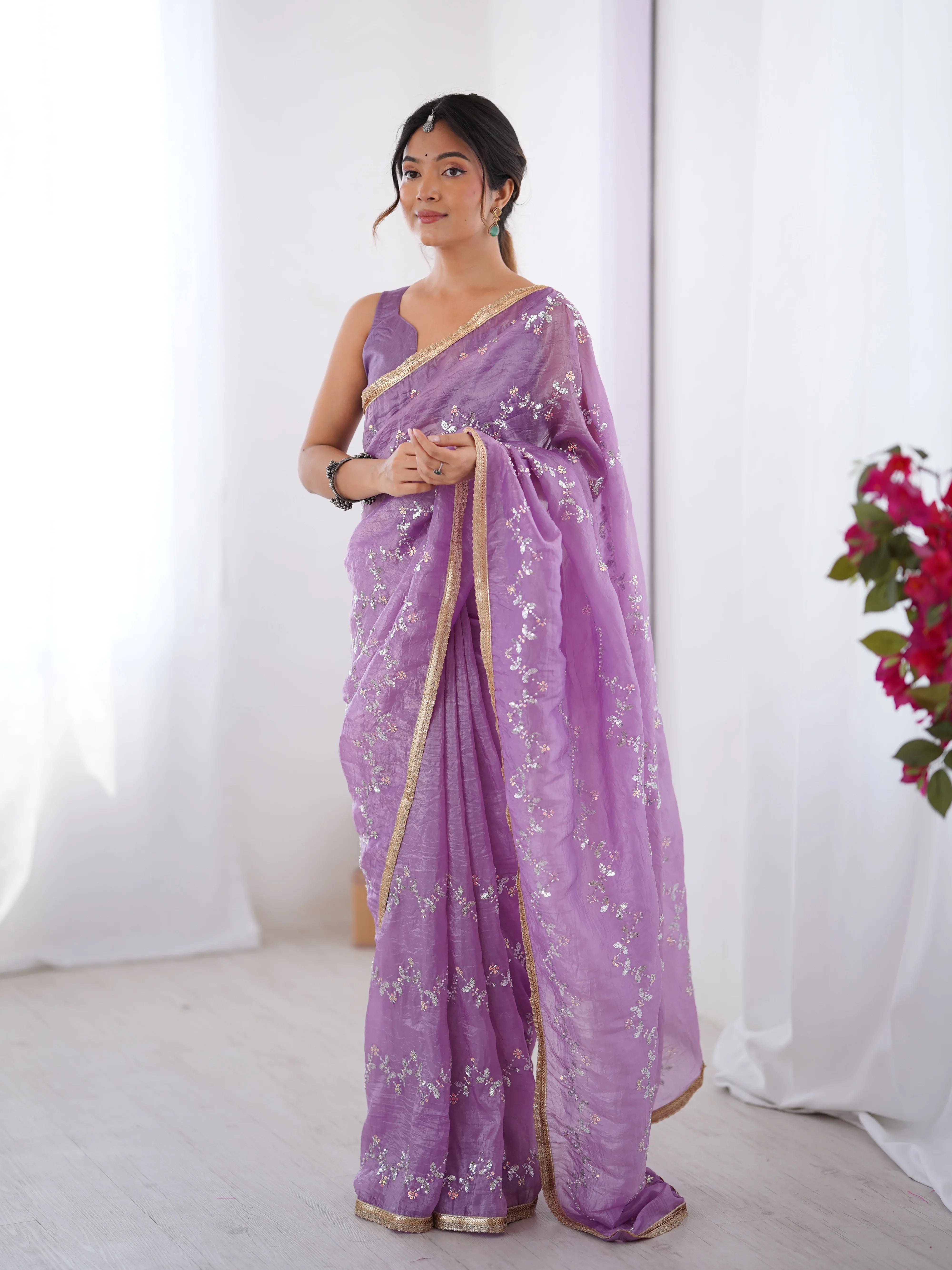 This luminous Onion saree is a celebration of grace and glamour. Crafted from soft organza, it features intricate silver sequin embroidery cascading across the fabric like stardust. A subtle golden zari border enhances the regal aesthetic, while the sleeveless blouse with a structured neckline adds a chic, contemporary edge.