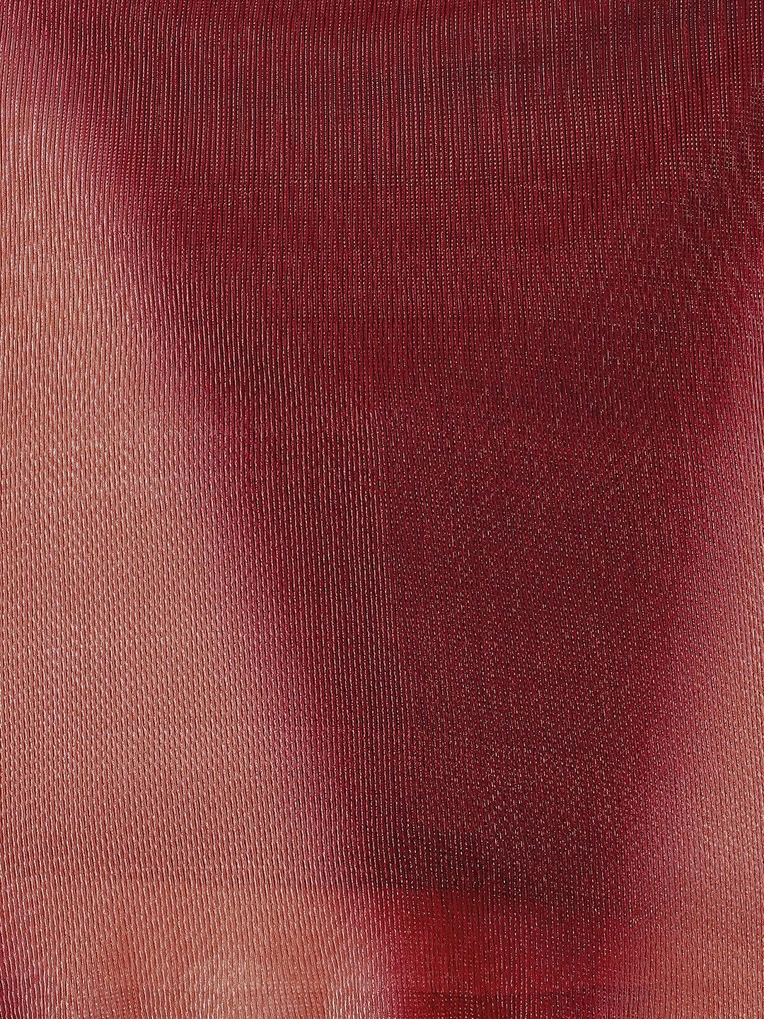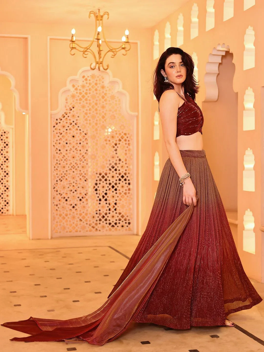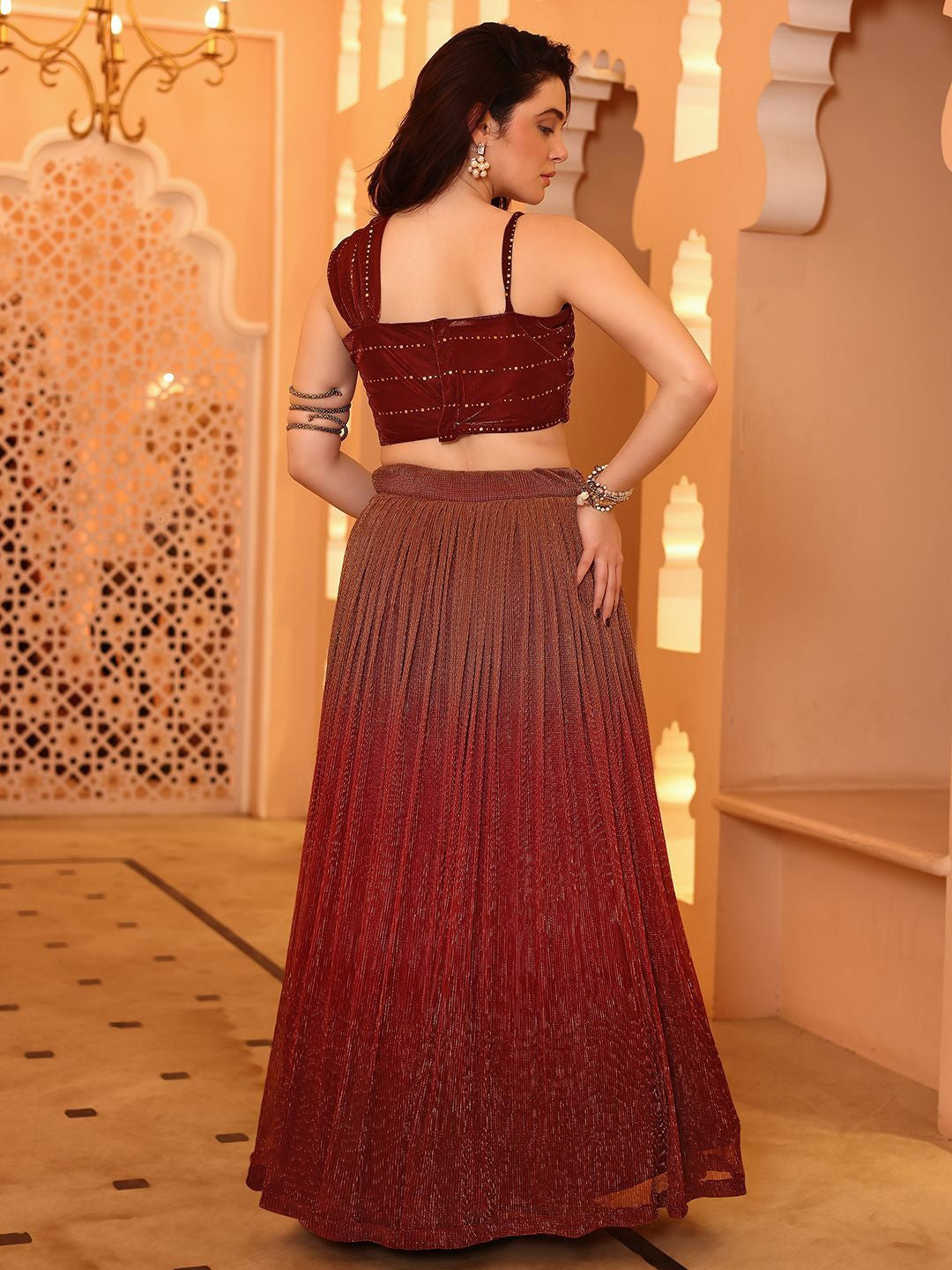 Make an unforgettable entrance with our Garnet Glow Ombre Lehenga Set. Designed for the modern muse with traditional roots, this ensemble blends rich wine-red hues with shimmering fabric and structured elegance. The asymmetrical crisscross blouse features subtle embellishments, while the ombre pleated lehenga skirt creates captivating movement.