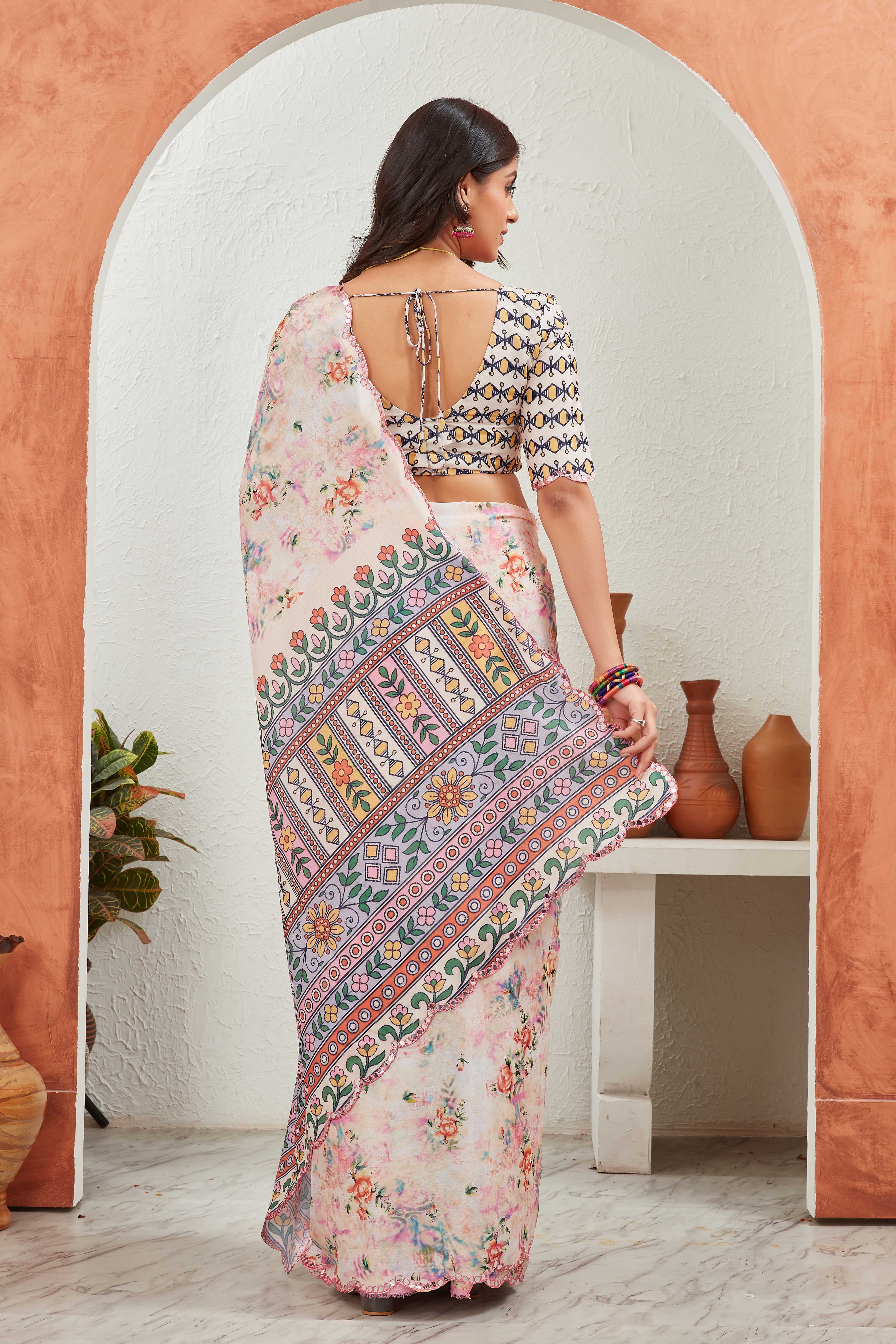 Paired with a unique contrast blouse in navy and beige geometric print, this saree is perfect for festive occasions, casual celebrations, or elegant day events.