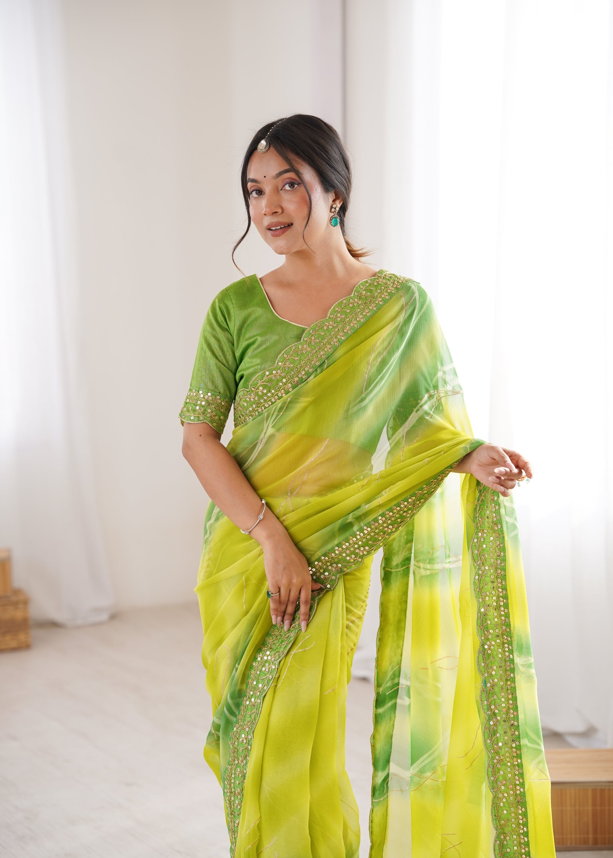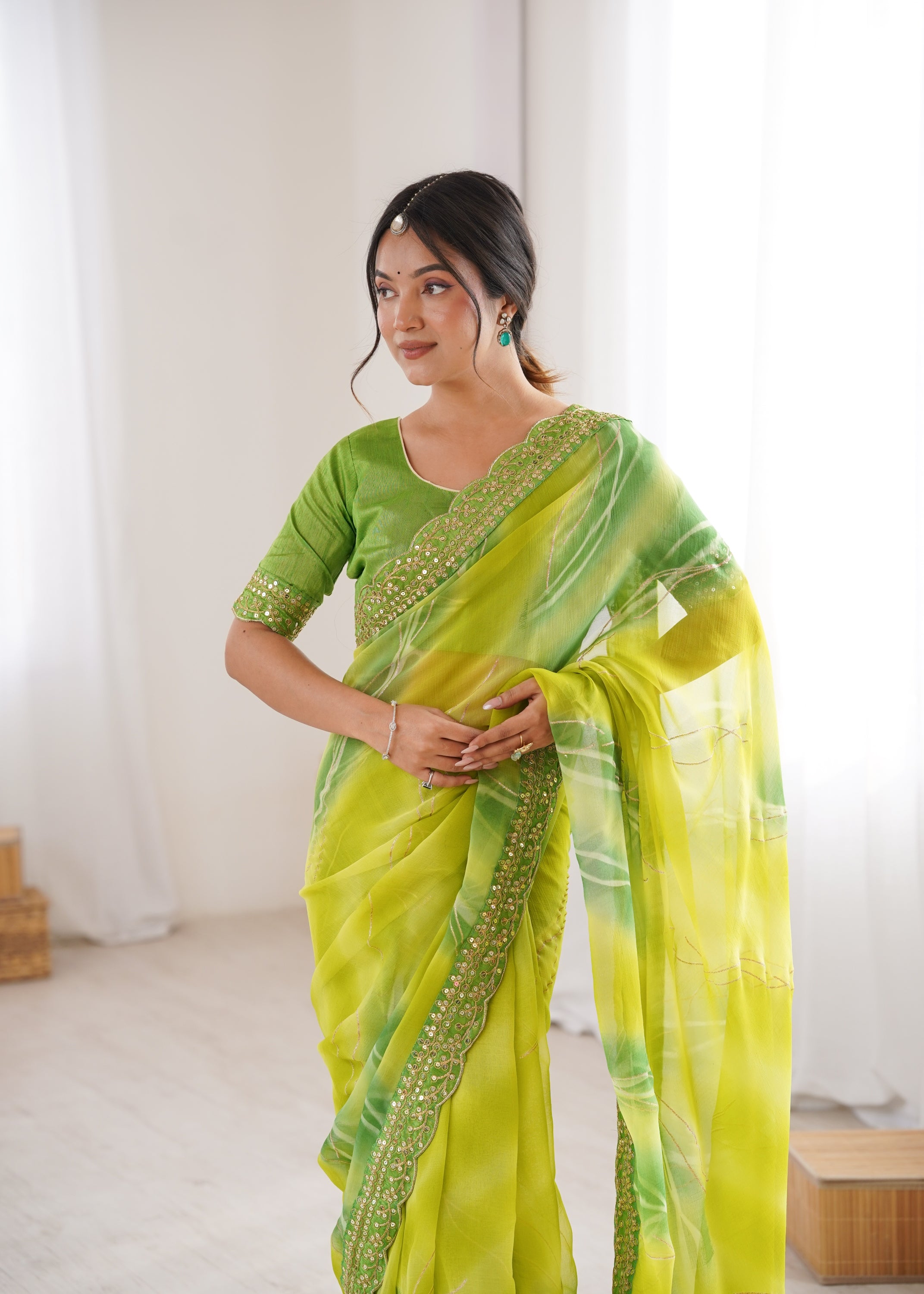 Step into effortless elegance with this Mehendi Green Georgette Chiffon saree, designed to capture grace in every movement. The sheer, lightweight fabric is beautifully accentuated with delicate gold embroidery along the border, adding a refined festive touch. Subtle woven patterns across the saree enhance its charm, while the flowy pallu creates a soft, ethereal silhouette. Paired with a matching blouse featuring coordinated embroidery, this saree is perfect for festive occasions, weddings, and sophisticated daytime celebrations.
