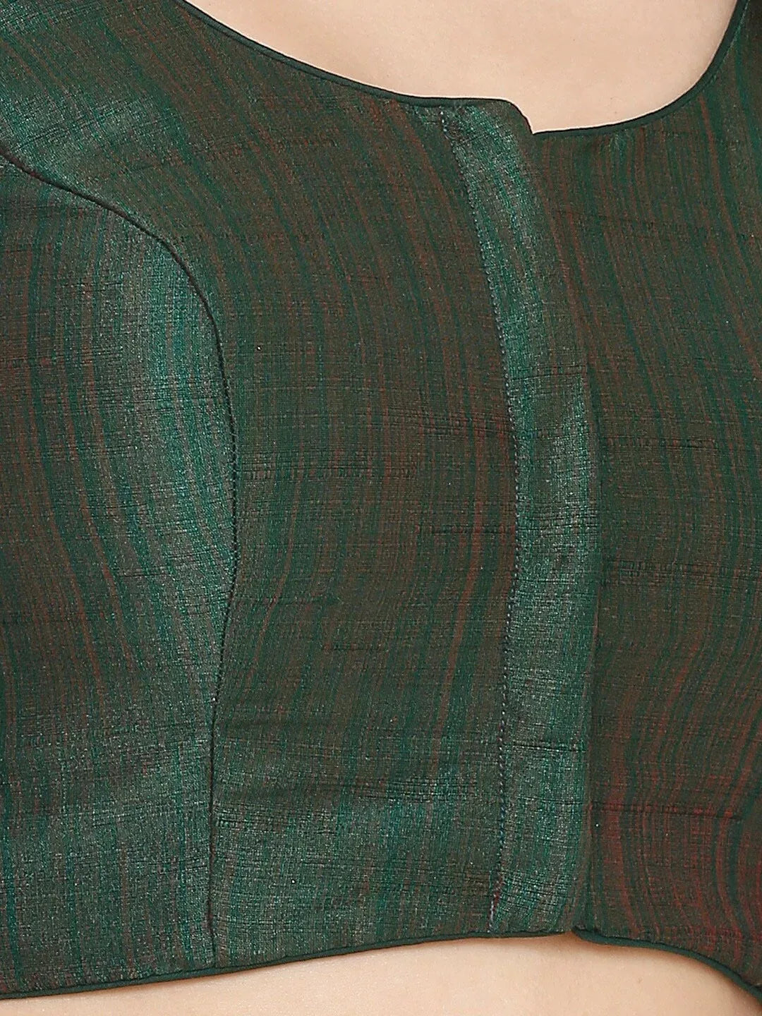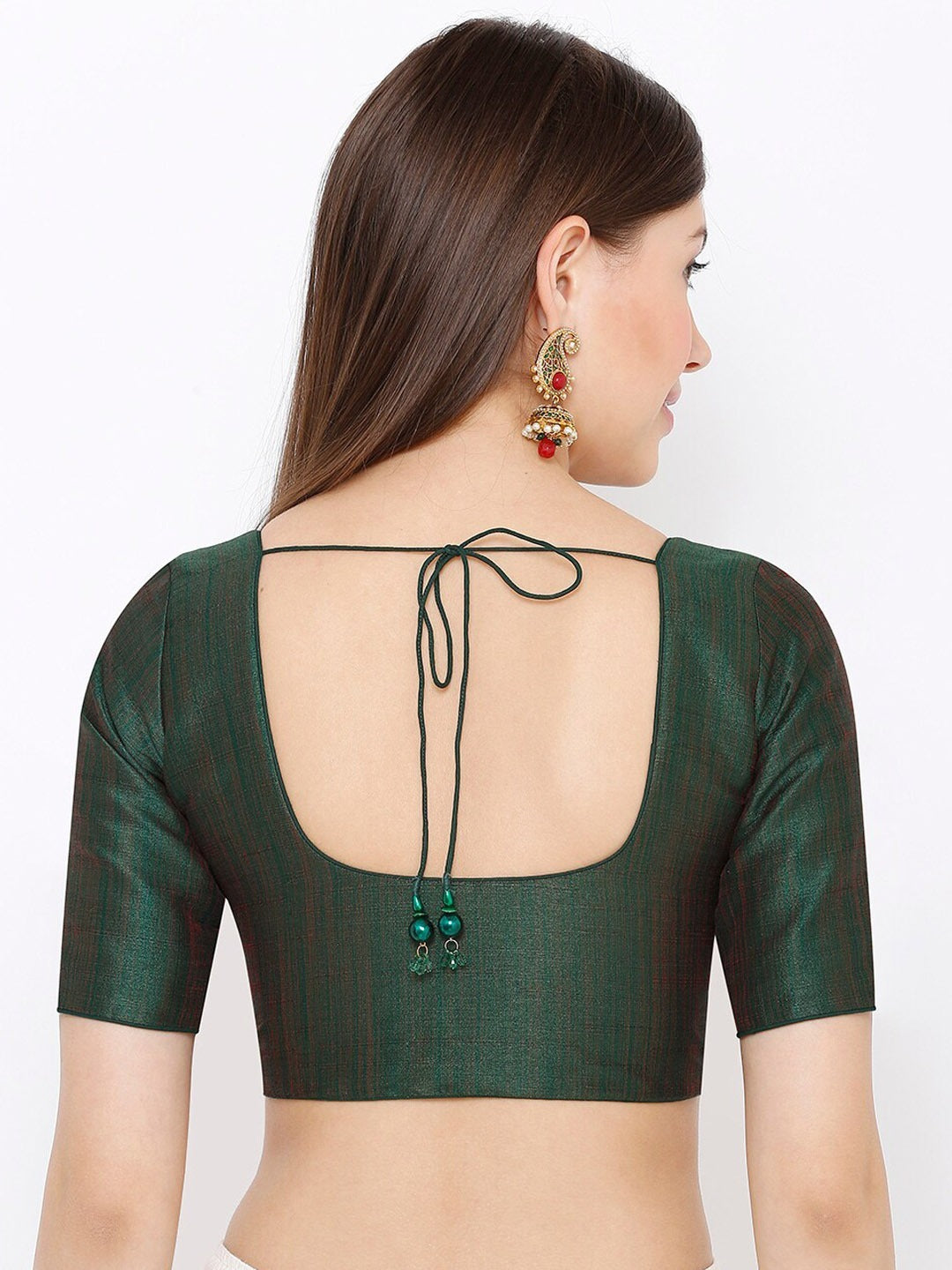 Turn heads with this stunning Green readymade blouse featuring a deep scoop neckline and elegant elbow-length sleeves. Designed with a sleek front hook closure and tailored fit, it’s the perfect match for festive sarees and lehengas.