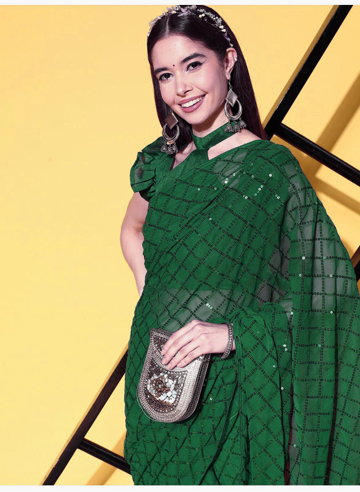 Turn heads with this bold and glamorous Green Sequin Saree. Crafted on soft Georgette fabric, it features all-over geometric diamond embroidery with delicate sequin detailing that adds the perfect amount of sparkle.