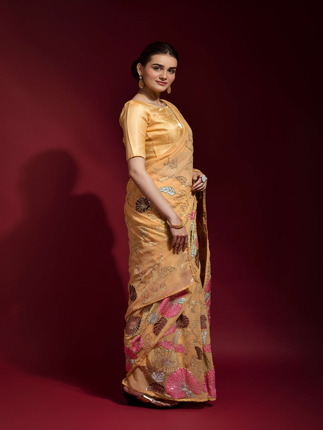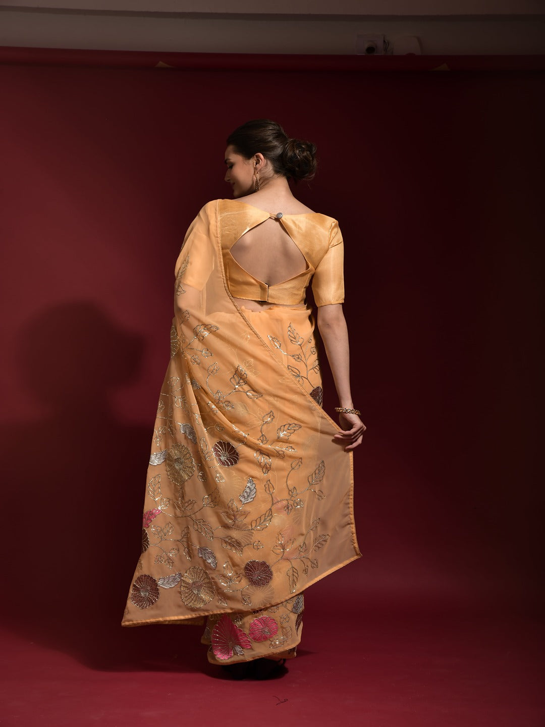 Wrap yourself in effortless elegance with the Gulabo Chiku Georgette Saree. This captivating saree features a delicate chiku (nude beige) base in soft Georgette, adorned with gorgeous thread and sequin embroidery in shades of pink, gold, and silver floral motifs.