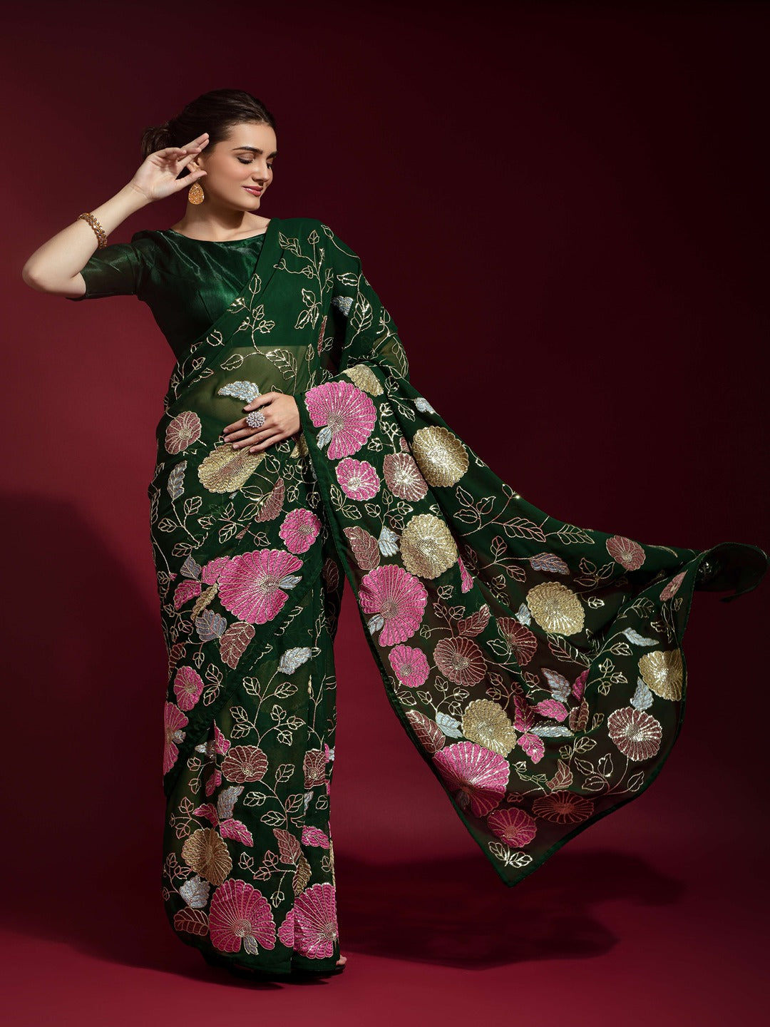 The Gulabo Green Georgette Saree embodies charm and celebration. Set on a lush bottle green georgette fabric, this saree features eye-catching floral embroidery in pink, gold, and silver hues, detailed with thread and sequins for a luxurious finish.