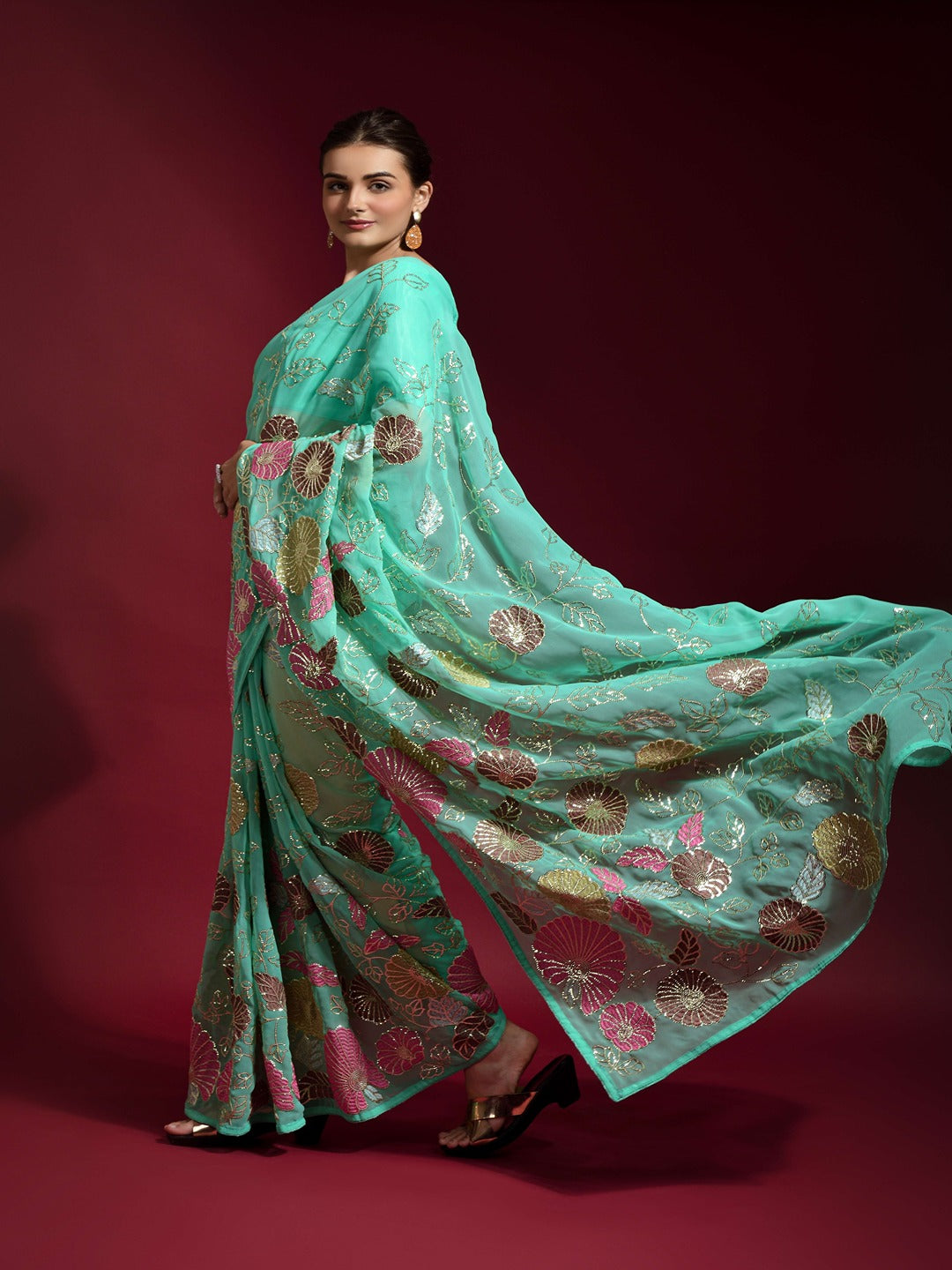 The Gulabo Sky Blue Georgette Saree is a breath of fresh style. This serene saree features a pastel blue base enriched with floral thread and sequin embroidery in stunning shades of pink, gold, and silver.