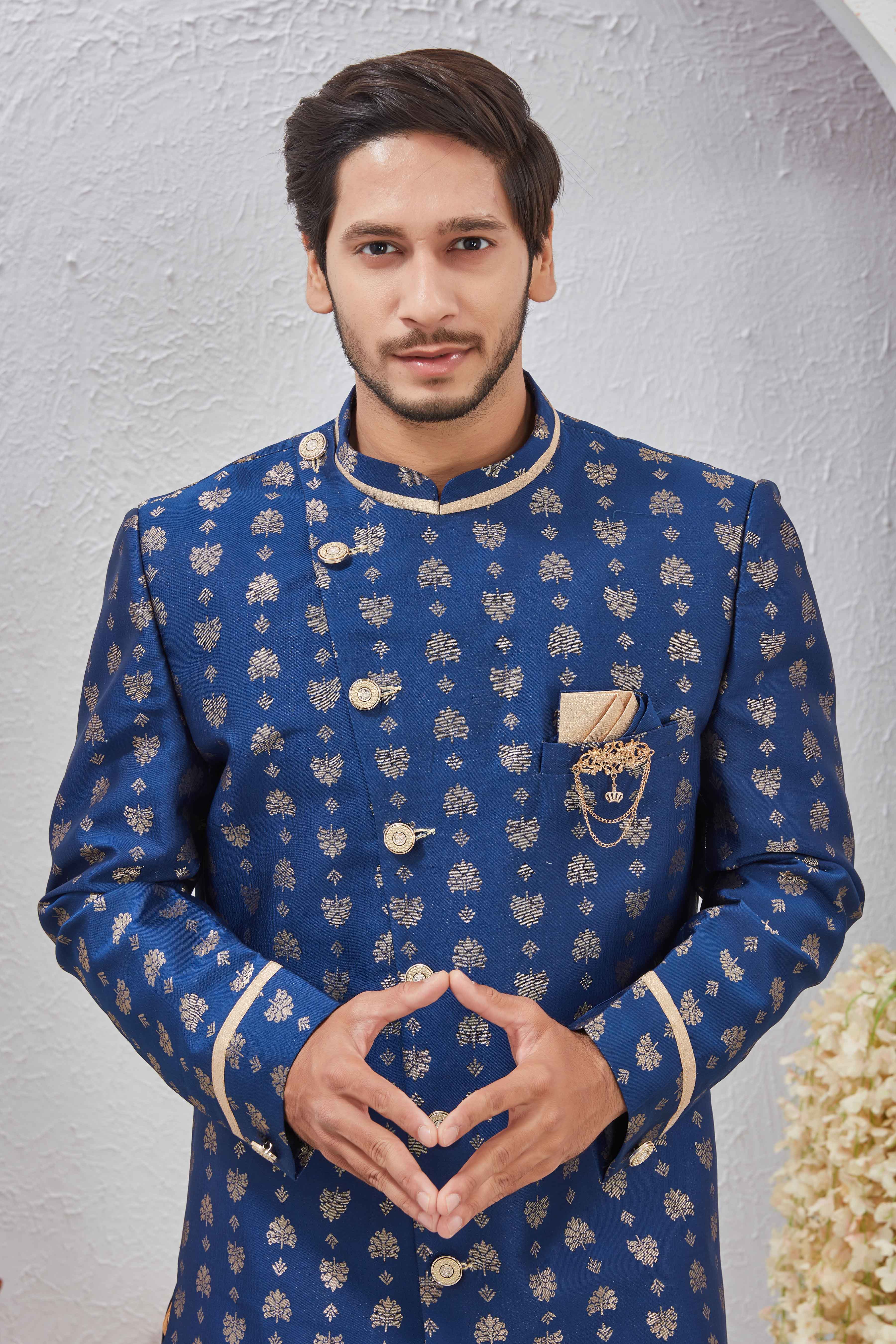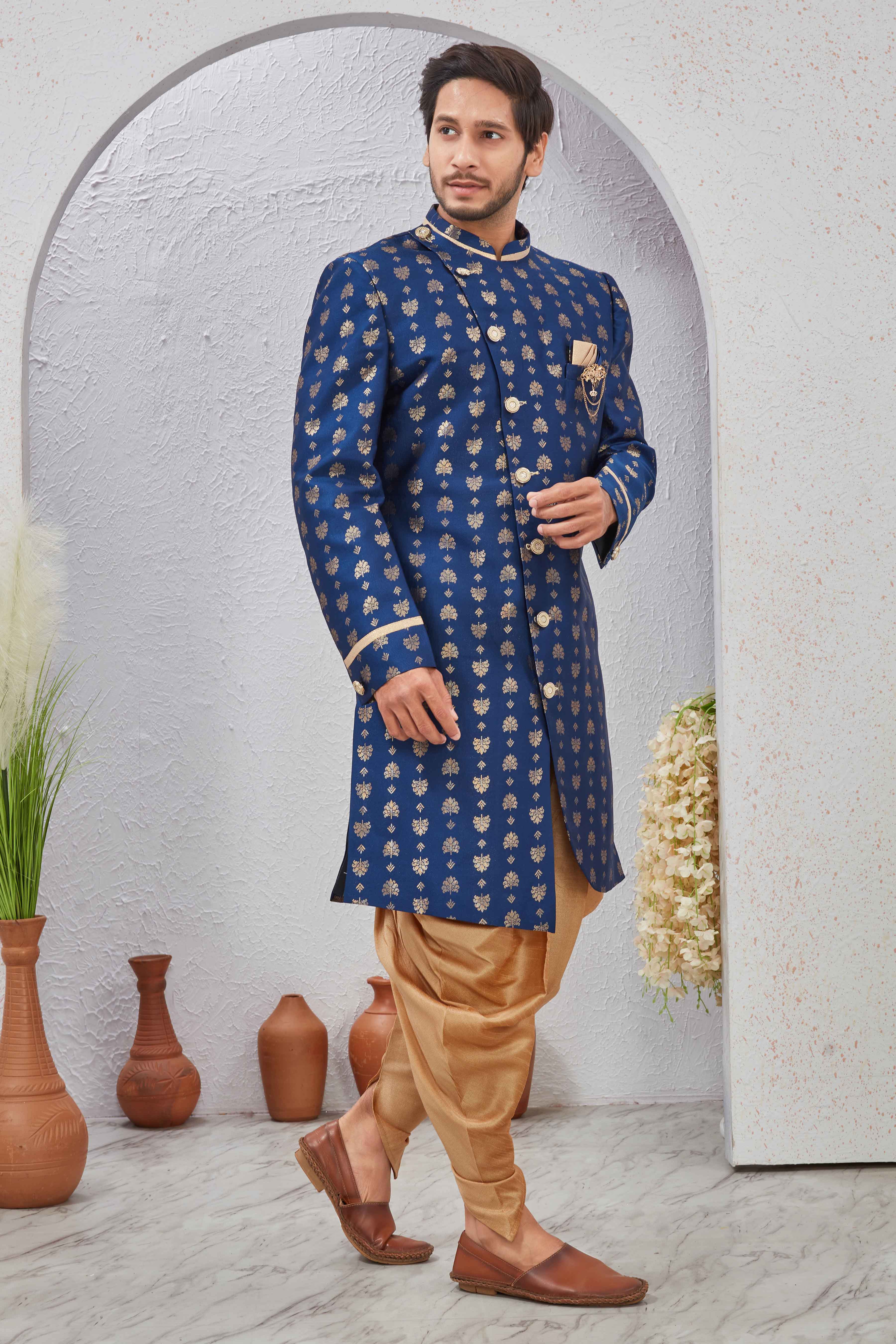 Command attention at your next grand event with our exquisite Regal Blue & Gold Brocade Indo-Western Sherwani Set. Crafted from rich Blue fabric, this long-length sherwani features intricate golden floral brocade work that exudes opulence. The elegant mandarin collar and button-down front with ornate golden buttons add to its sophisticated charm. A unique brooch detail on the chest elevates its festive appeal. Paired with comfortable and stylish golden art silk dhoti pants, this ensemble is perfect for weddings, sangeet ceremonies, festive gatherings, or any occasion where you want to make a lasting impression.