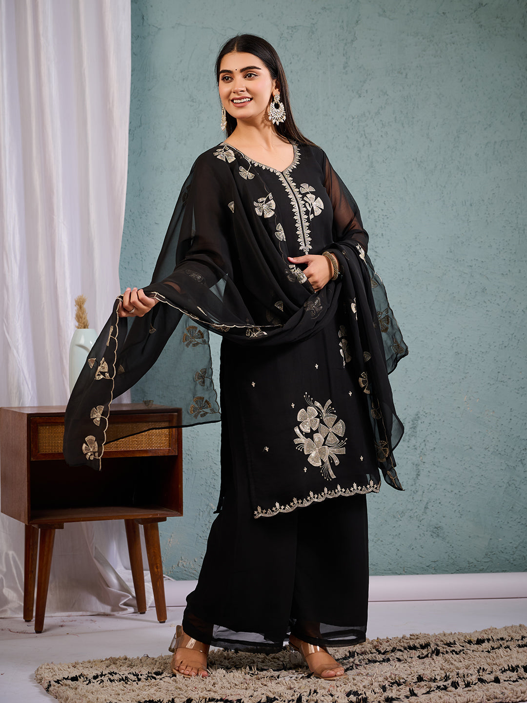 Elevate your ethnic charm with this stunning Black Embroidered Georgette Suit Set. Crafted from premium quality georgette fabric, this three-piece ensemble features elegant floral embroidery, sheer full sleeves, and a flattering V-neckline. Perfect for festive occasions, weddings, or elegant evening gatherings..