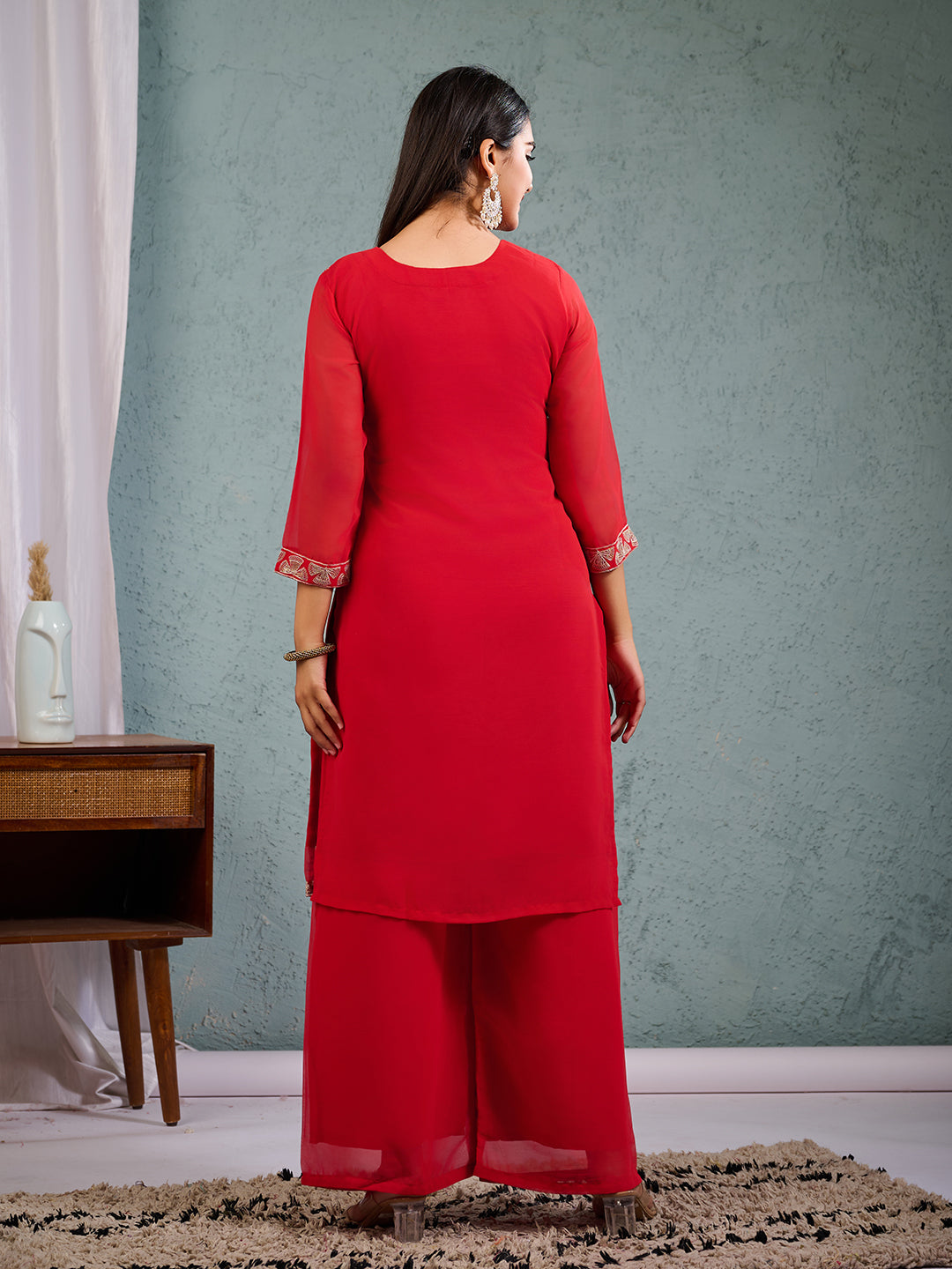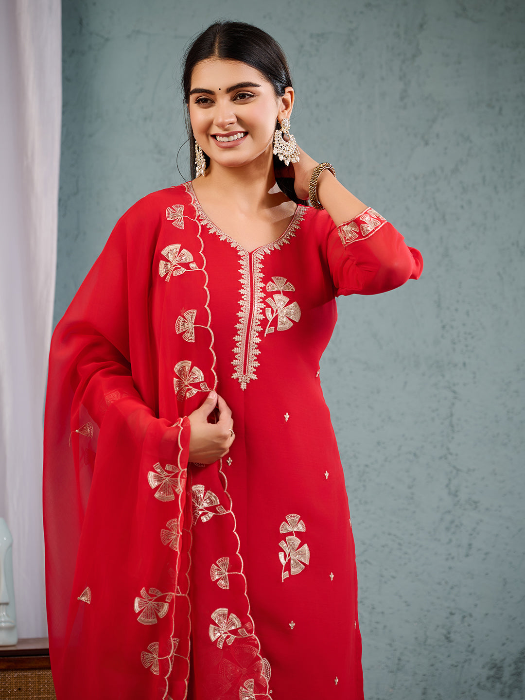 Elevate your ethnic charm with this stunning Red Embroidered Georgette Suit Set. Crafted from premium quality georgette fabric, this three-piece ensemble features elegant floral embroidery, sheer full sleeves, and a flattering V-neckline. Perfect for festive occasions, weddings, or elegant evening gatherings..