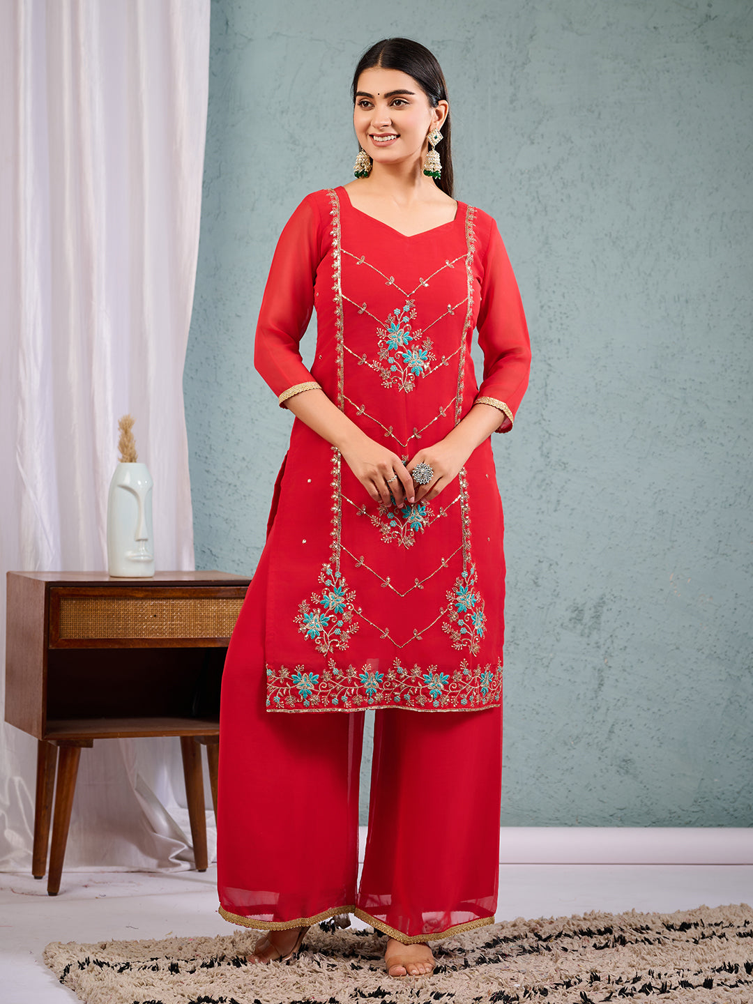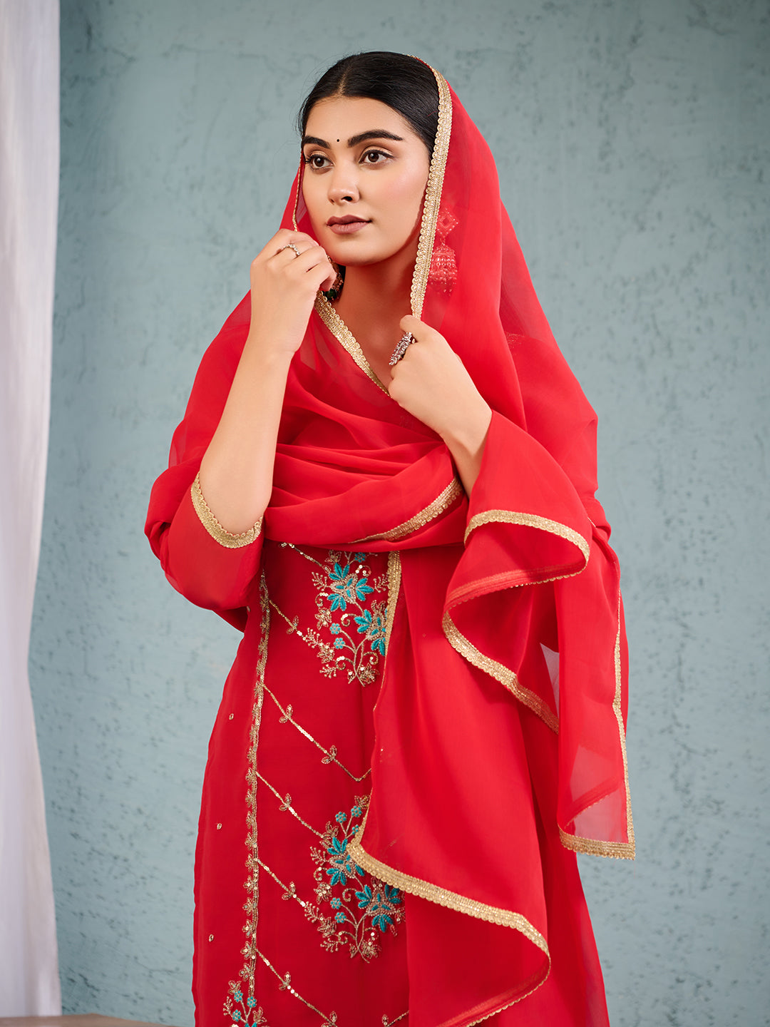 Make a statement with this elegant Wine Georgette suit, beautifully detailed with intricate thread embroidery work. The sheer dupatta with a golden border adds a regal touch, perfect for festive occasions, weddings, or special gatherings.