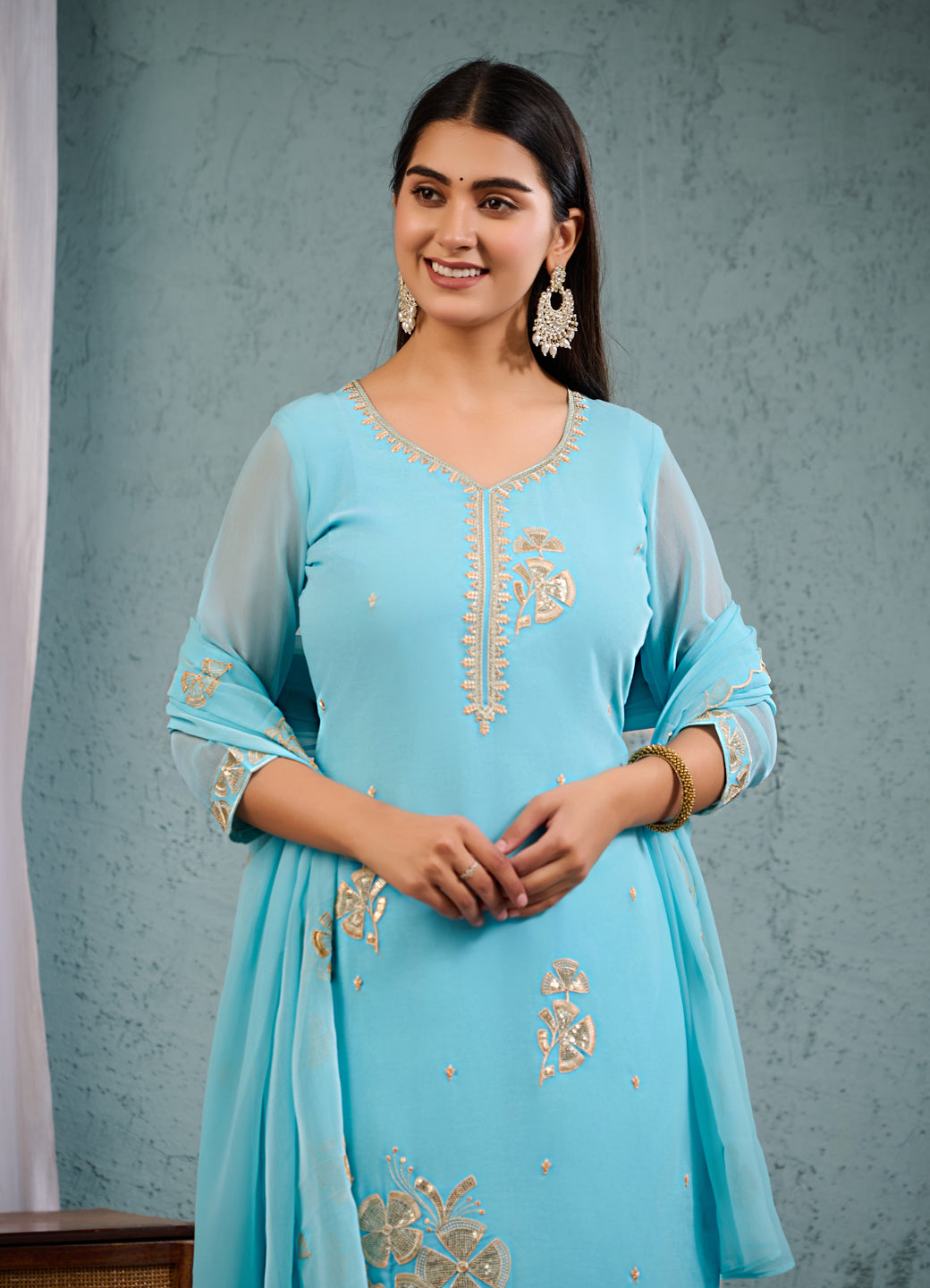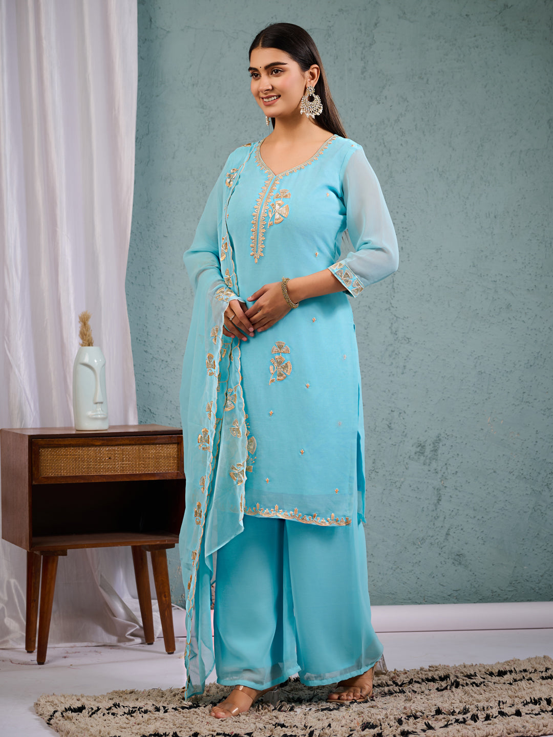 Elevate your ethnic charm with this stunning Sky Blue Embroidered Georgette Suit Set. Crafted from premium quality georgette fabric, this three-piece ensemble features elegant floral embroidery, sheer full sleeves, and a flattering V-neckline. Perfect for festive occasions, weddings, or elegant evening gatherings..