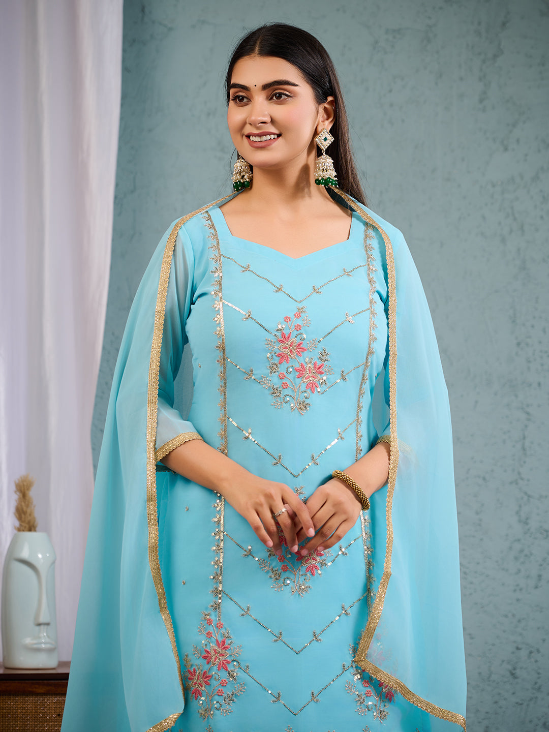 Make a statement with this elegant Wine Georgette suit, beautifully detailed with intricate thread embroidery work. The sheer dupatta with a golden border adds a regal touch, perfect for festive occasions, weddings, or special gatherings.