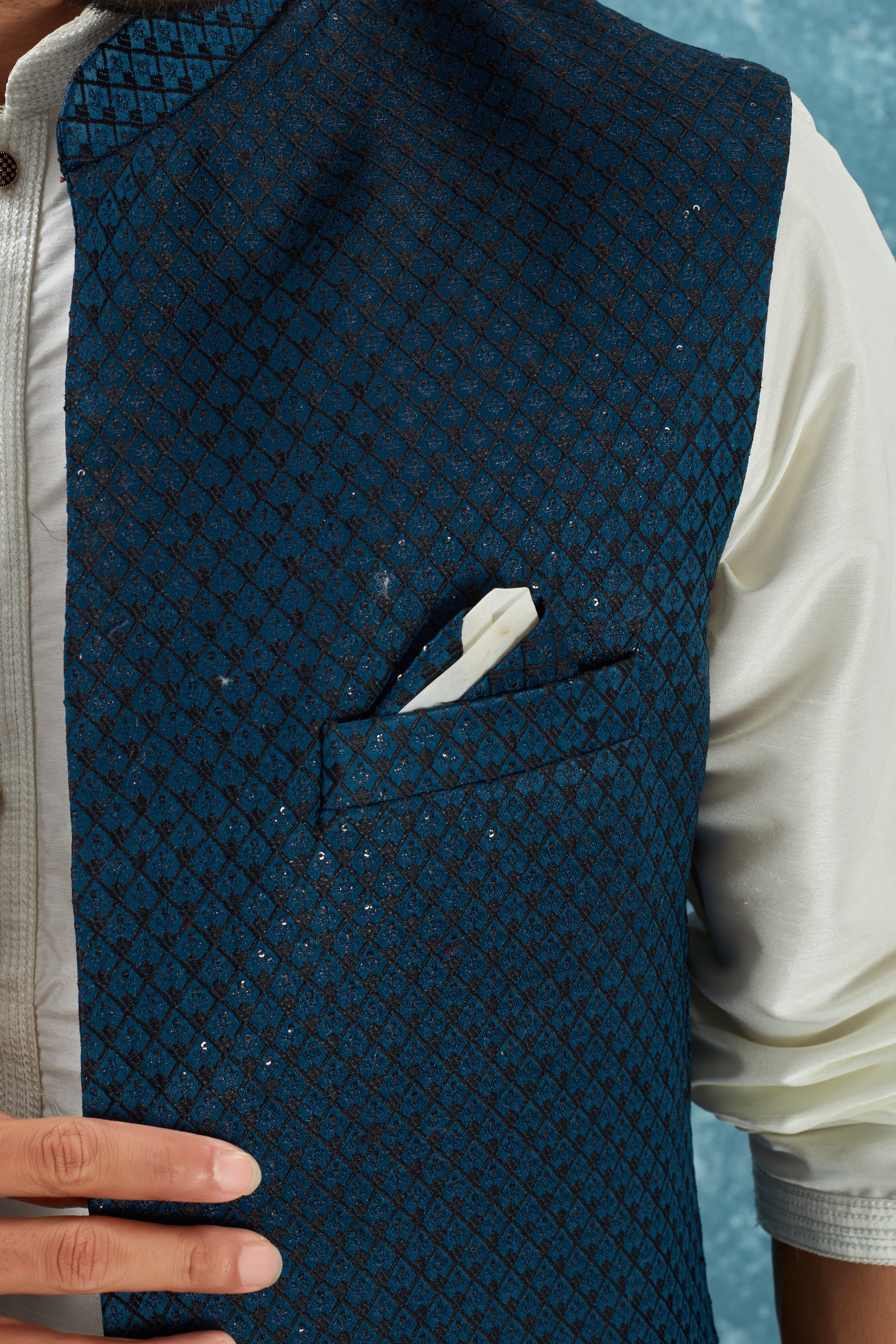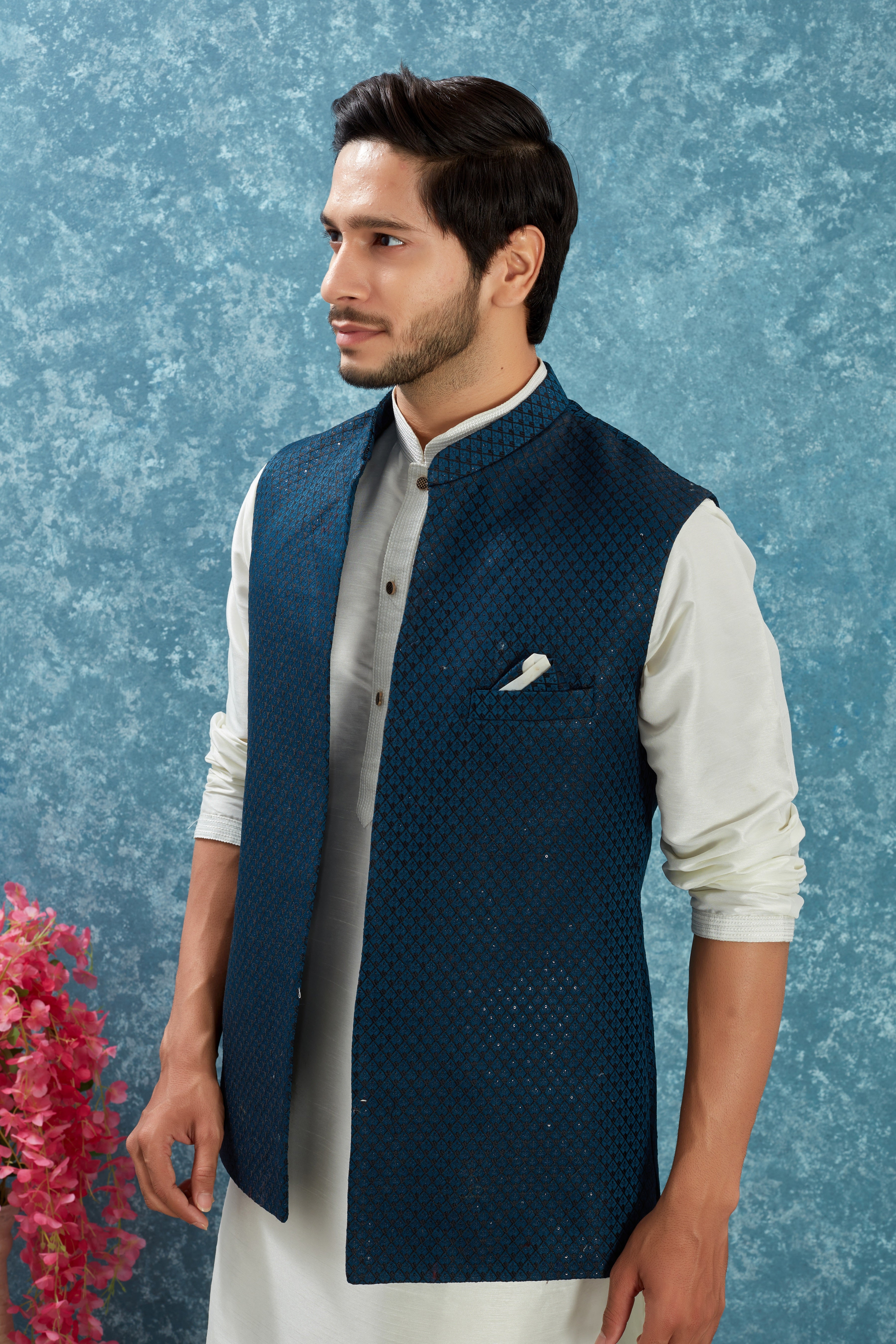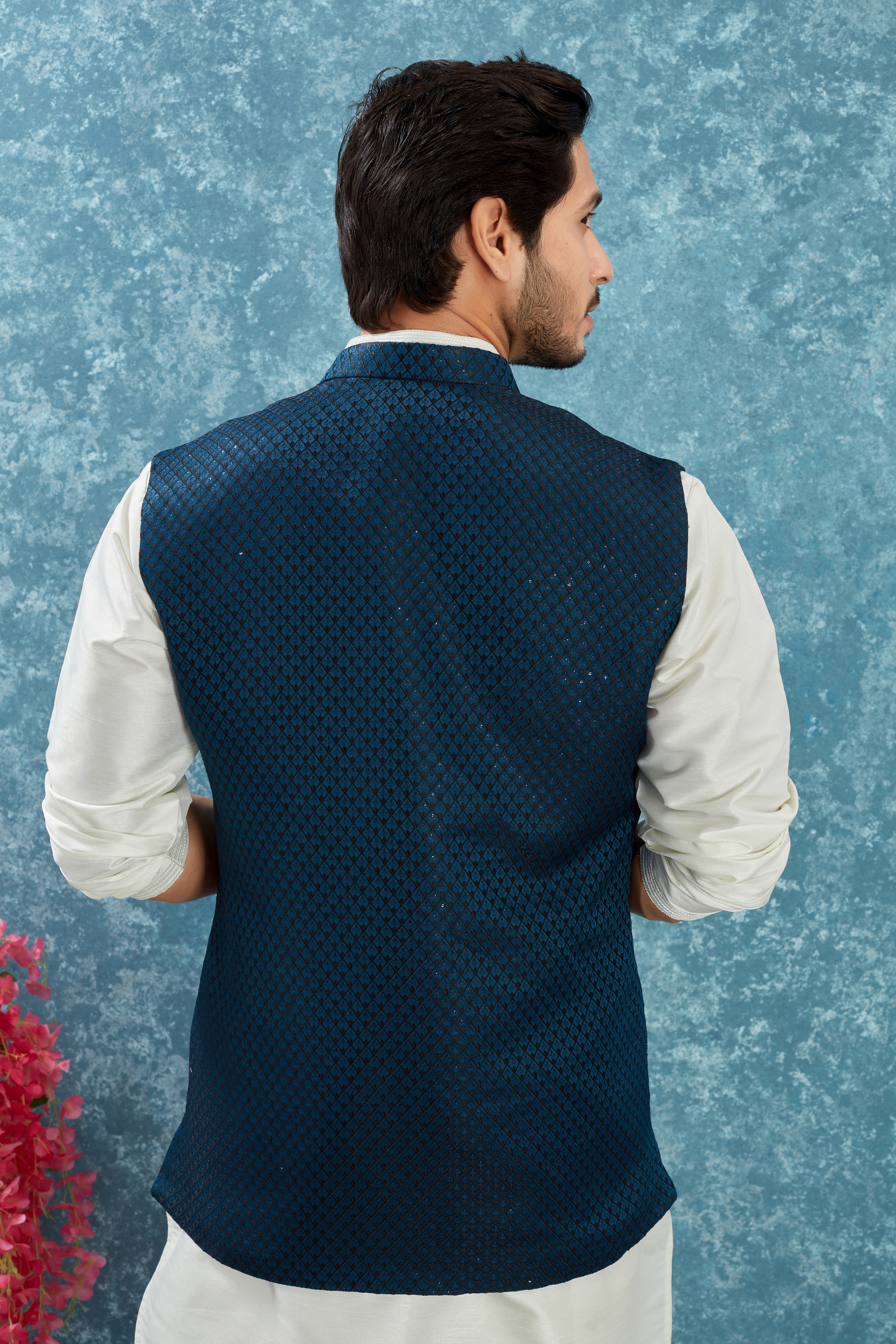 Step into timeless elegance with our Teal Blue Brocade Nehru Jacket paired with a classic Solid kurta. This ensemble brings together traditional style and modern sophistication, making it perfect for festive events, weddings, and formal gatherings.