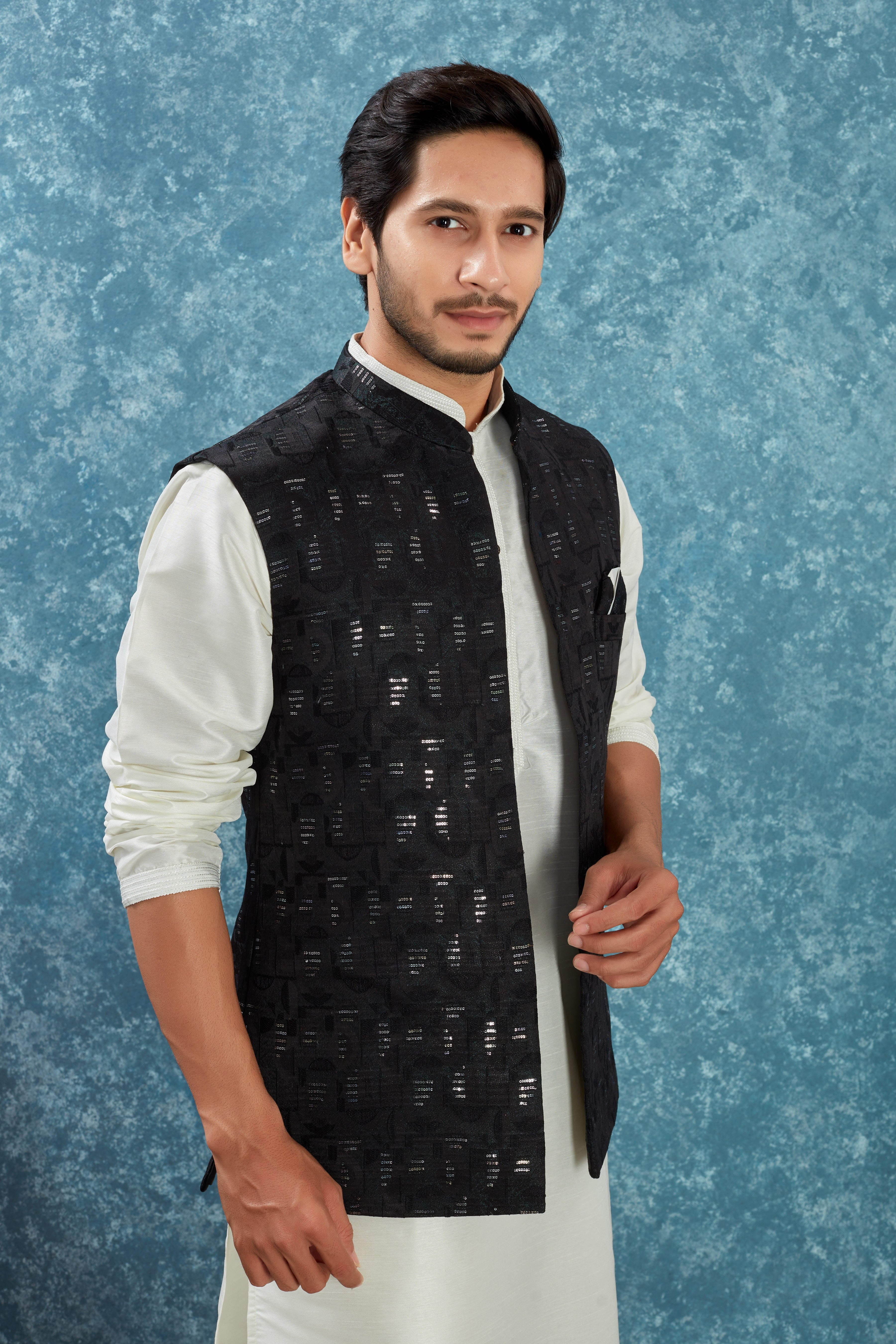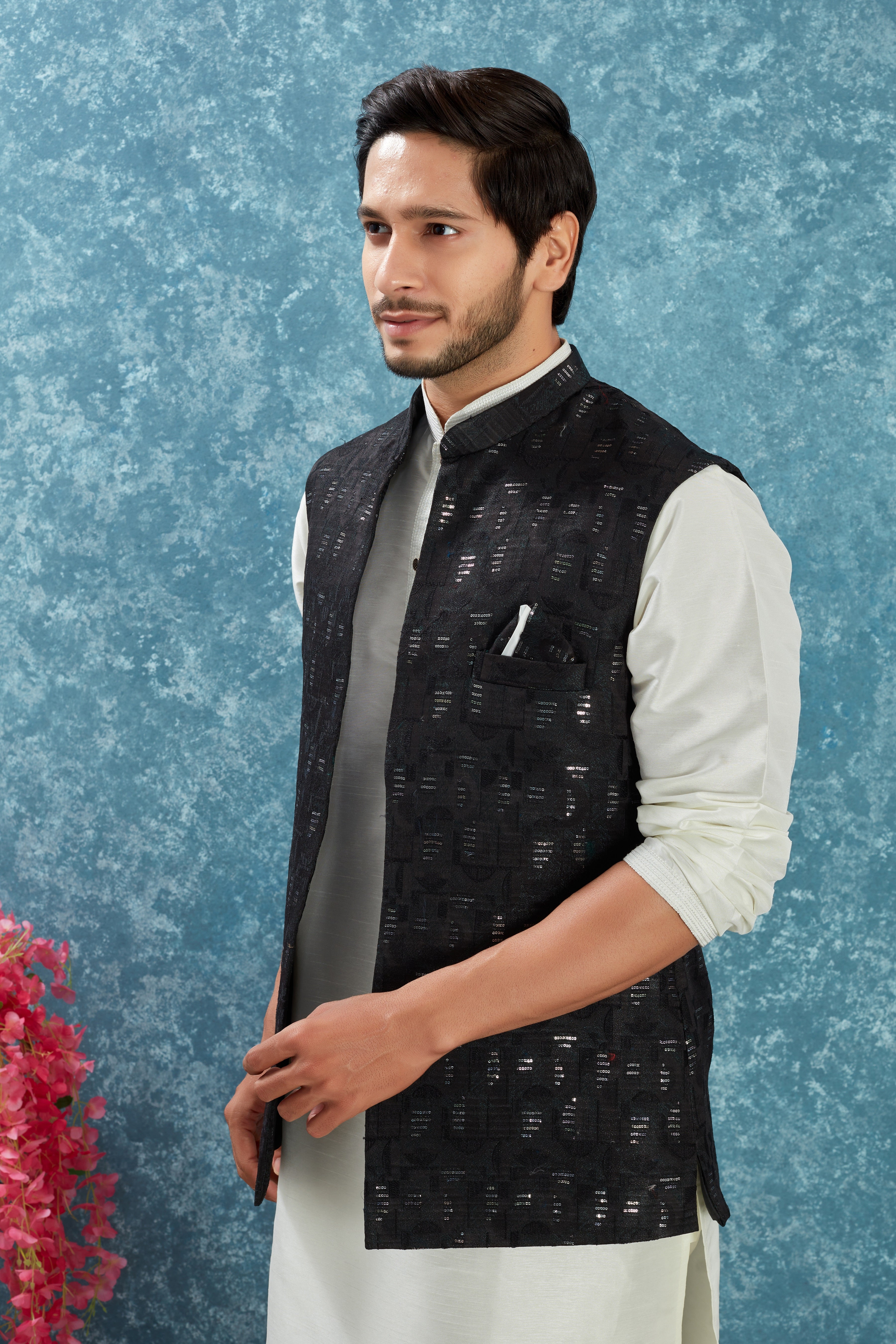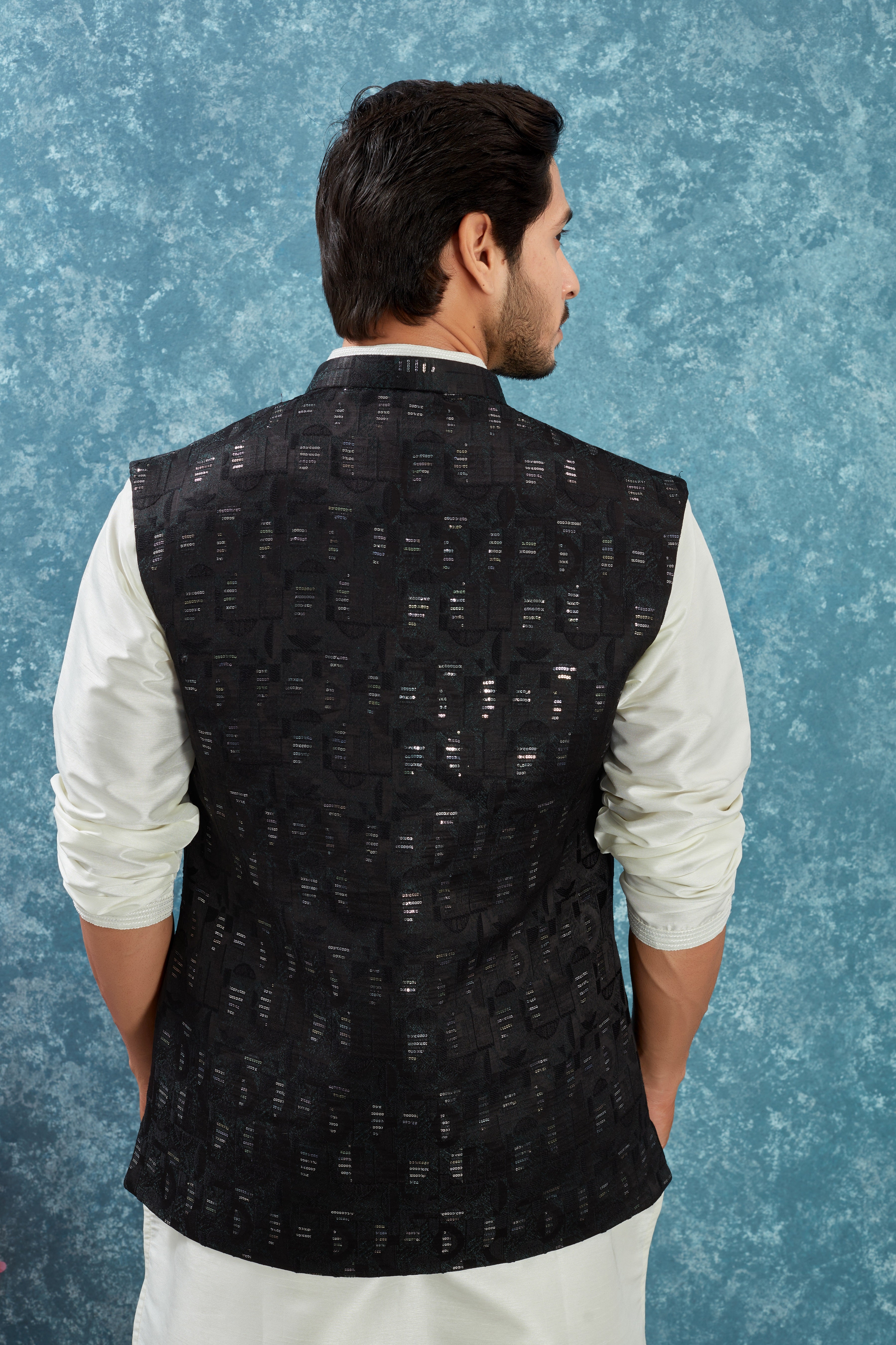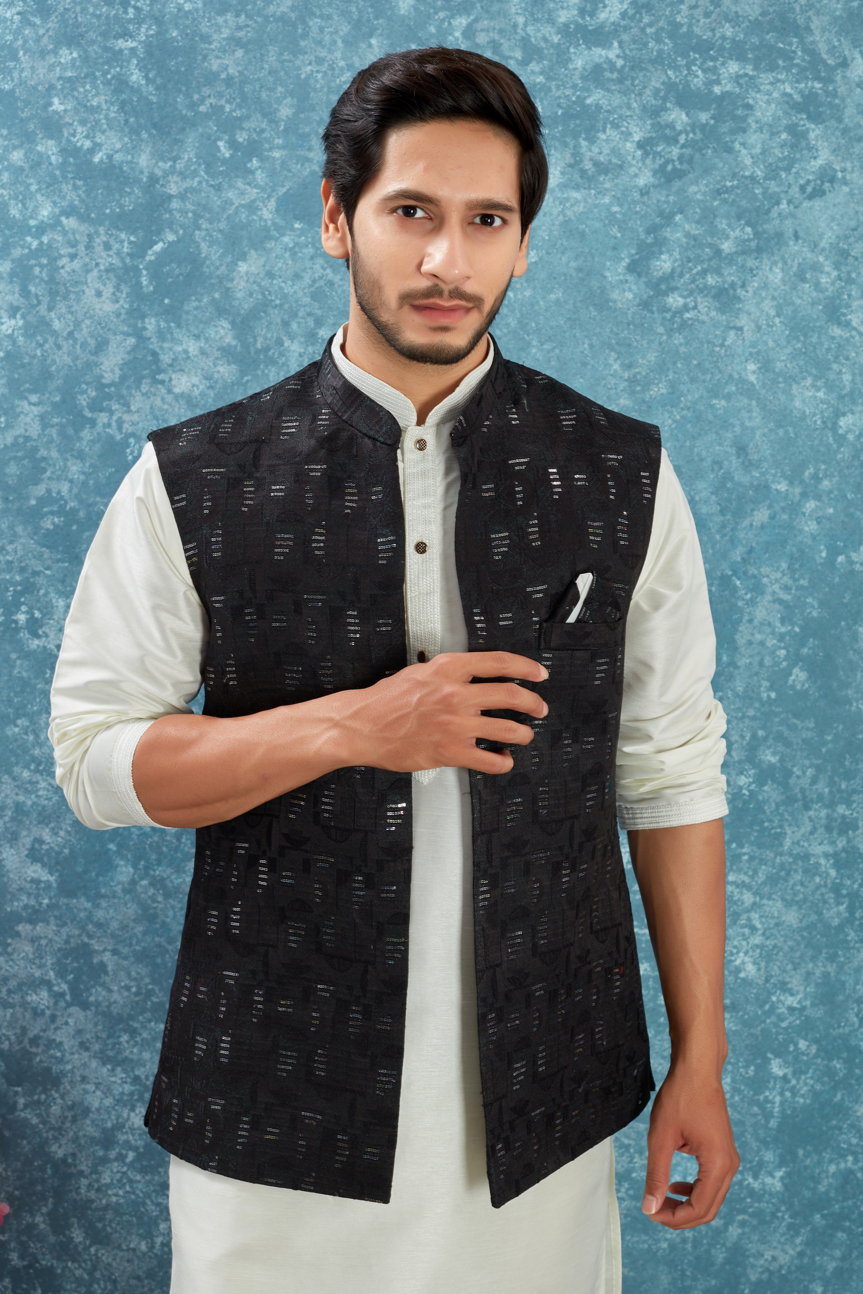 Step into timeless elegance with our Black Brocade Nehru Jacket paired with a classic Solid kurta. This ensemble brings together traditional style and modern sophistication, making it perfect for festive events, weddings, and formal gatherings.