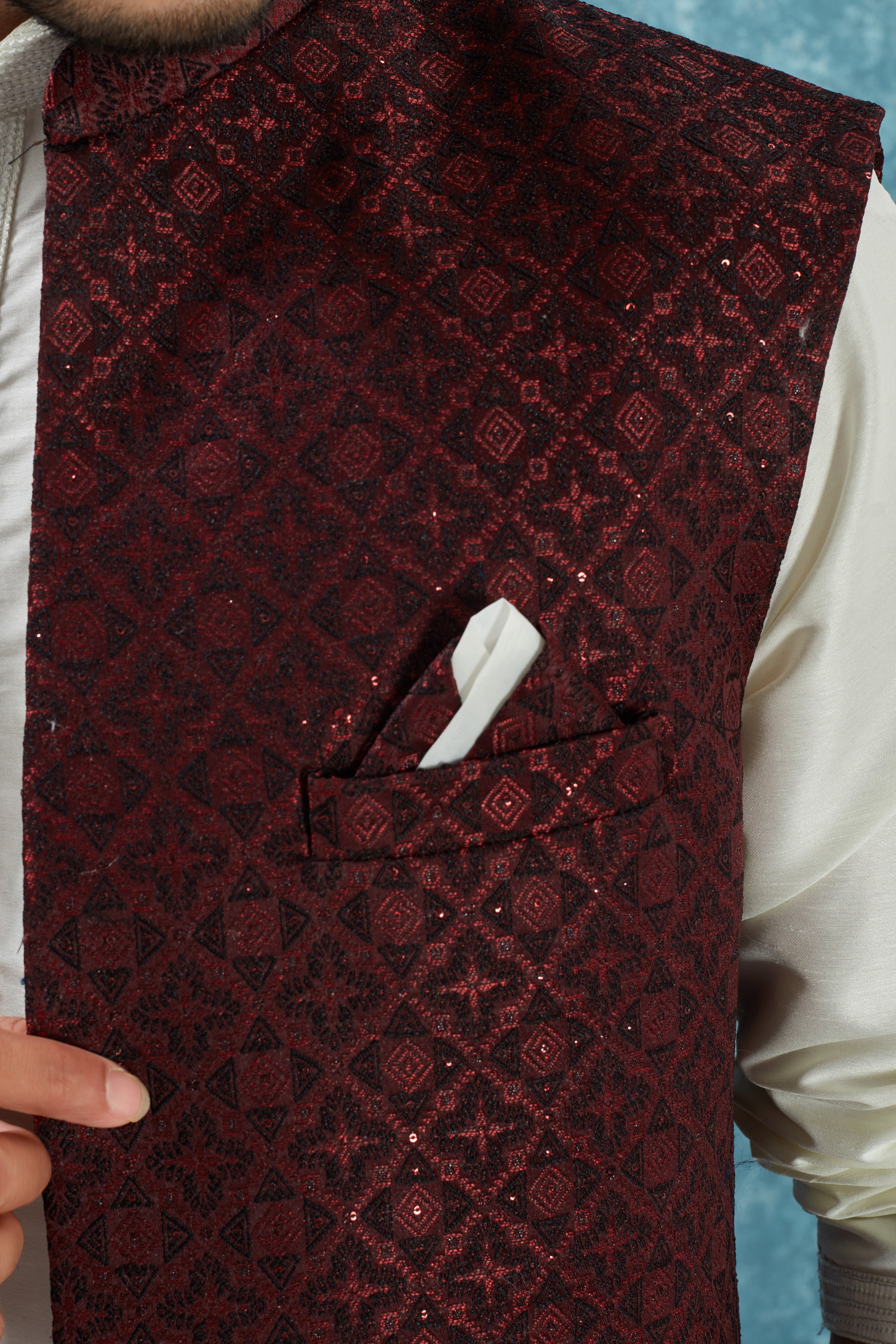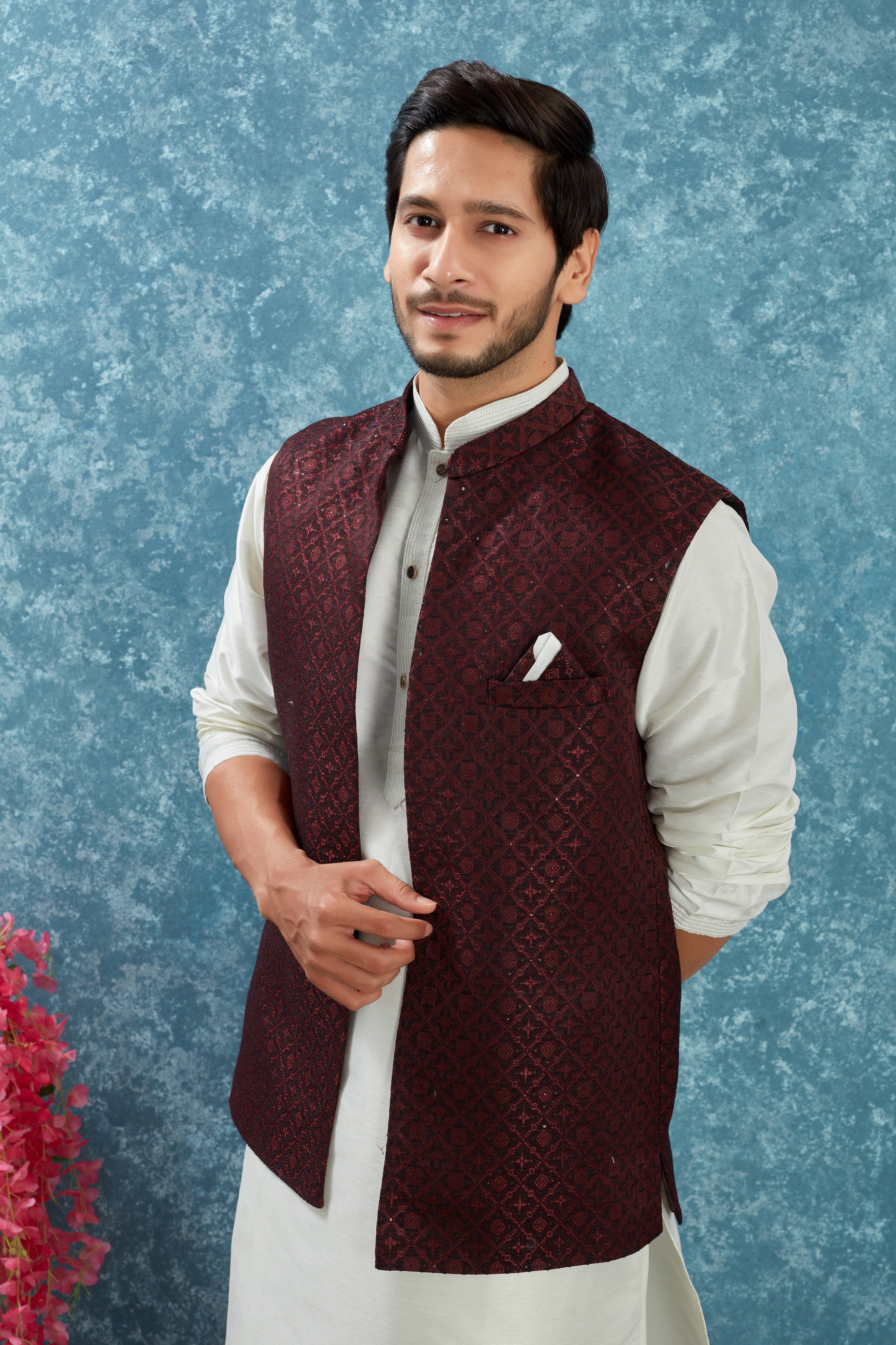Step into timeless elegance with our Maroon Brocade Nehru Jacket paired with a classic Solid kurta. This ensemble brings together traditional style and modern sophistication, making it perfect for festive events, weddings, and formal gatherings.