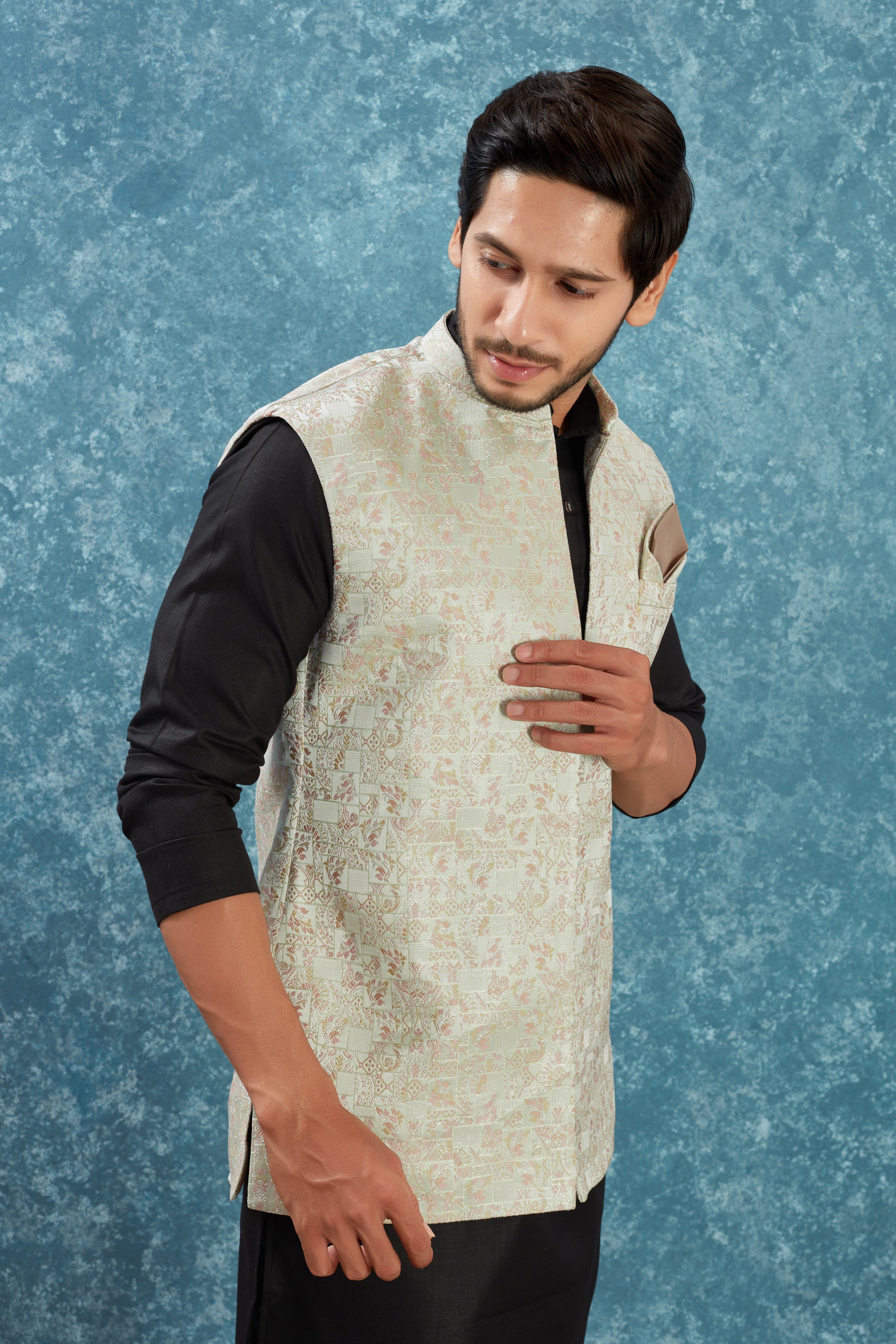 Step into timeless elegance with our Light Green Brocade Nehru Jacket paired with a classic Black kurta. This ensemble brings together traditional style and modern sophistication, making it perfect for festive events, weddings, and formal gatherings.