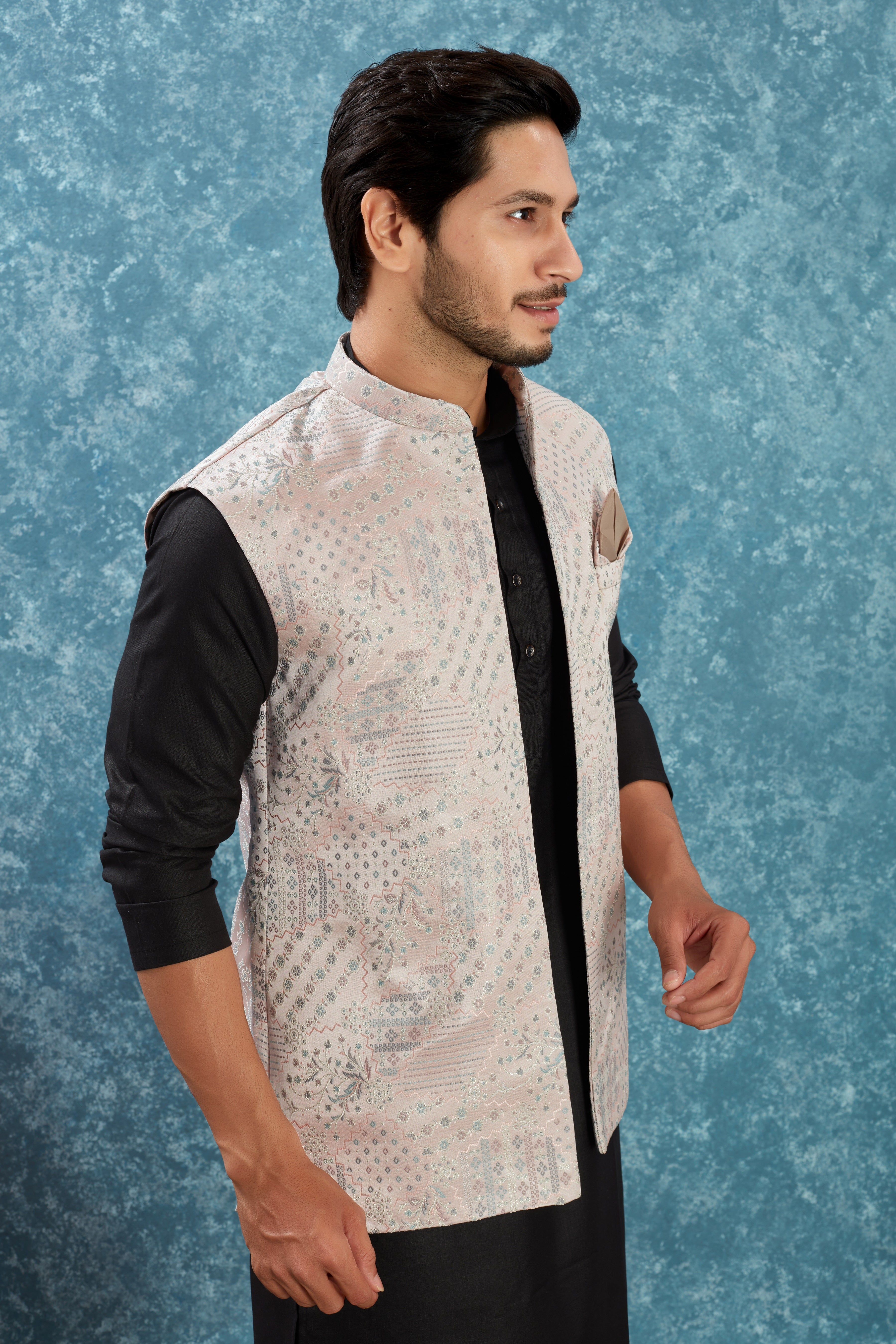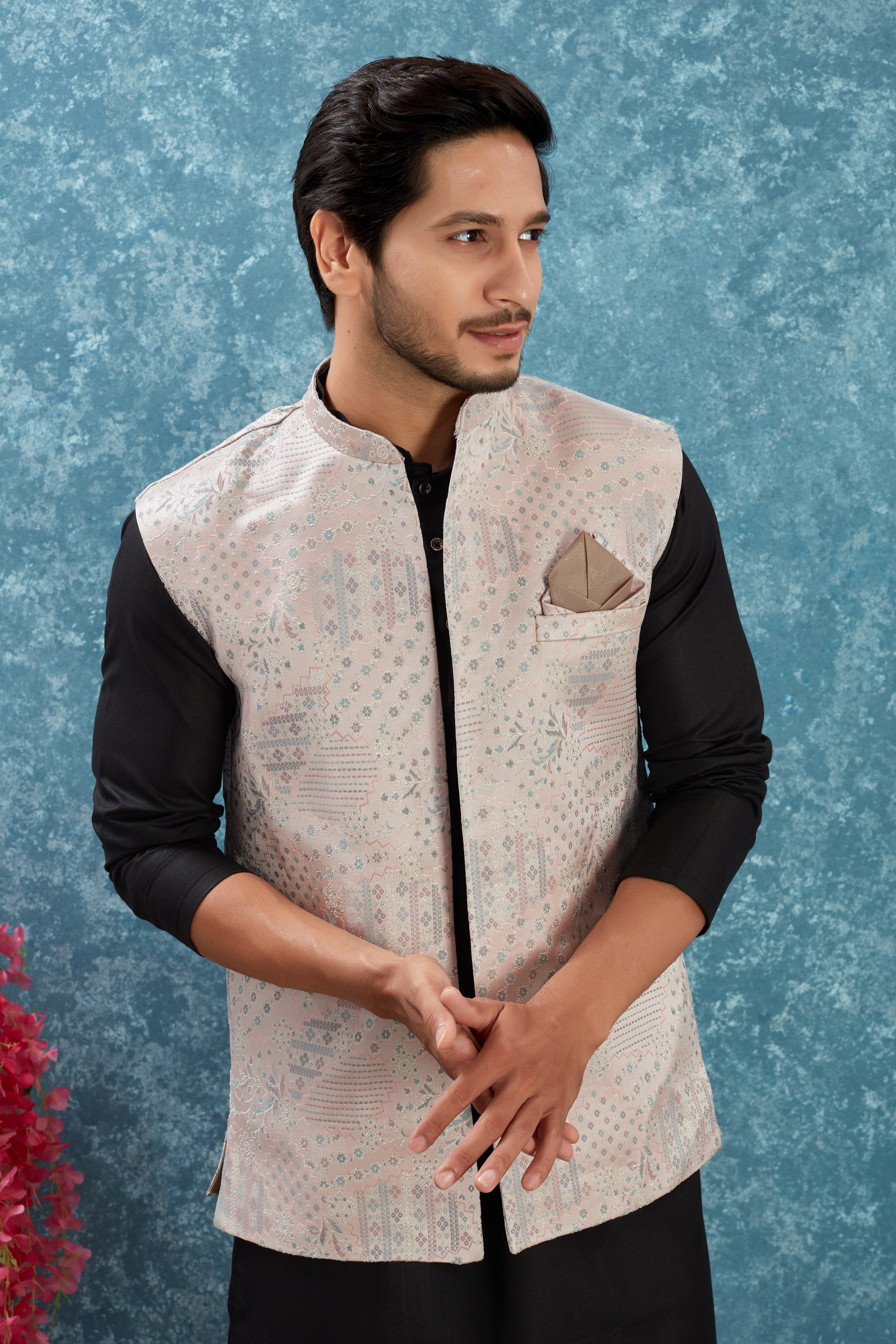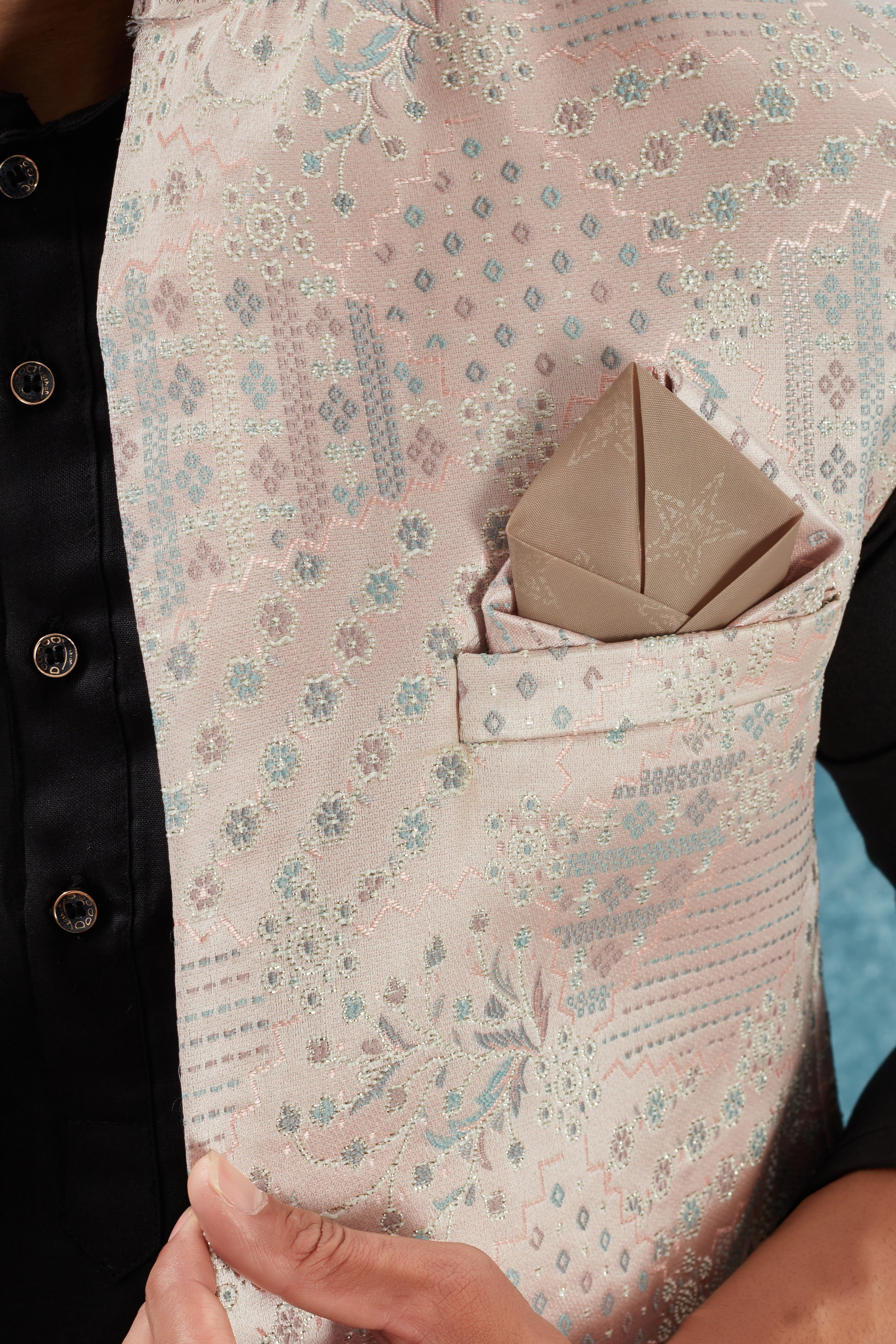 Step into timeless elegance with our Onion Pink Brocade Nehru Jacket paired with a classic Black kurta. This ensemble brings together traditional style and modern sophistication, making it perfect for festive events, weddings, and formal gatherings.